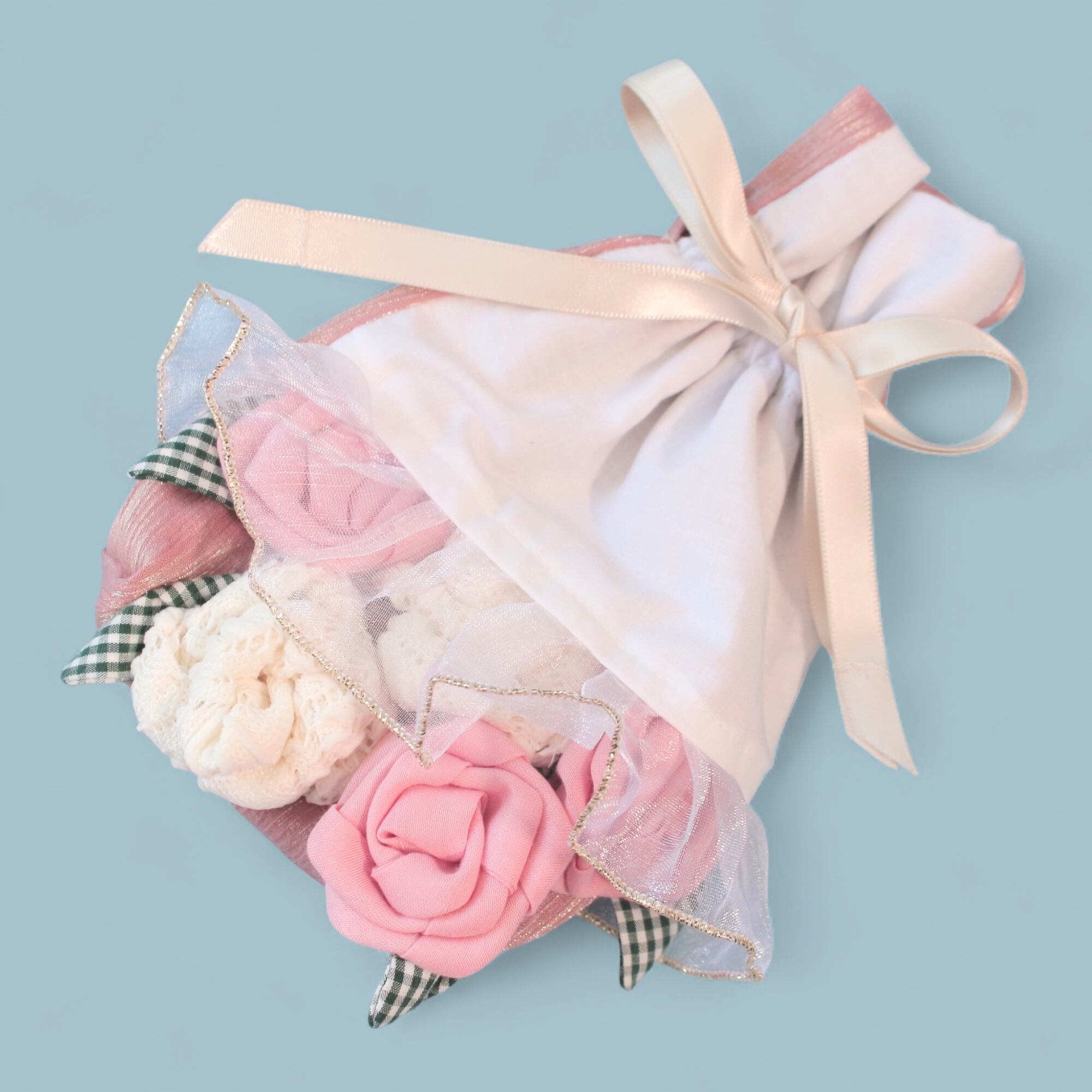 そんなハギレを集めて、世界でたったひとつのバラの花束にしました。