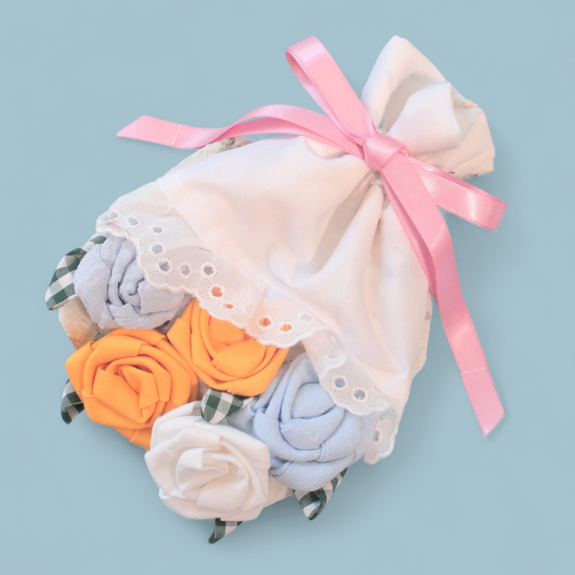 そんなハギレを集めて、世界でたったひとつのバラの花束にしました。