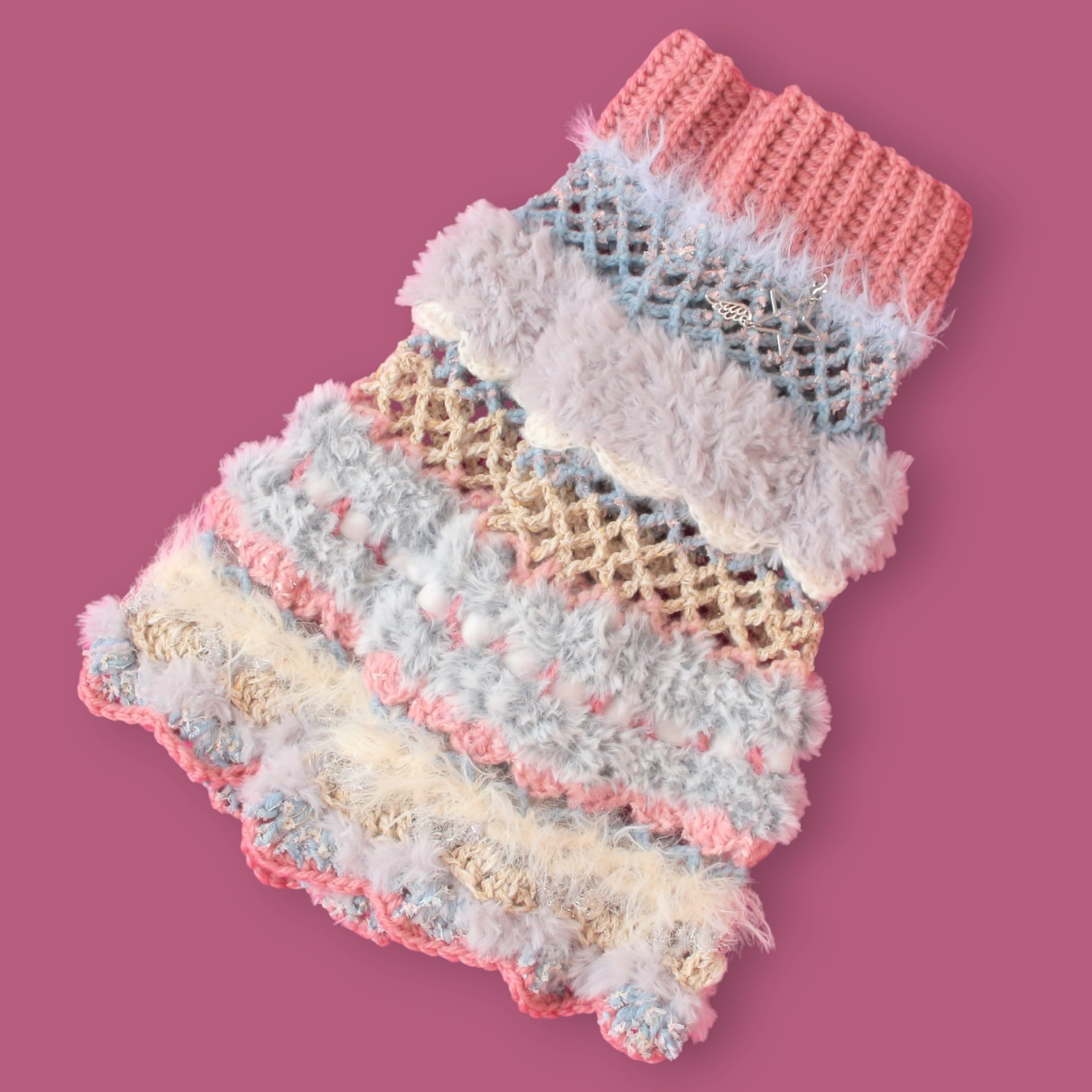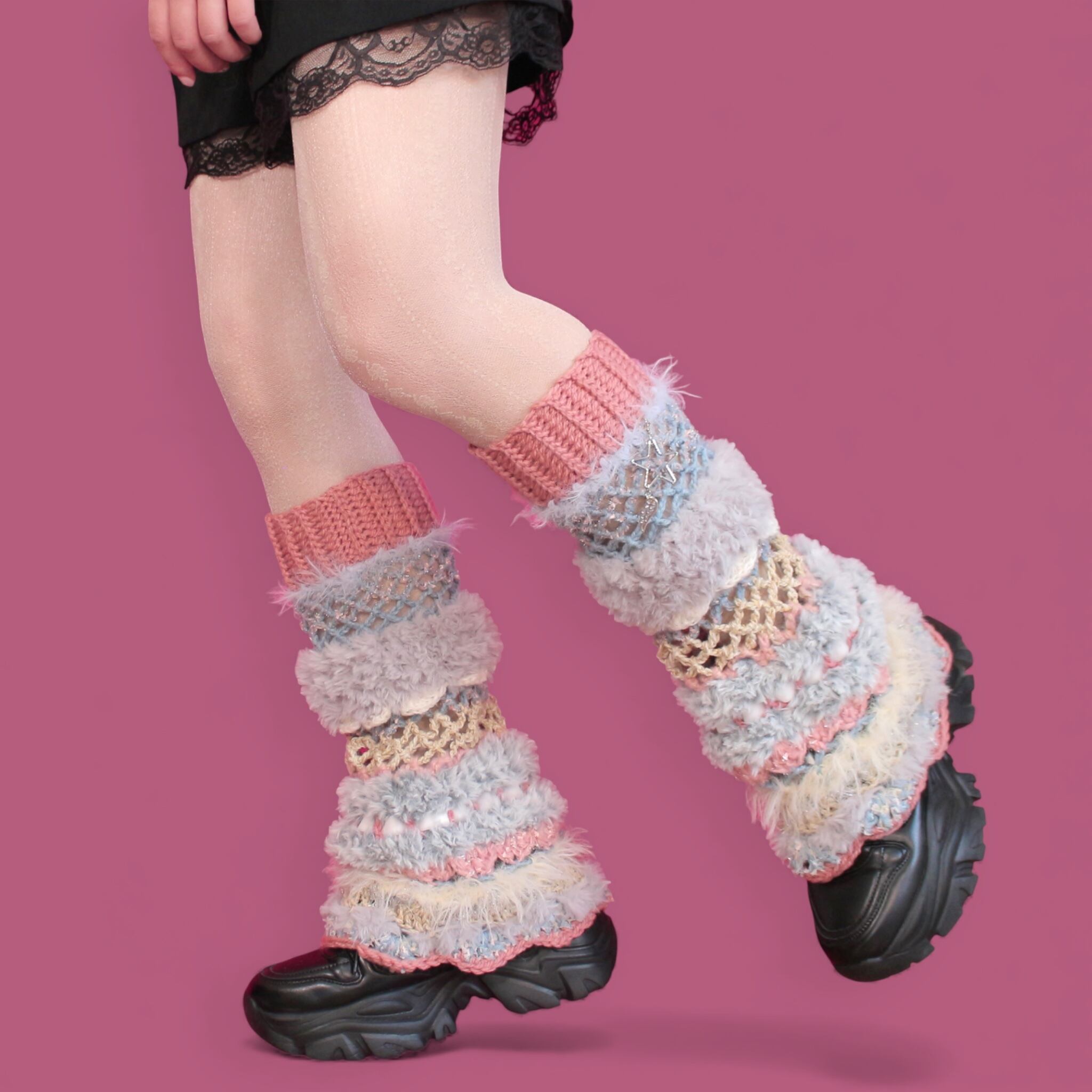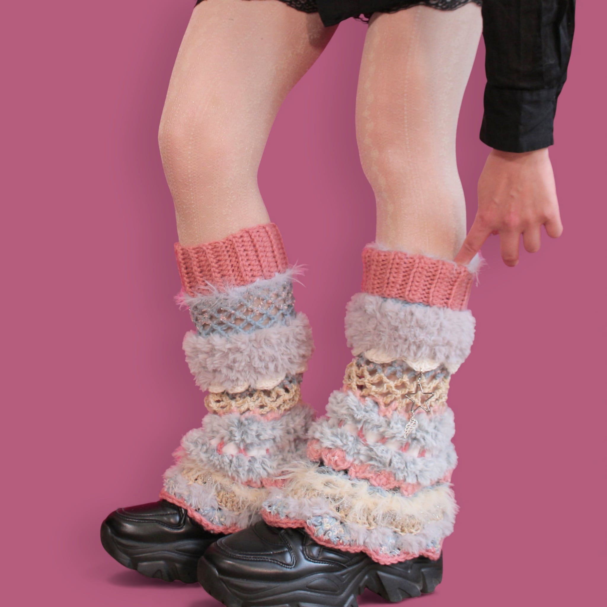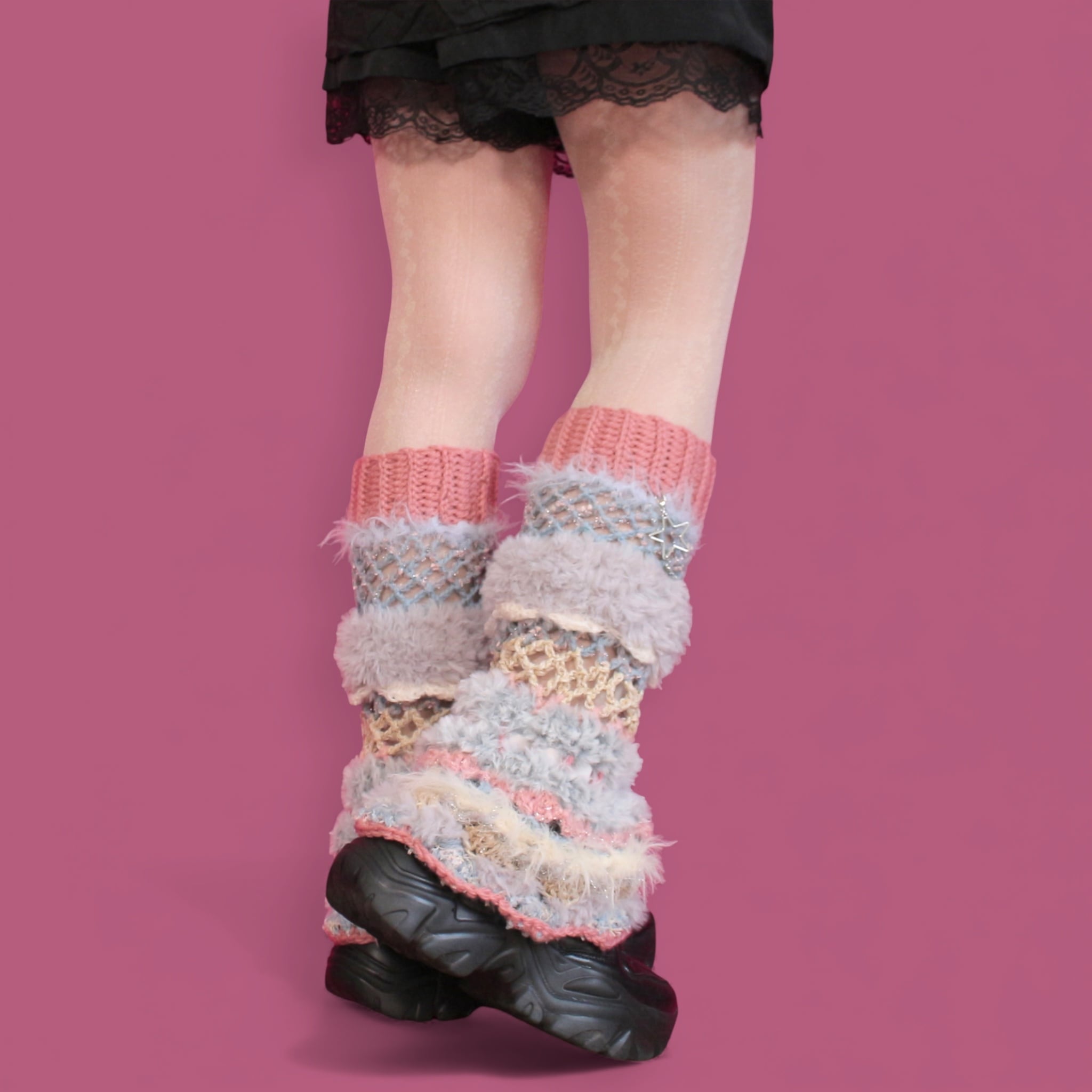 様々な糸を組み合わせたハンドニットのレッグウォーマーです。