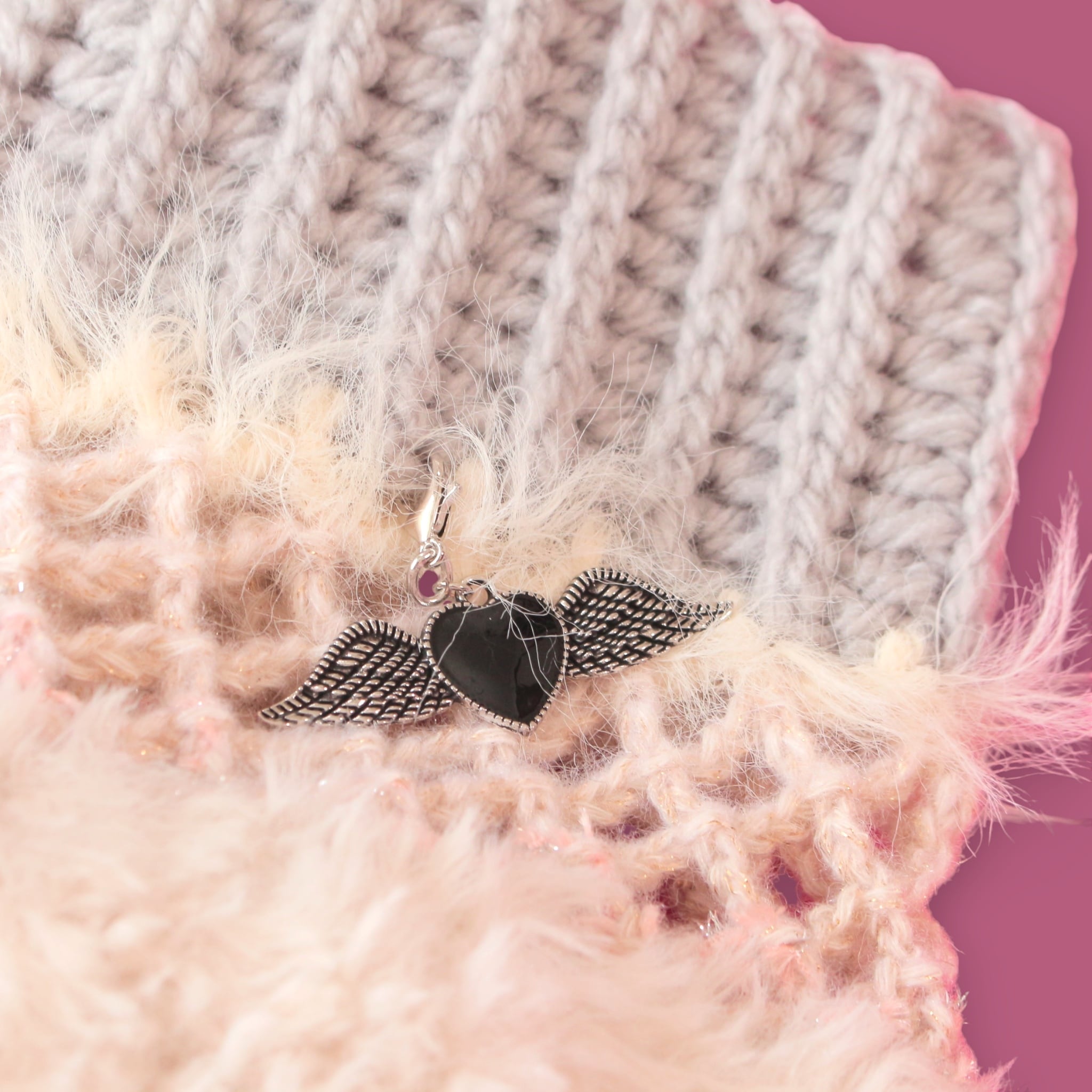 ベロアのリボンがぐるっとついて、全体的に淡くまとまるなか、あえて黒い羽ハートのチャームを合わせました。