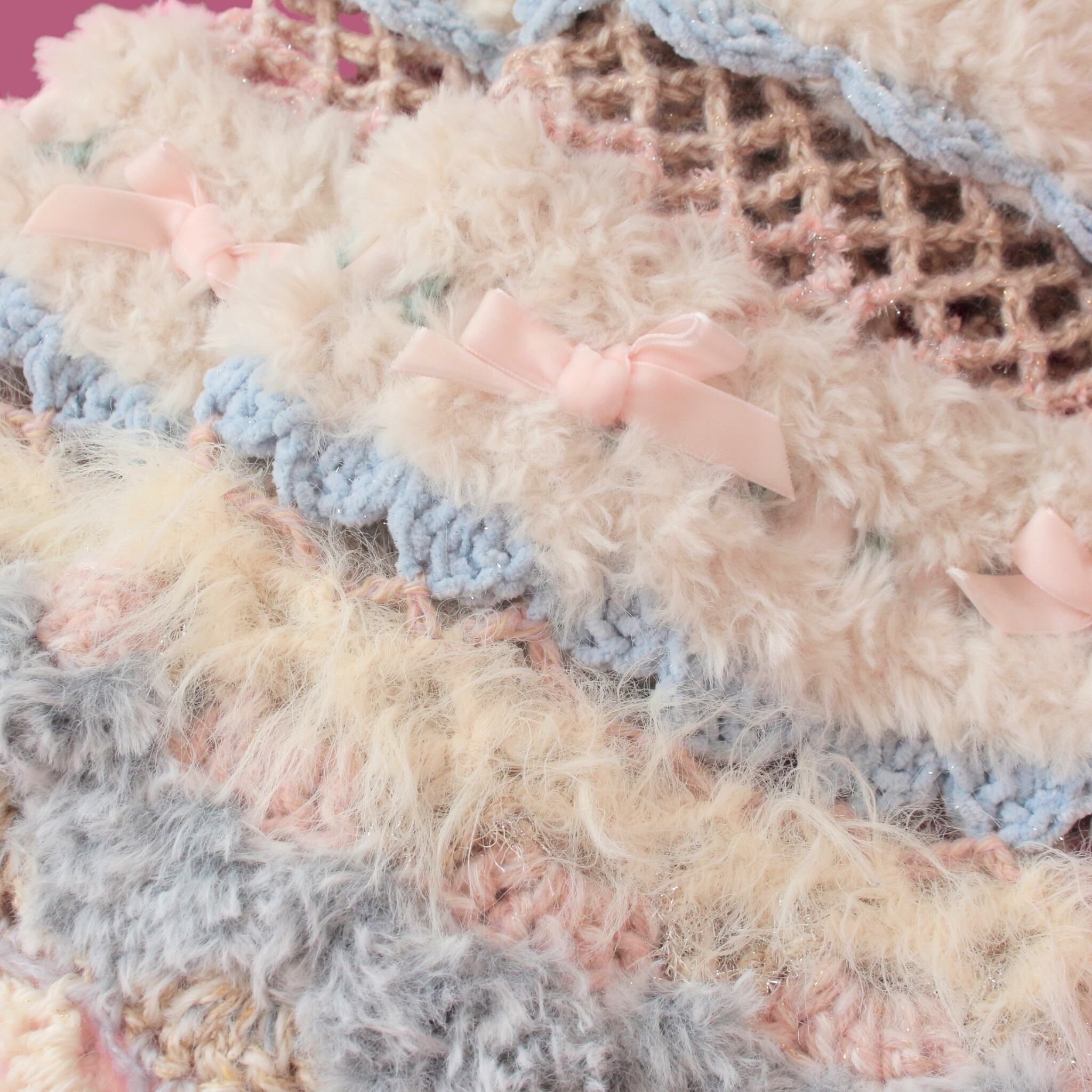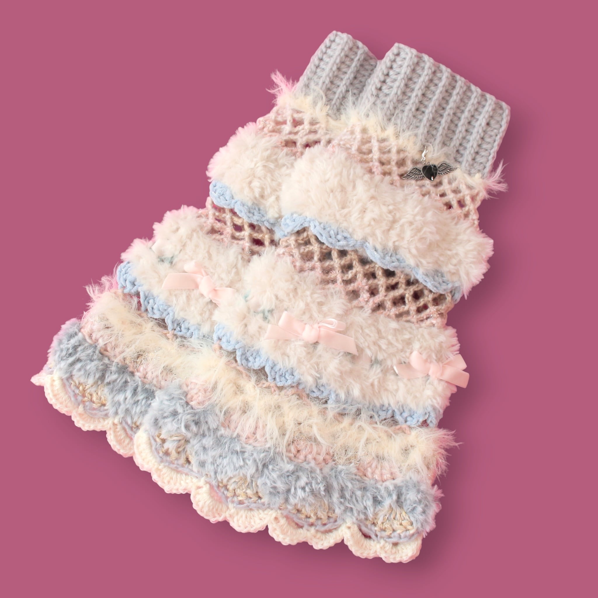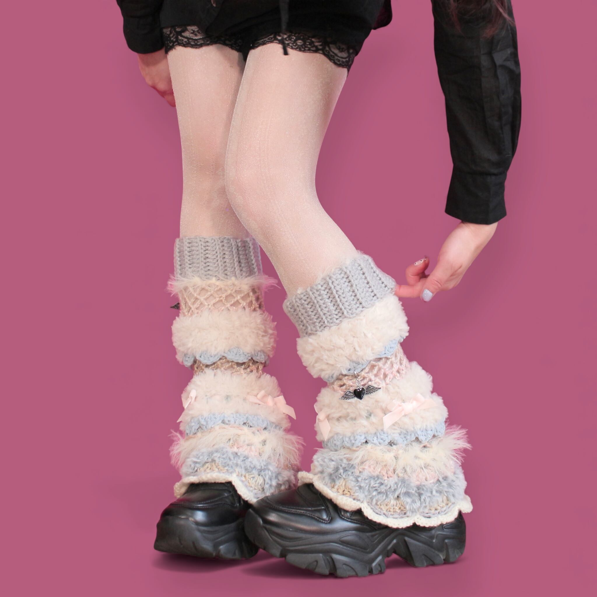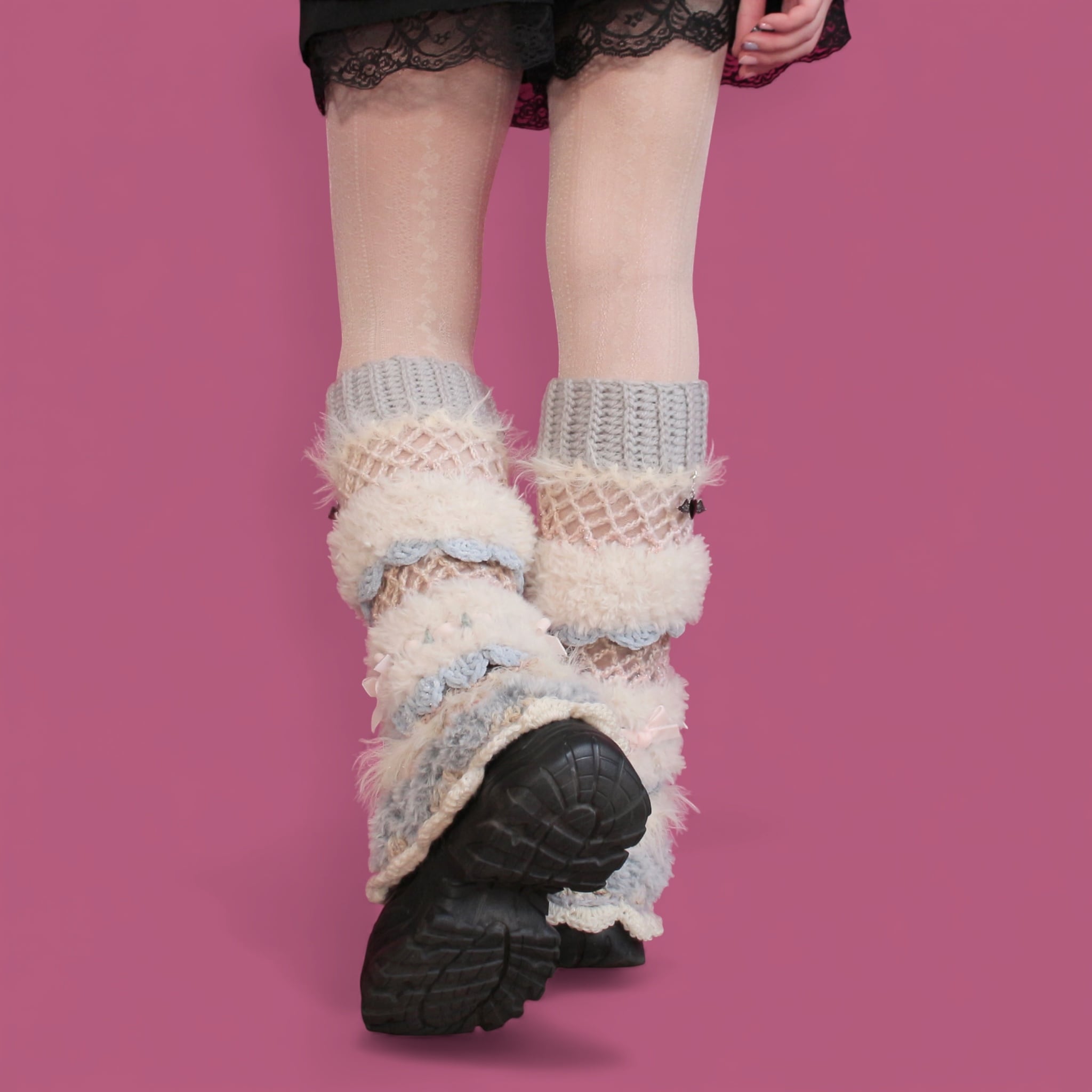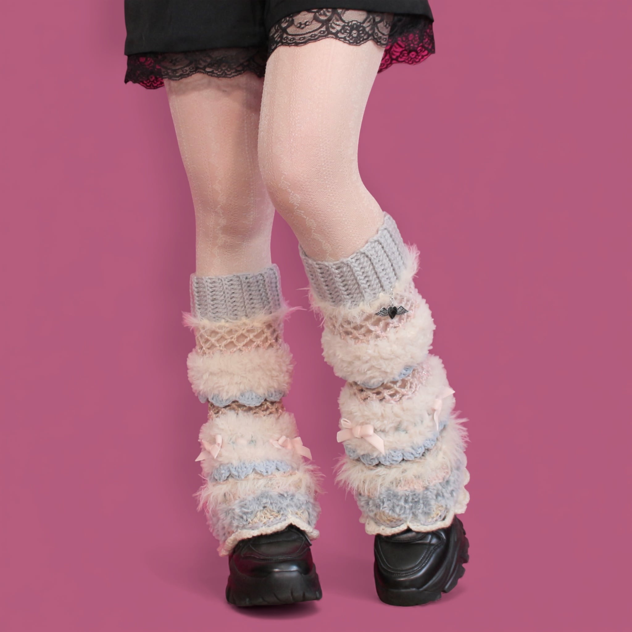 様々な糸を組み合わせたハンドニットのレッグウォーマーです。