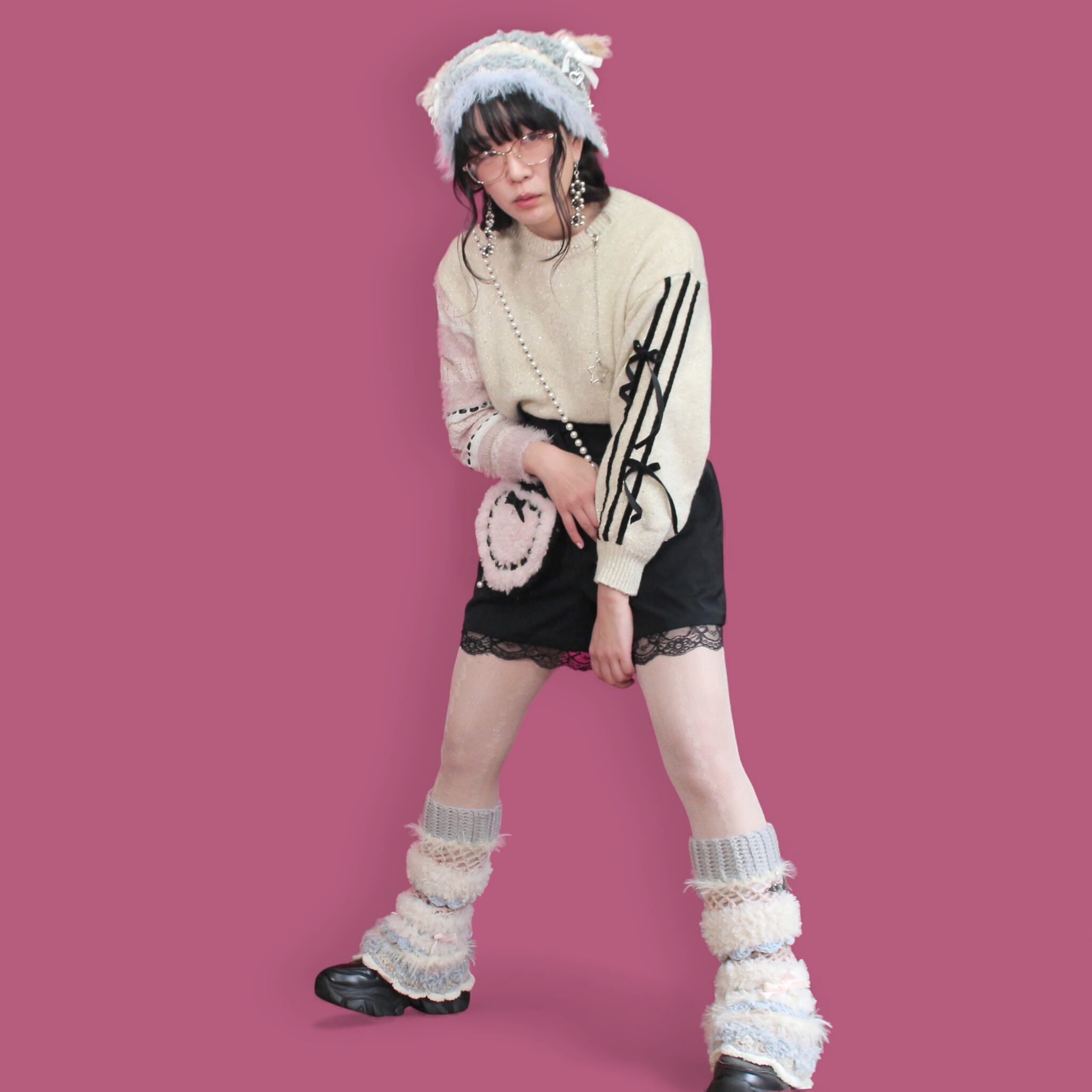 今季は平成パンクロックのテイストを全体に散りばめており、こちらは当時の白黒のボーダーソックスや編みタイツから着想を得て、令和のスタイルへと昇華させたデザインです。