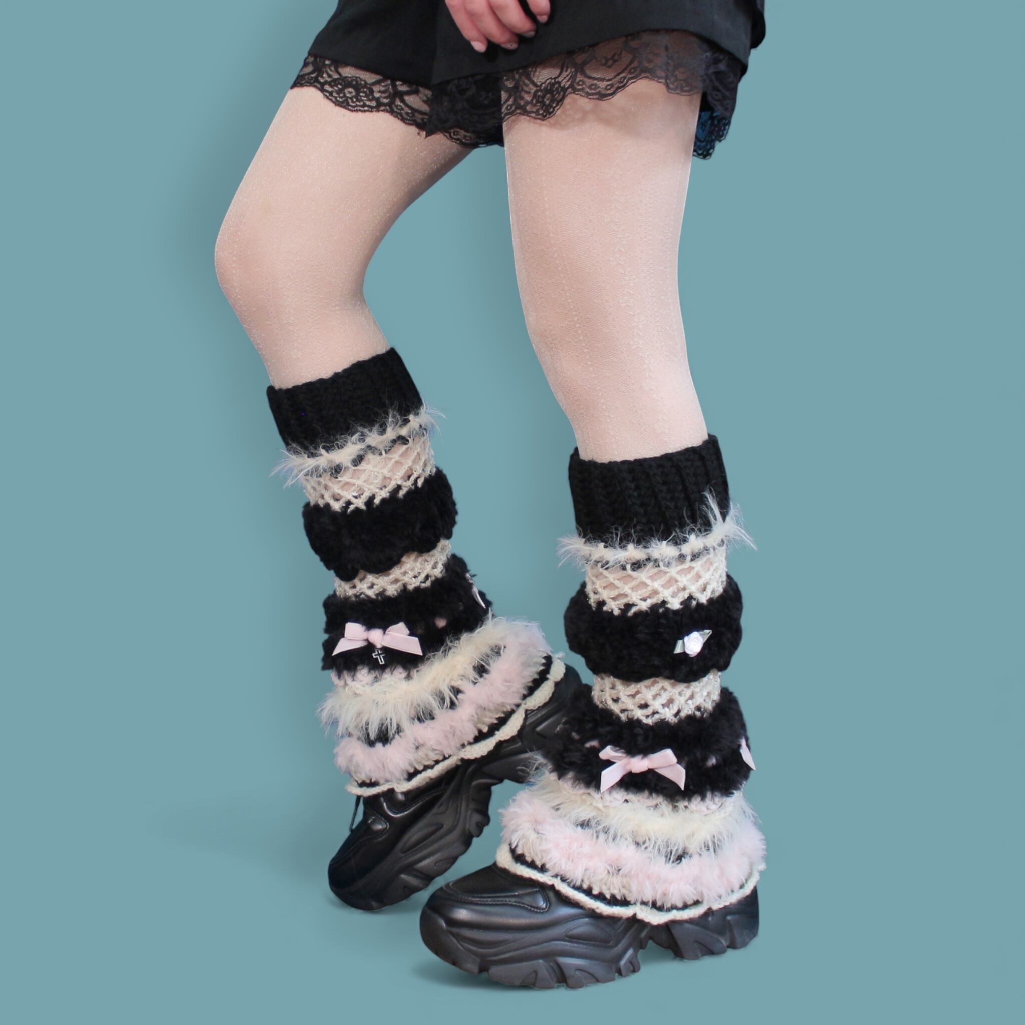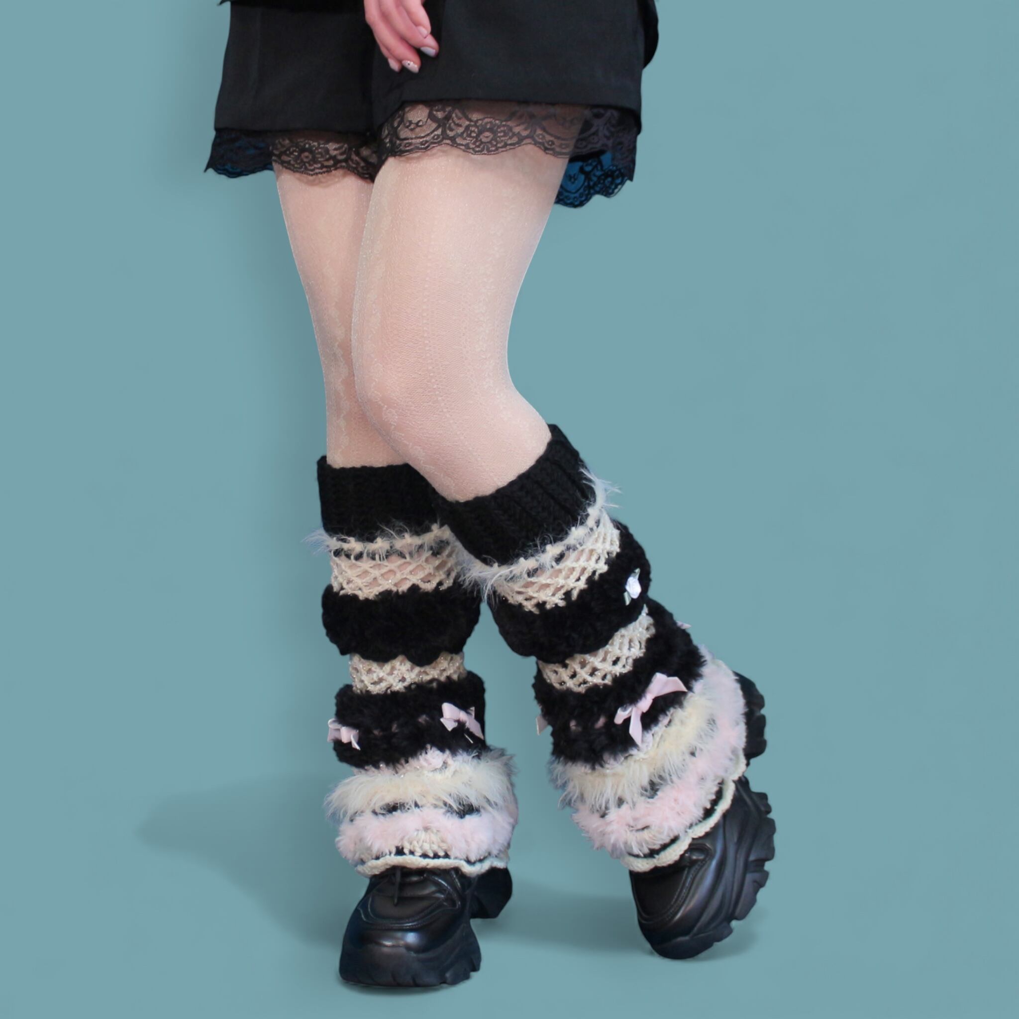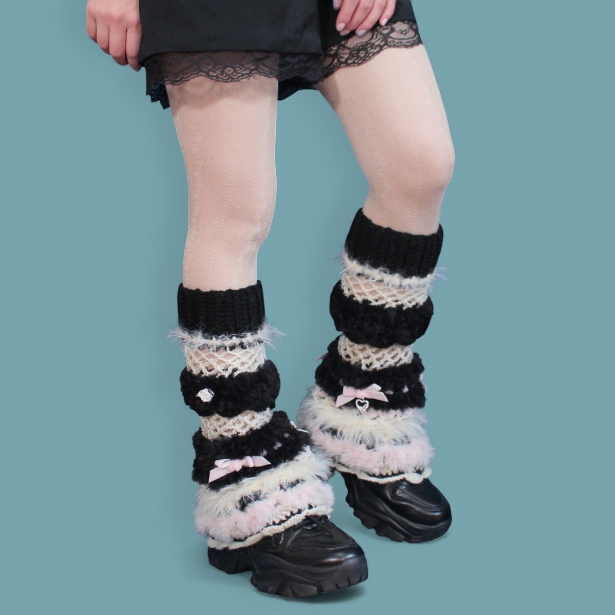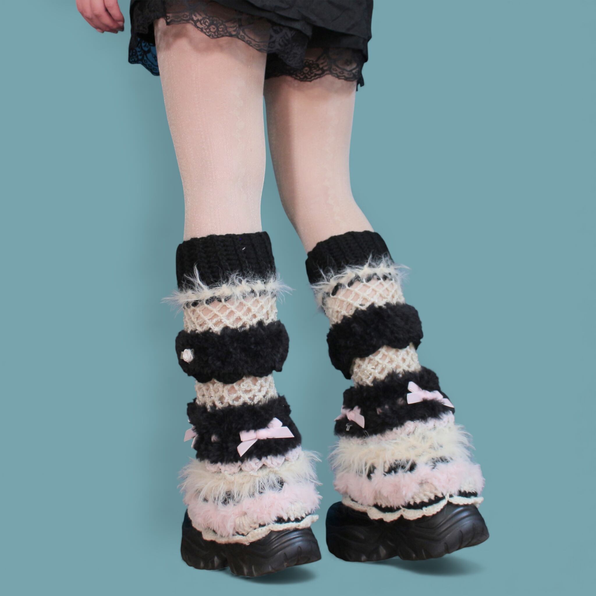 今季は平成パンクロックのテイストを全体に散りばめており、こちらは当時の白黒のボーダーソックスや編みタイツから着想を得て、令和のスタイルへと昇華させたデザインです。