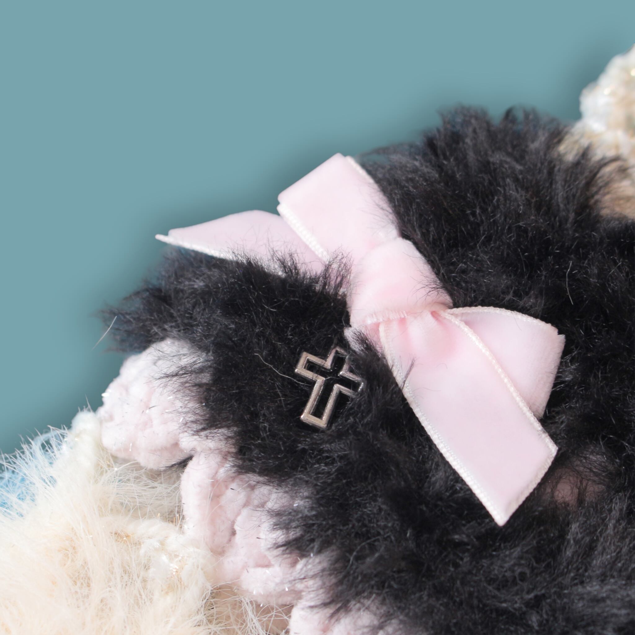 ベロアのリボンがぐるっとついて、スワロのハートや銀色のクロスが煌めきます。