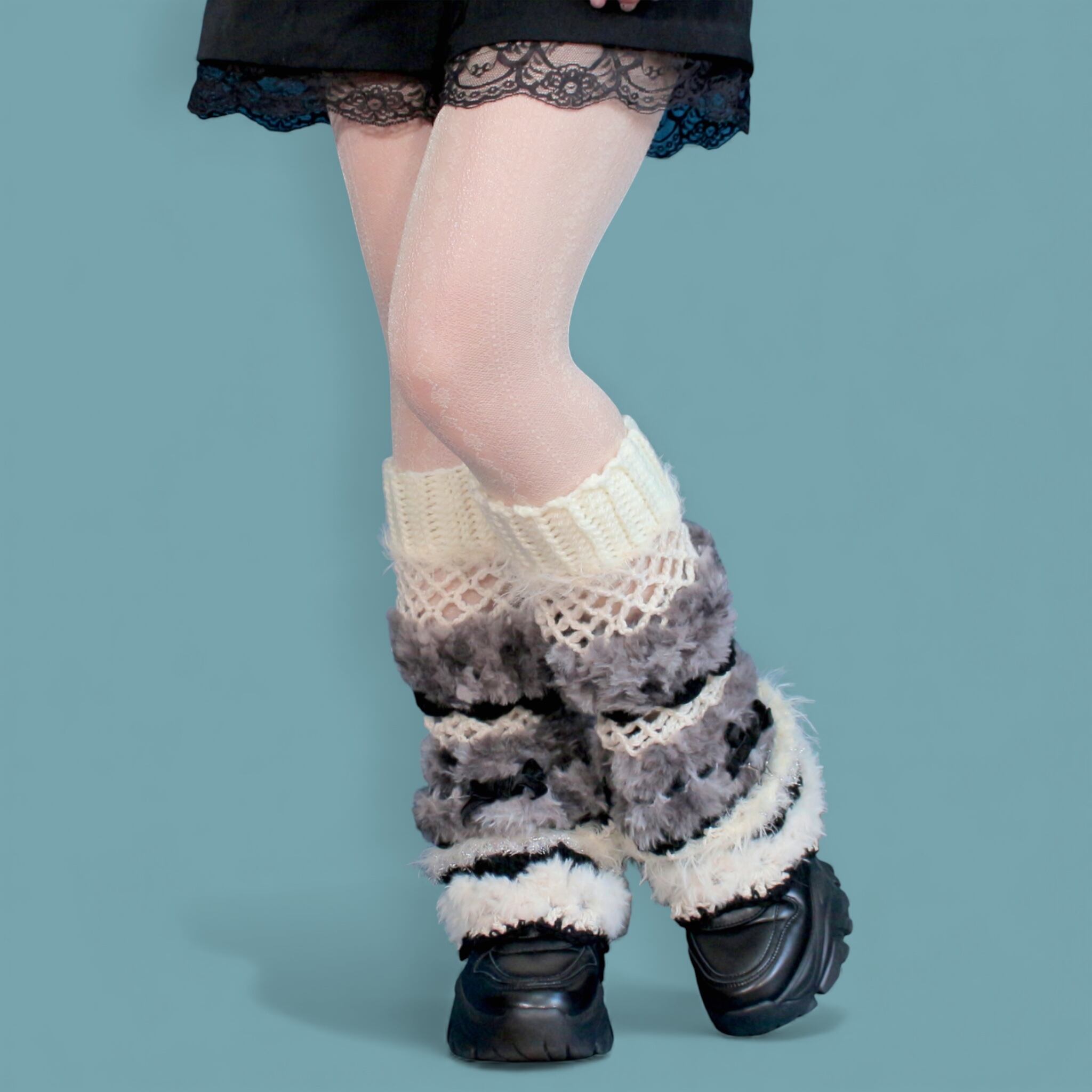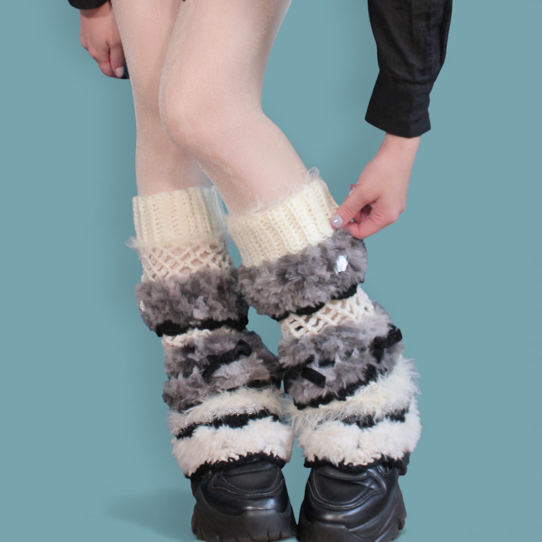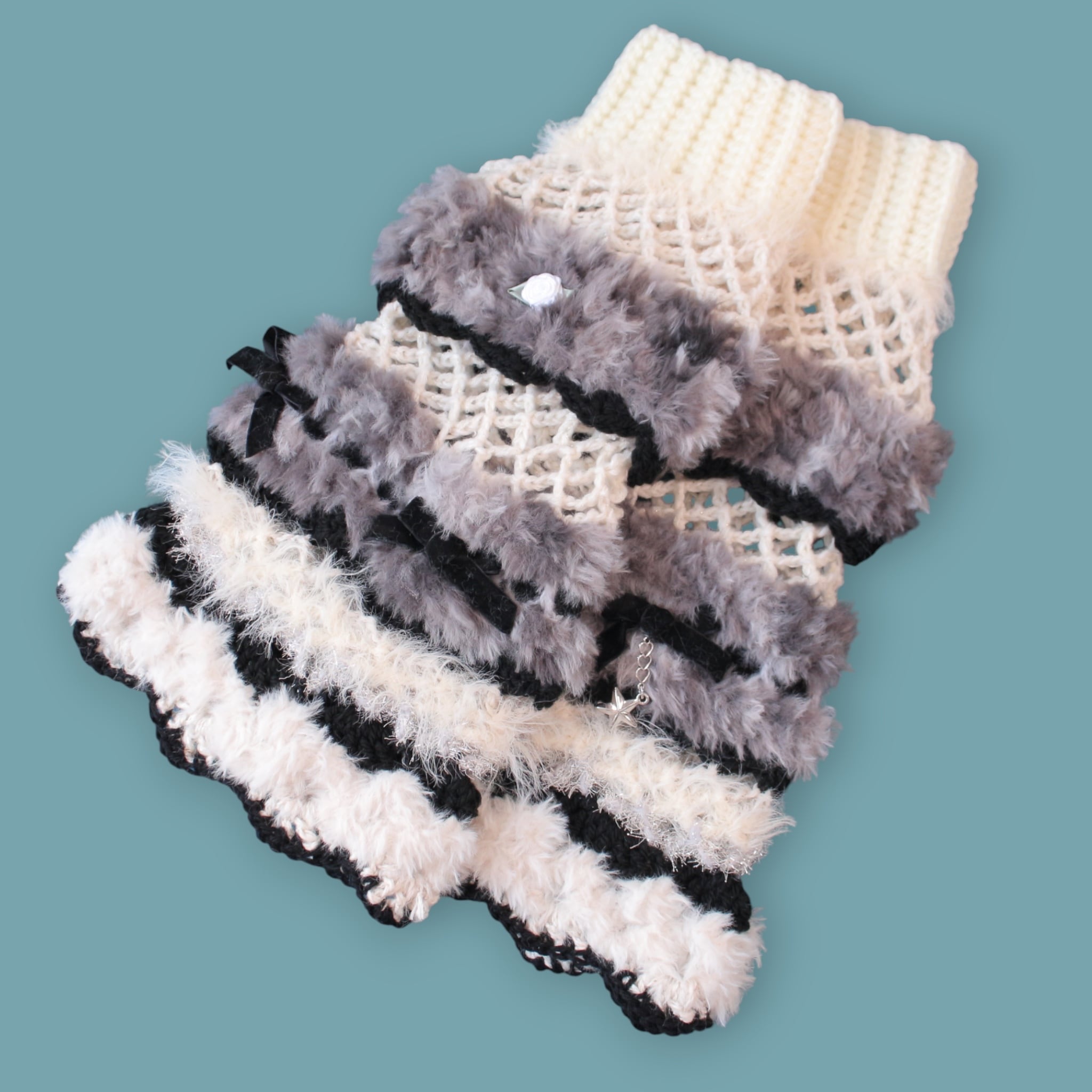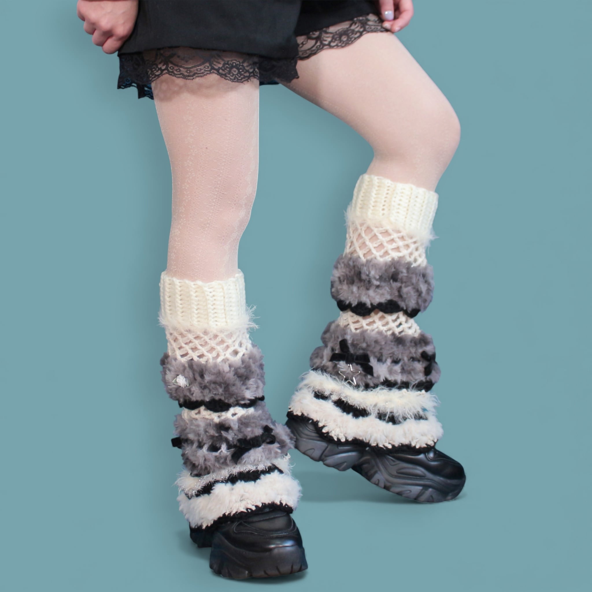 様々な糸を組み合わせたハンドニットのレッグウォーマーです。