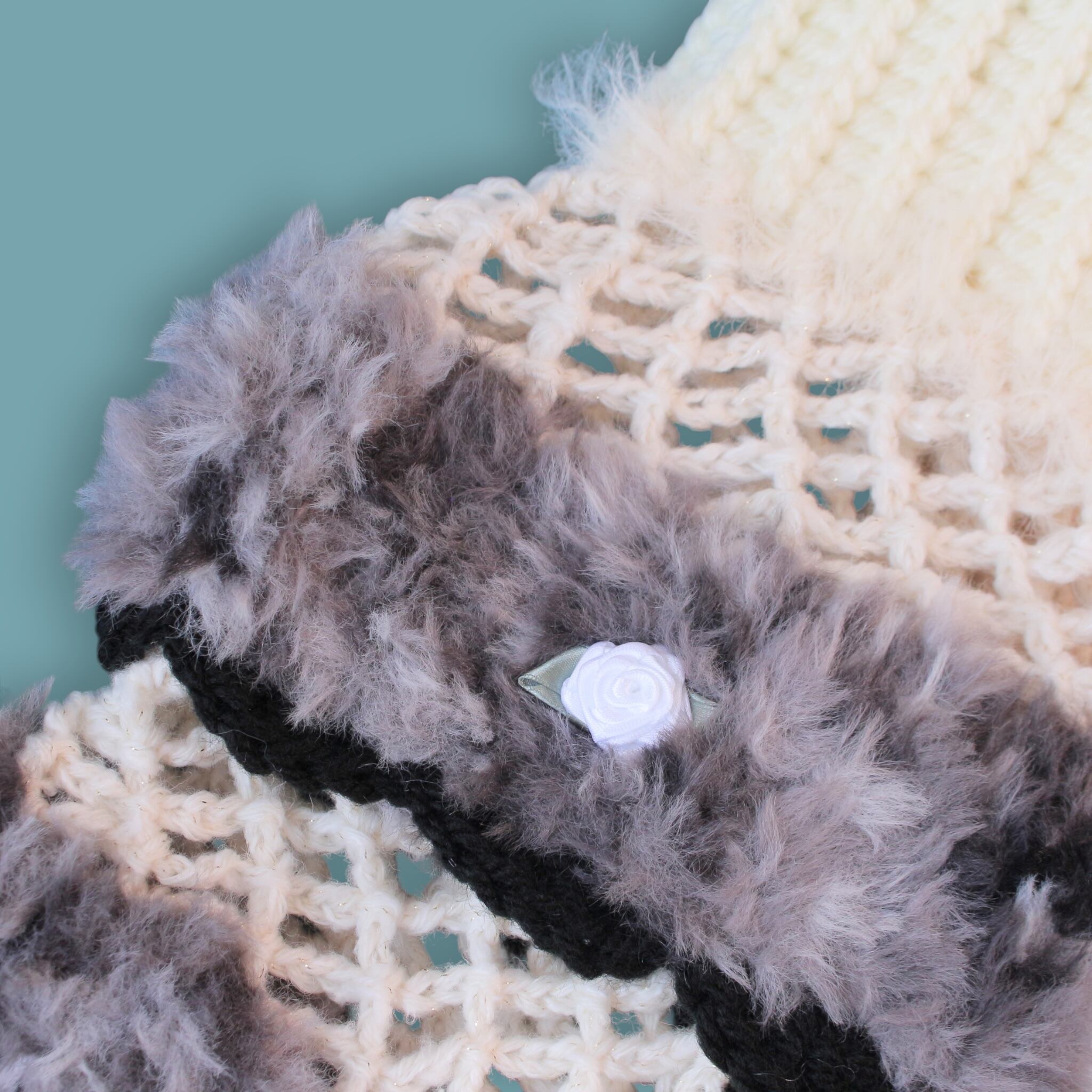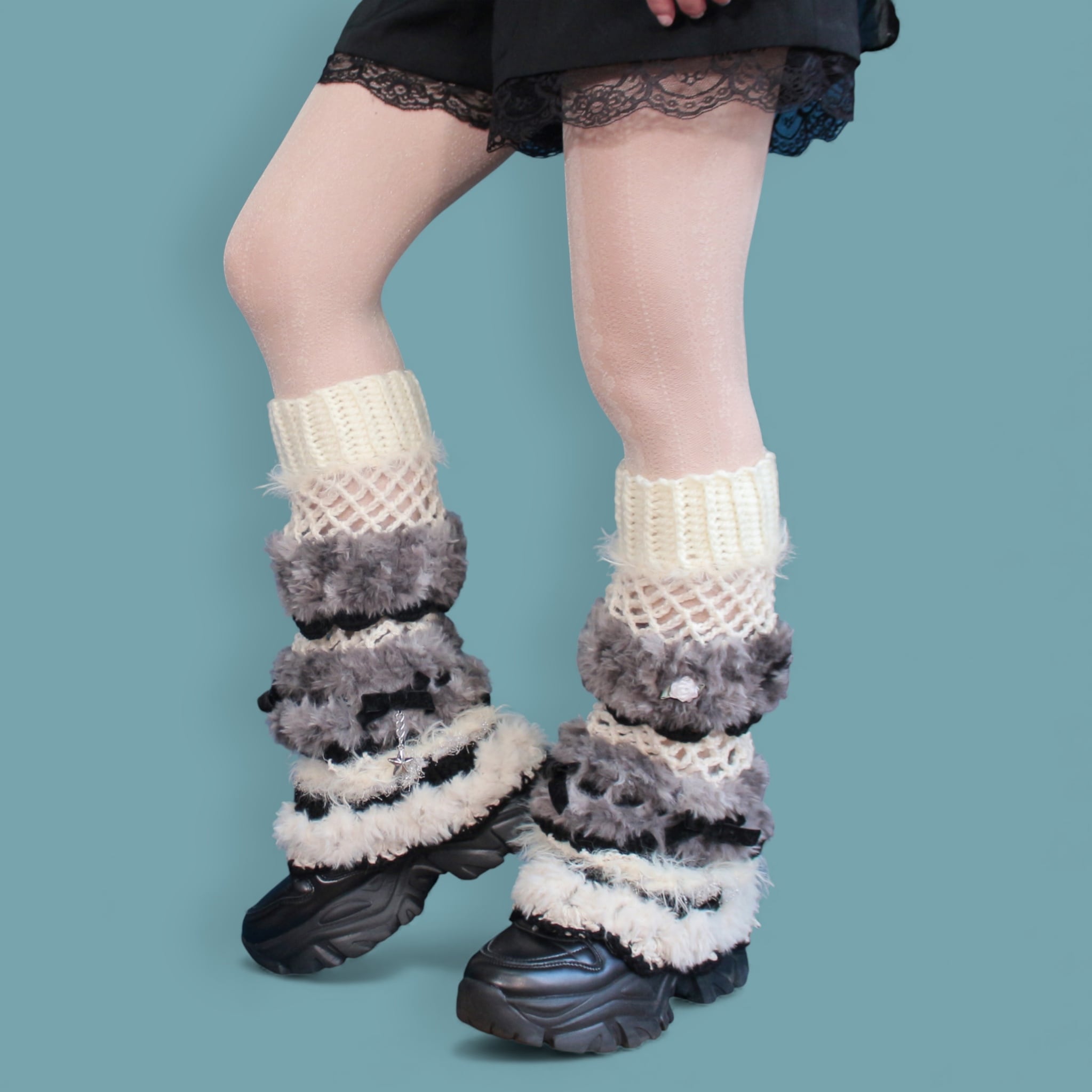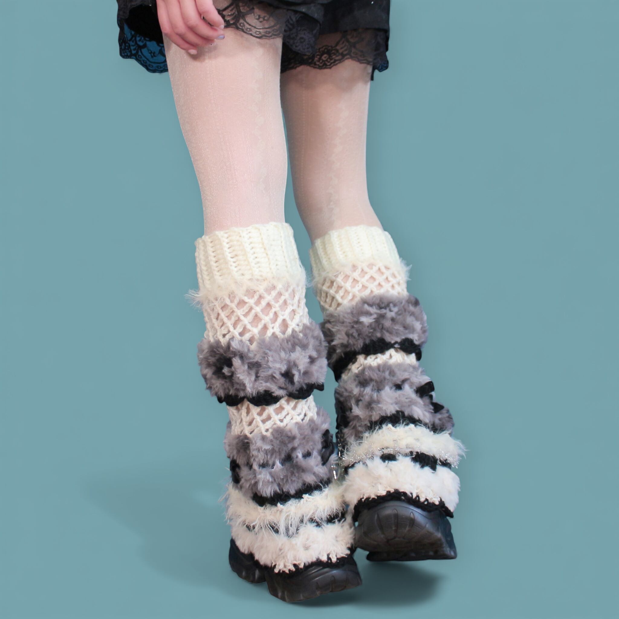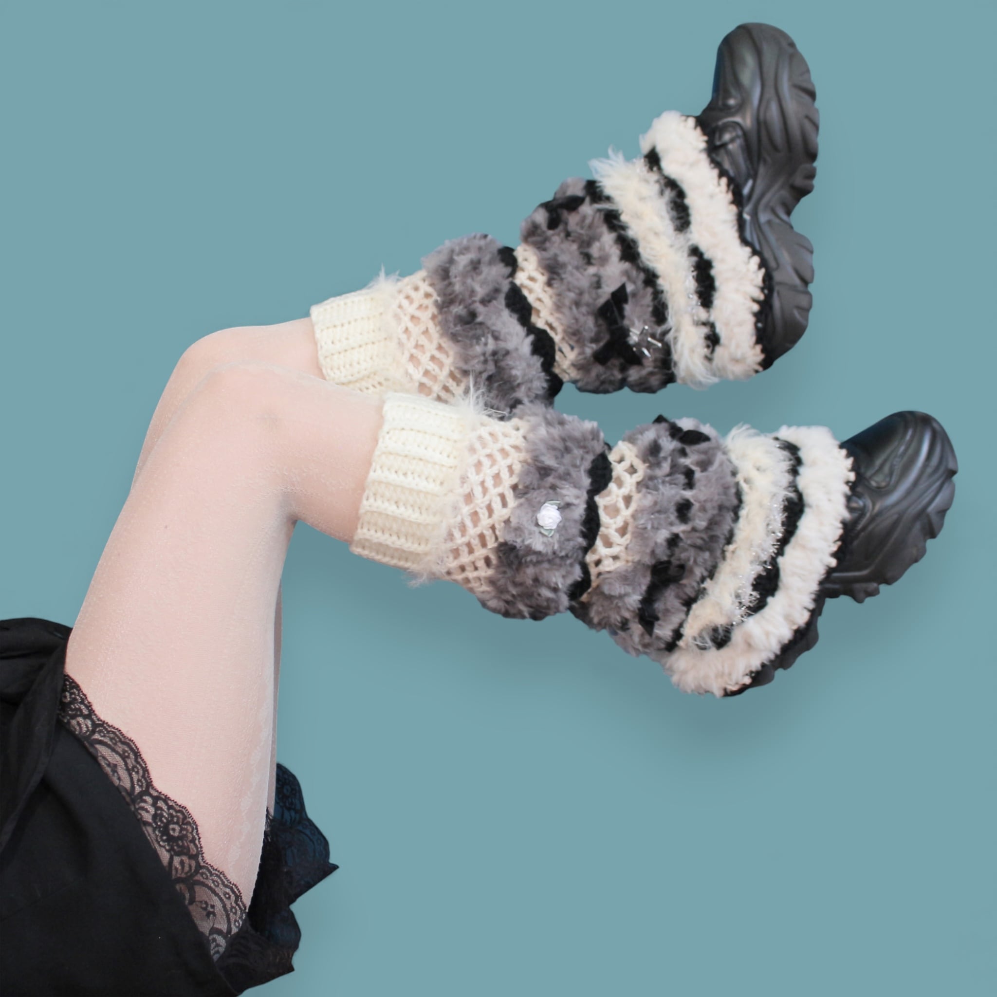 様々な糸を組み合わせたハンドニットのレッグウォーマーです。