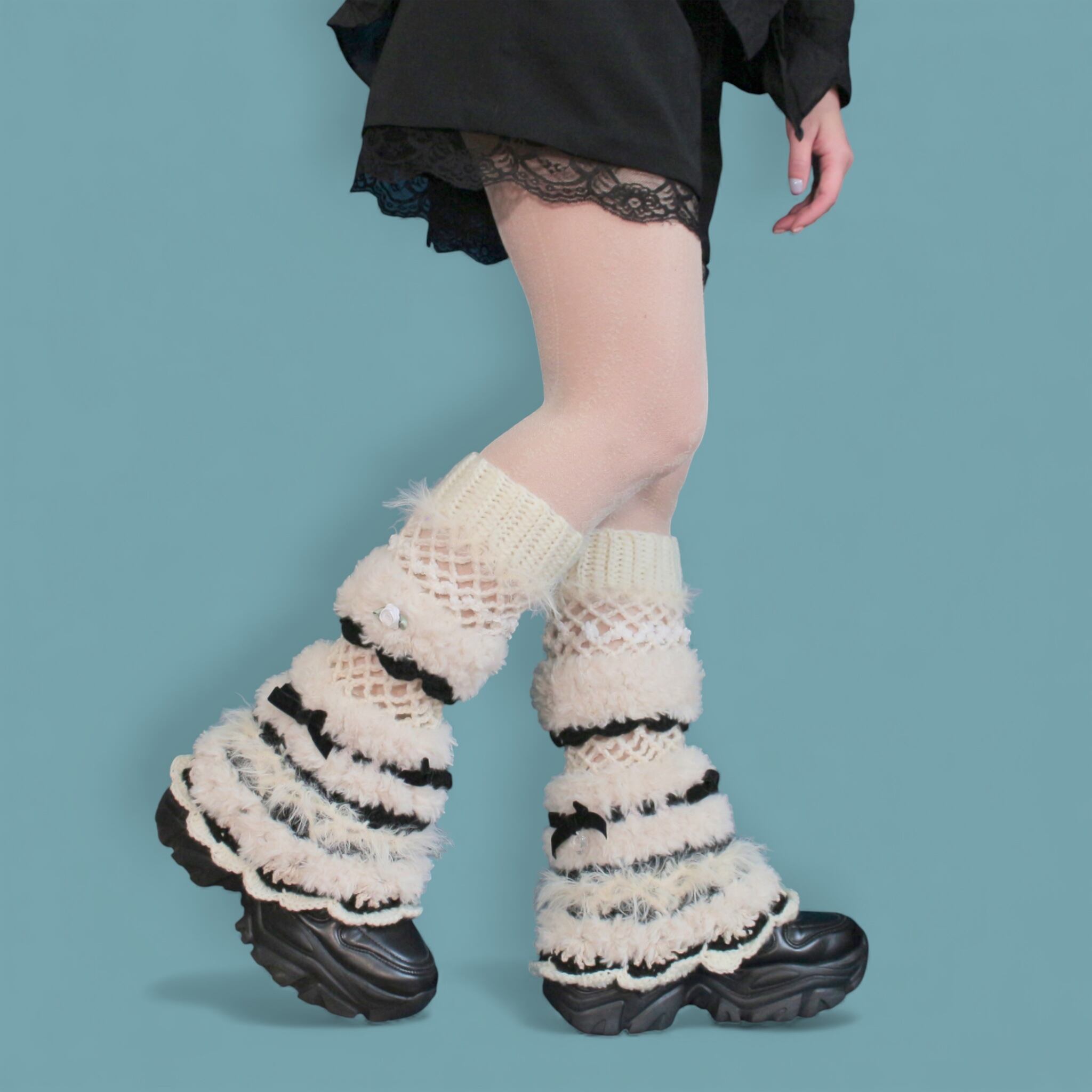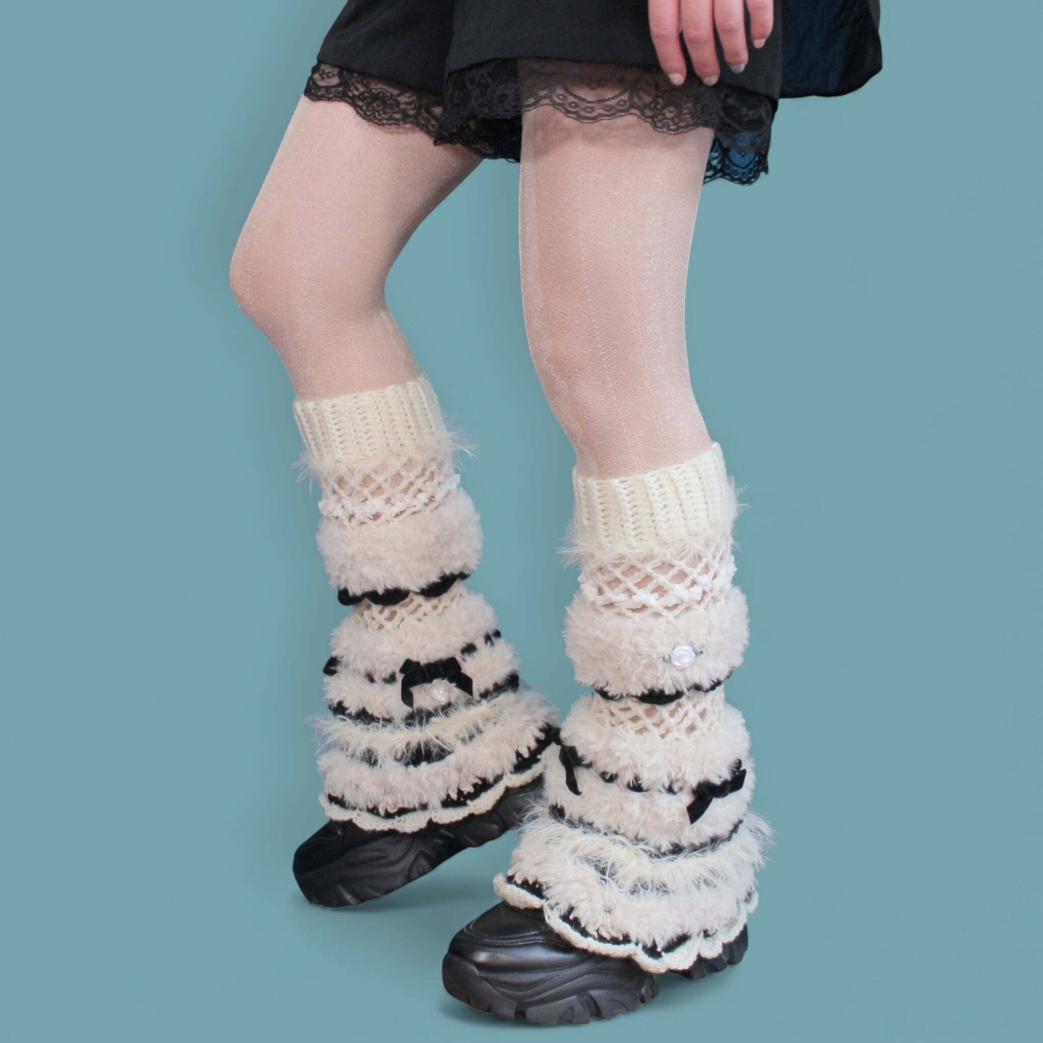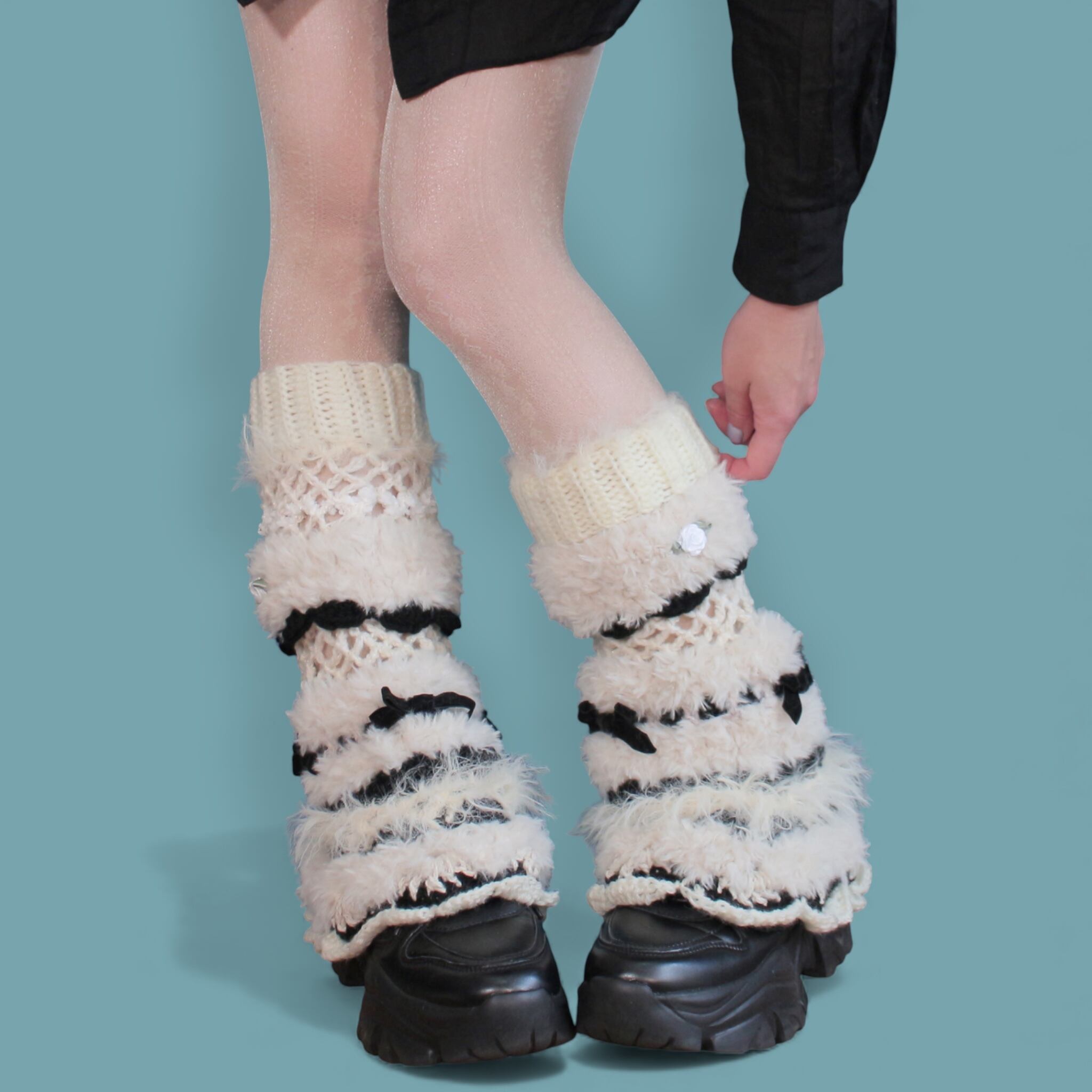 様々な糸を組み合わせたハンドニットのレッグウォーマーです。