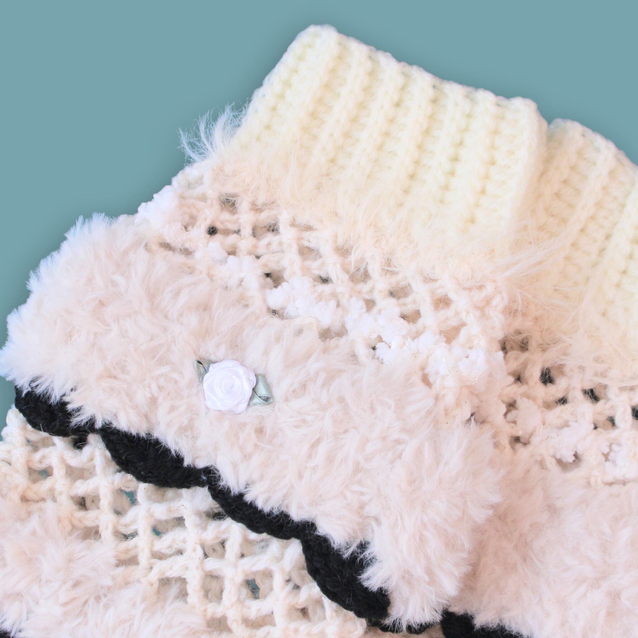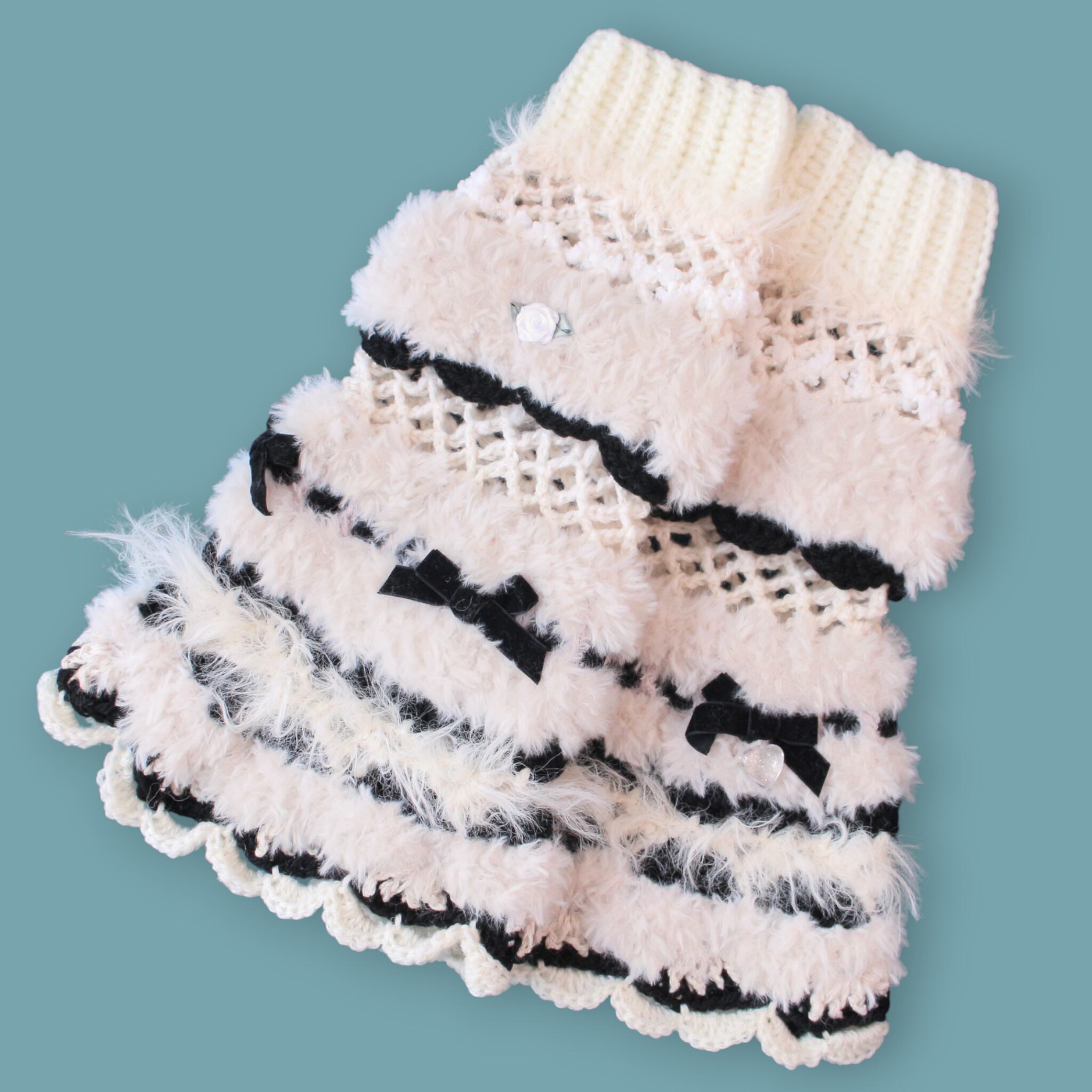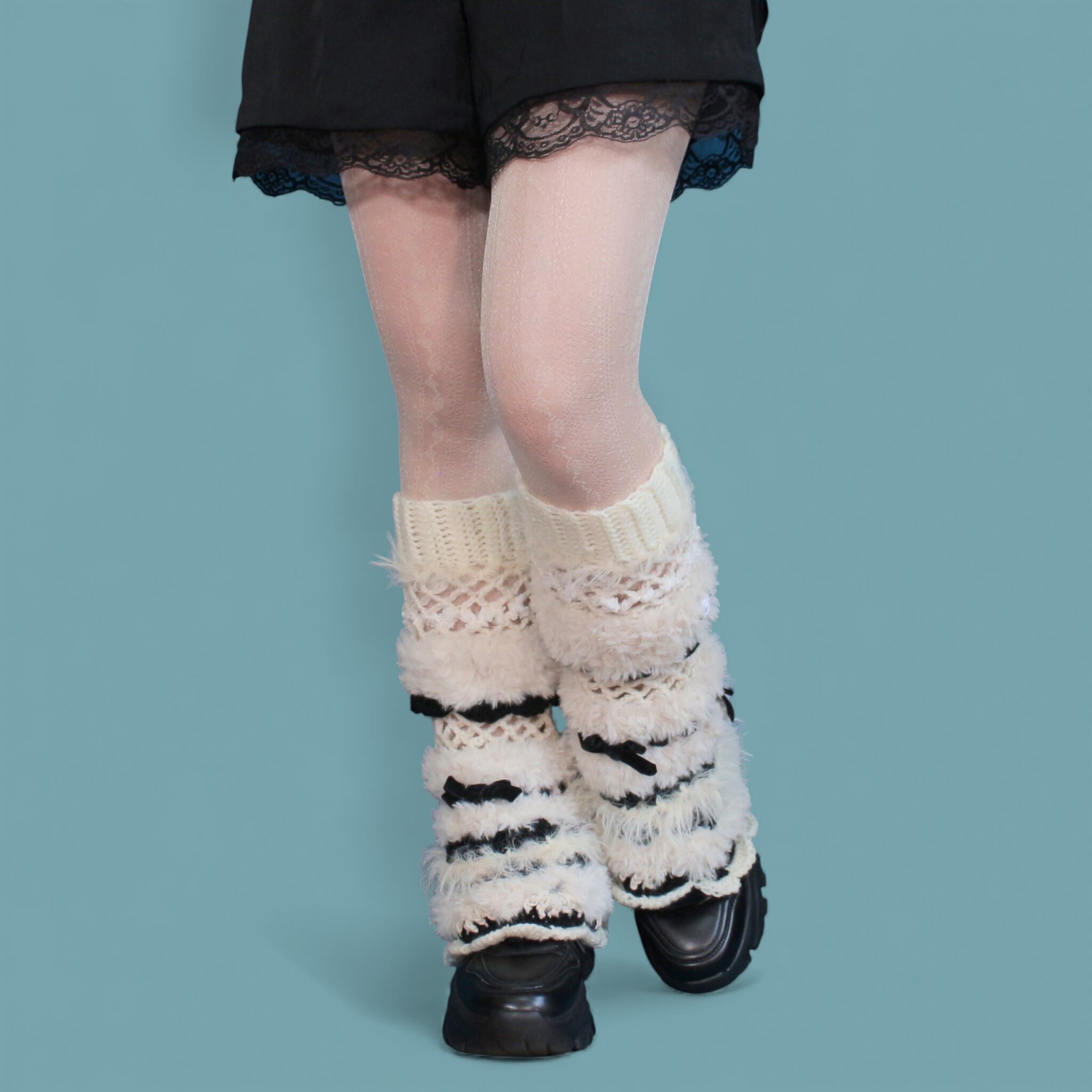 様々な糸を組み合わせたハンドニットのレッグウォーマーです。