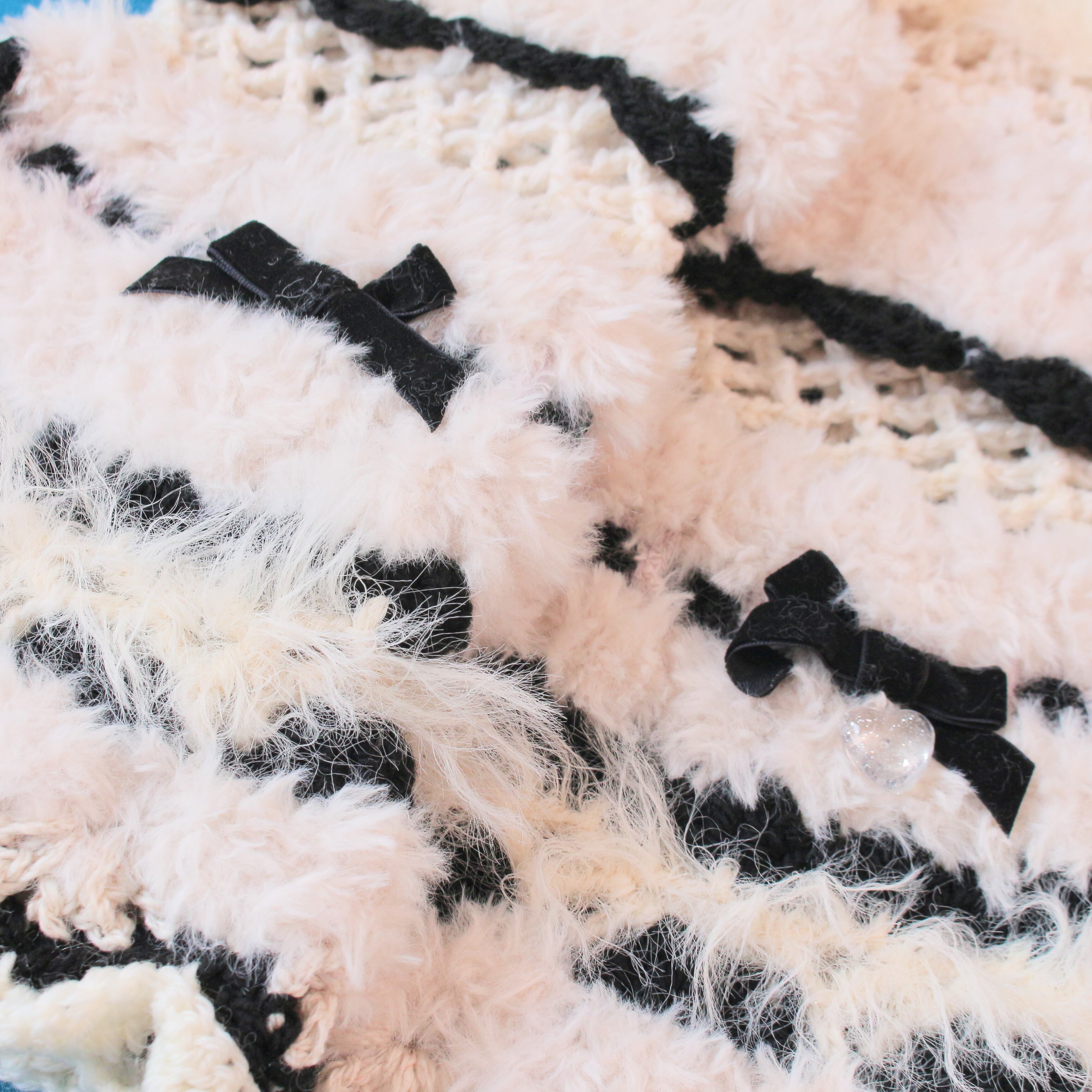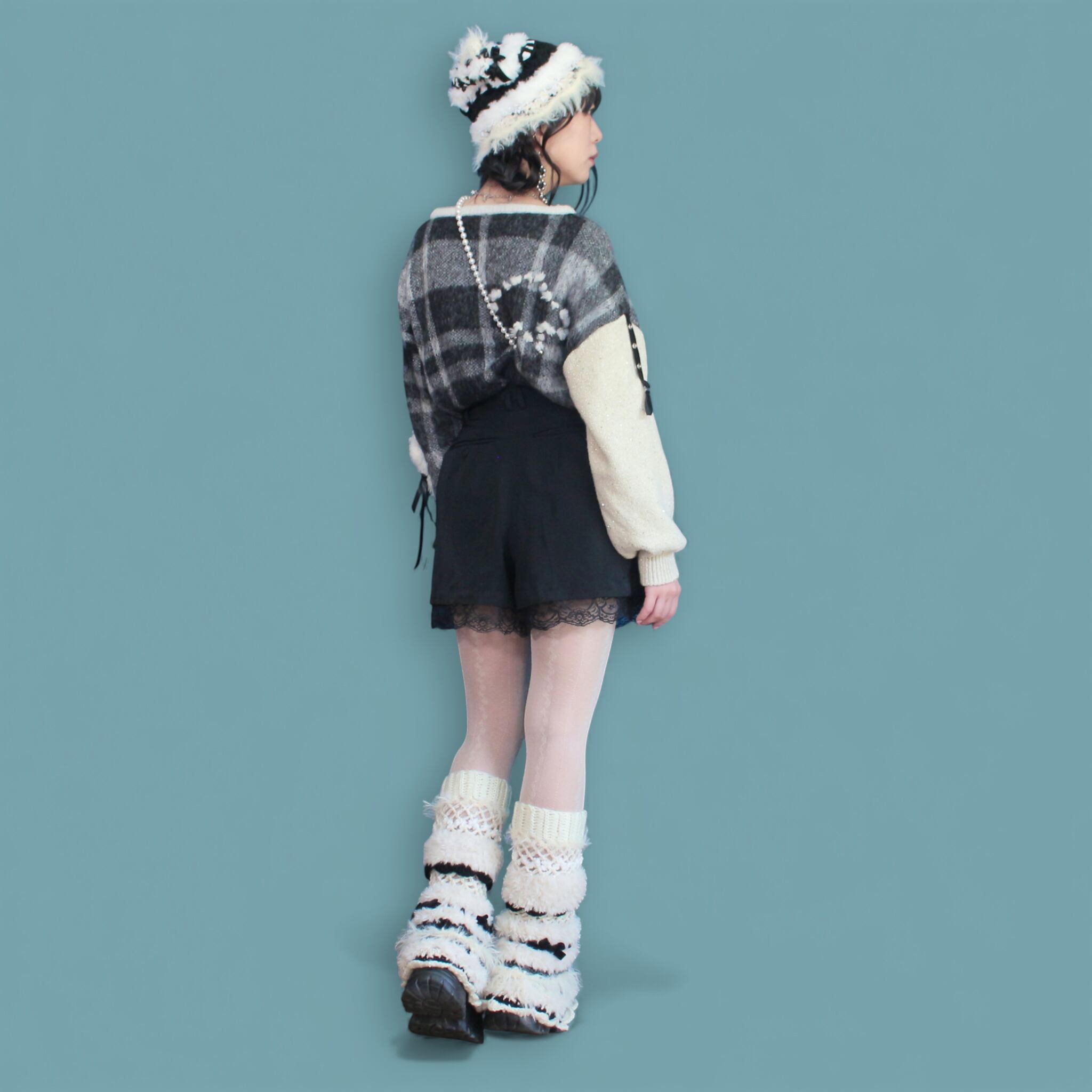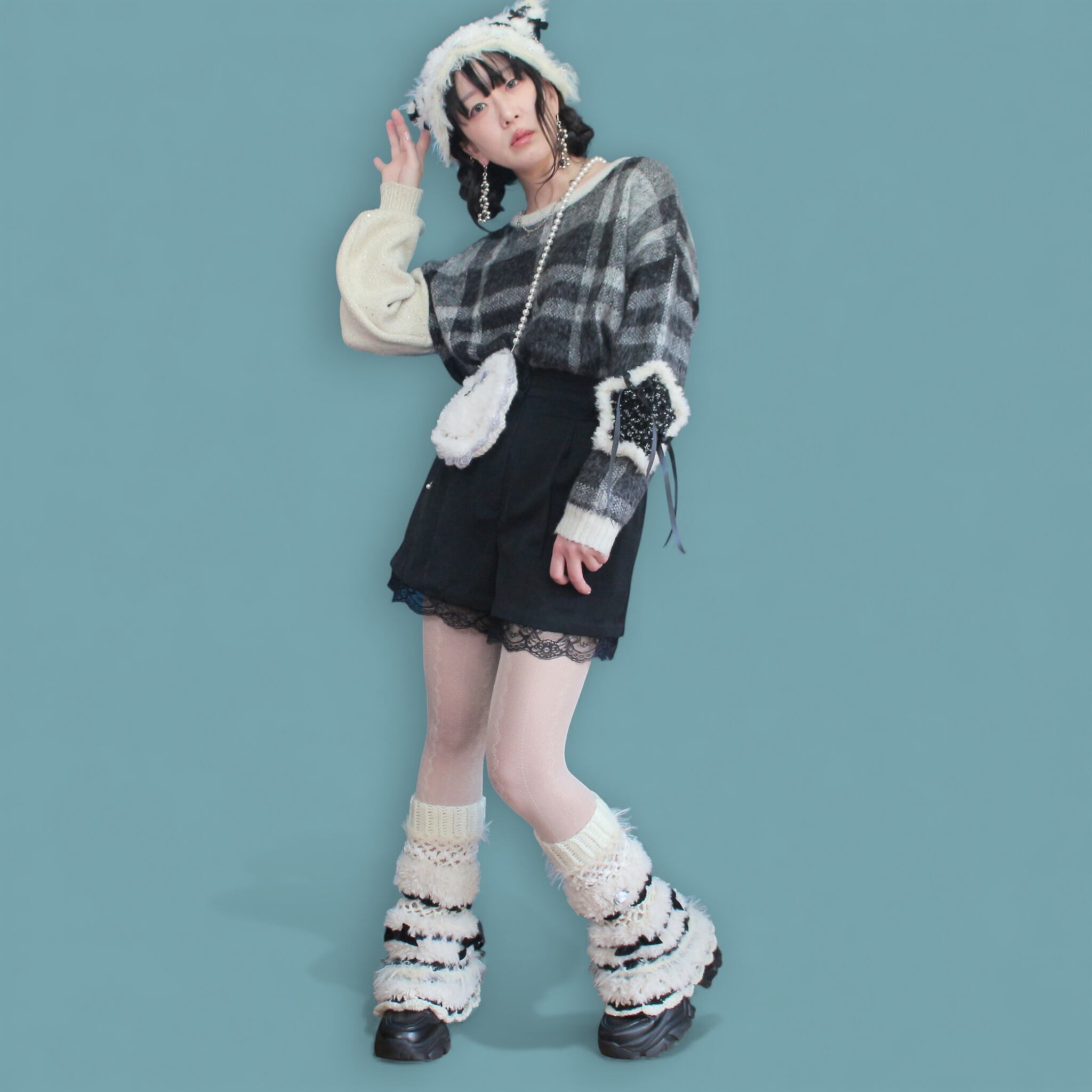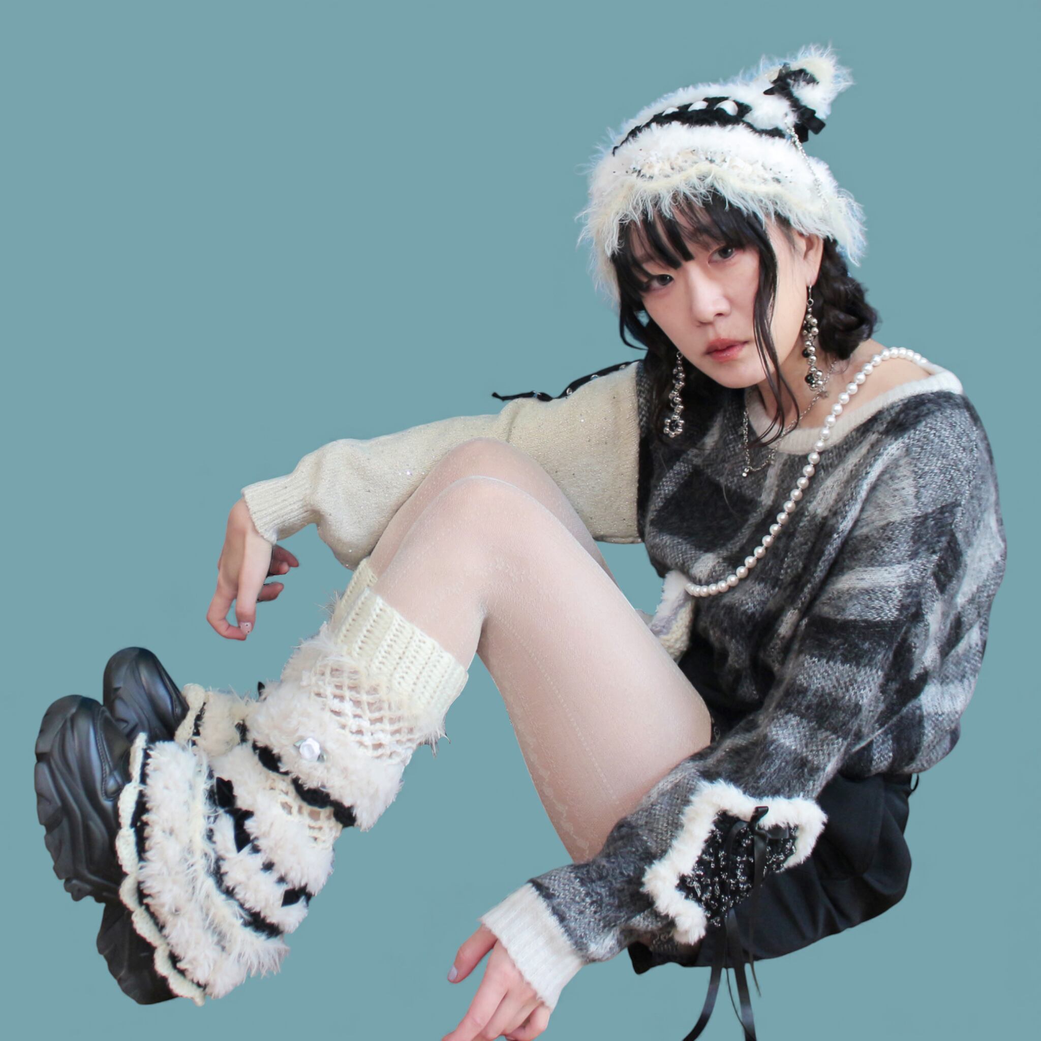 今季は平成パンクロックのテイストを全体に散りばめており、こちらは当時の白黒のボーダーソックスや編みタイツから着想を得て、令和のスタイルへと昇華させたデザインです。