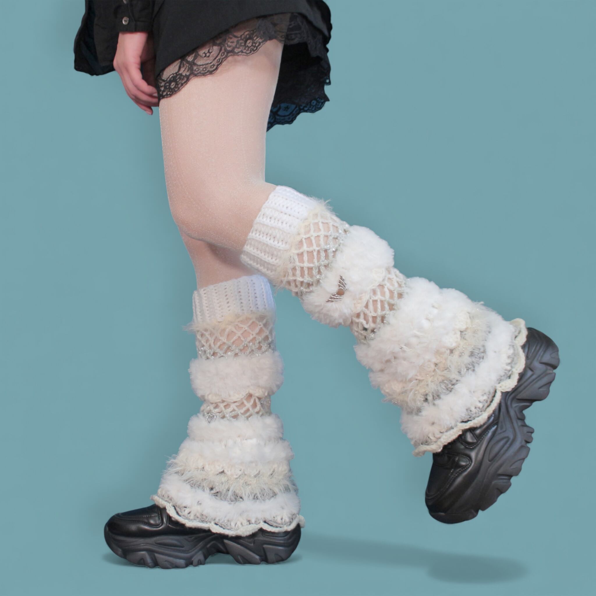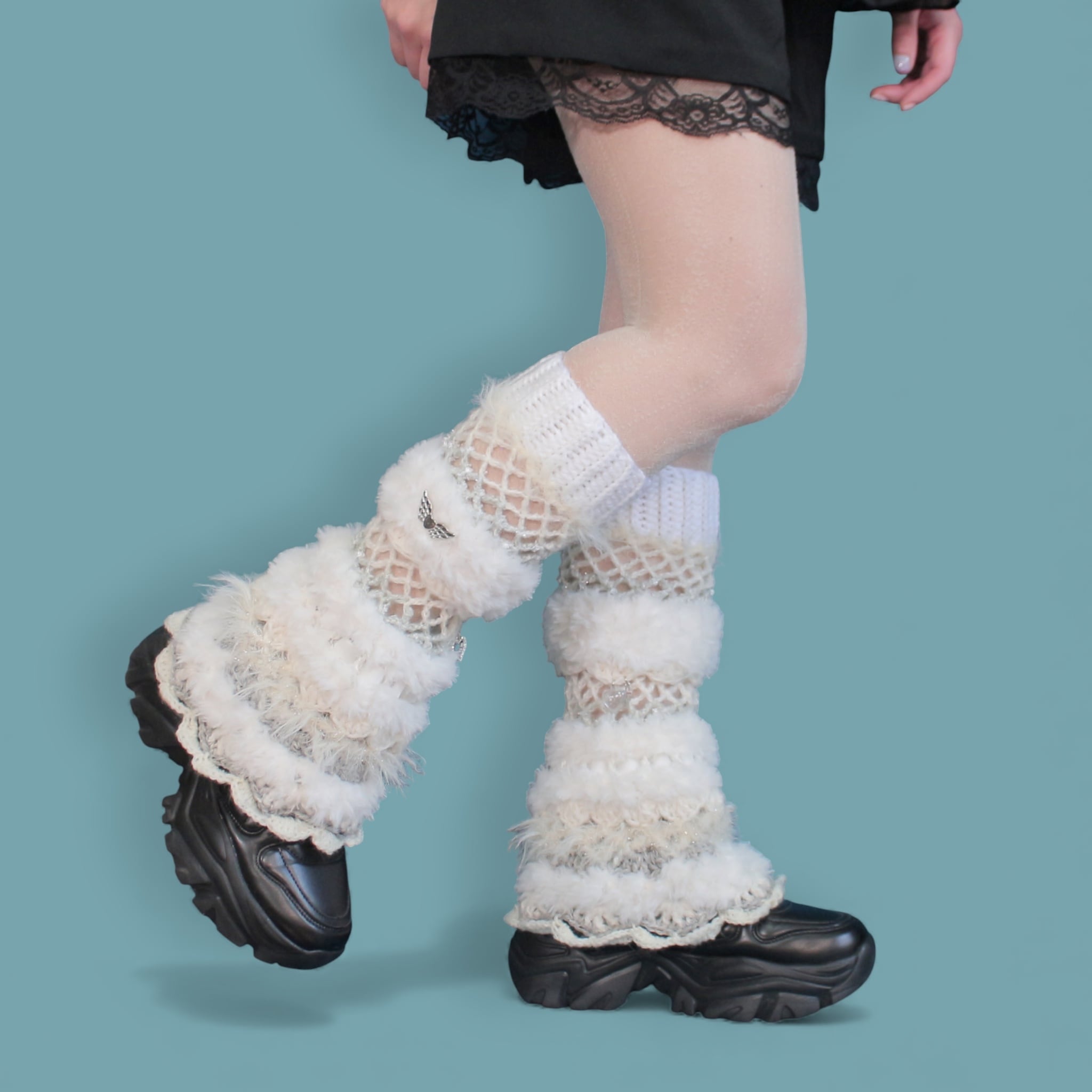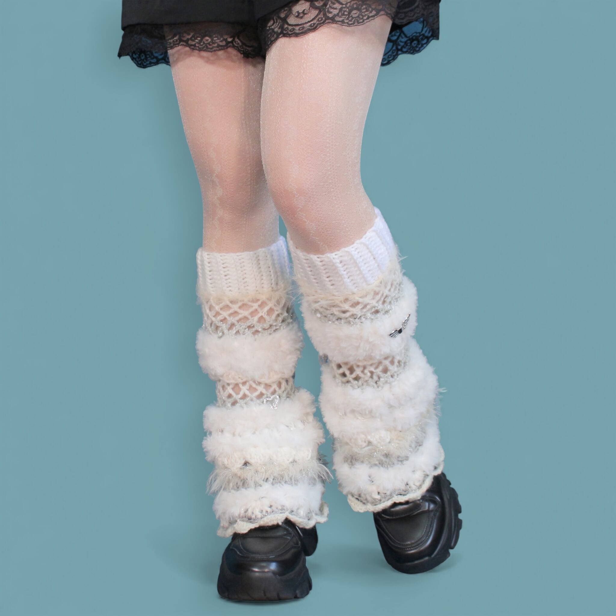 様々な糸を組み合わせたハンドニットのレッグウォーマーです。