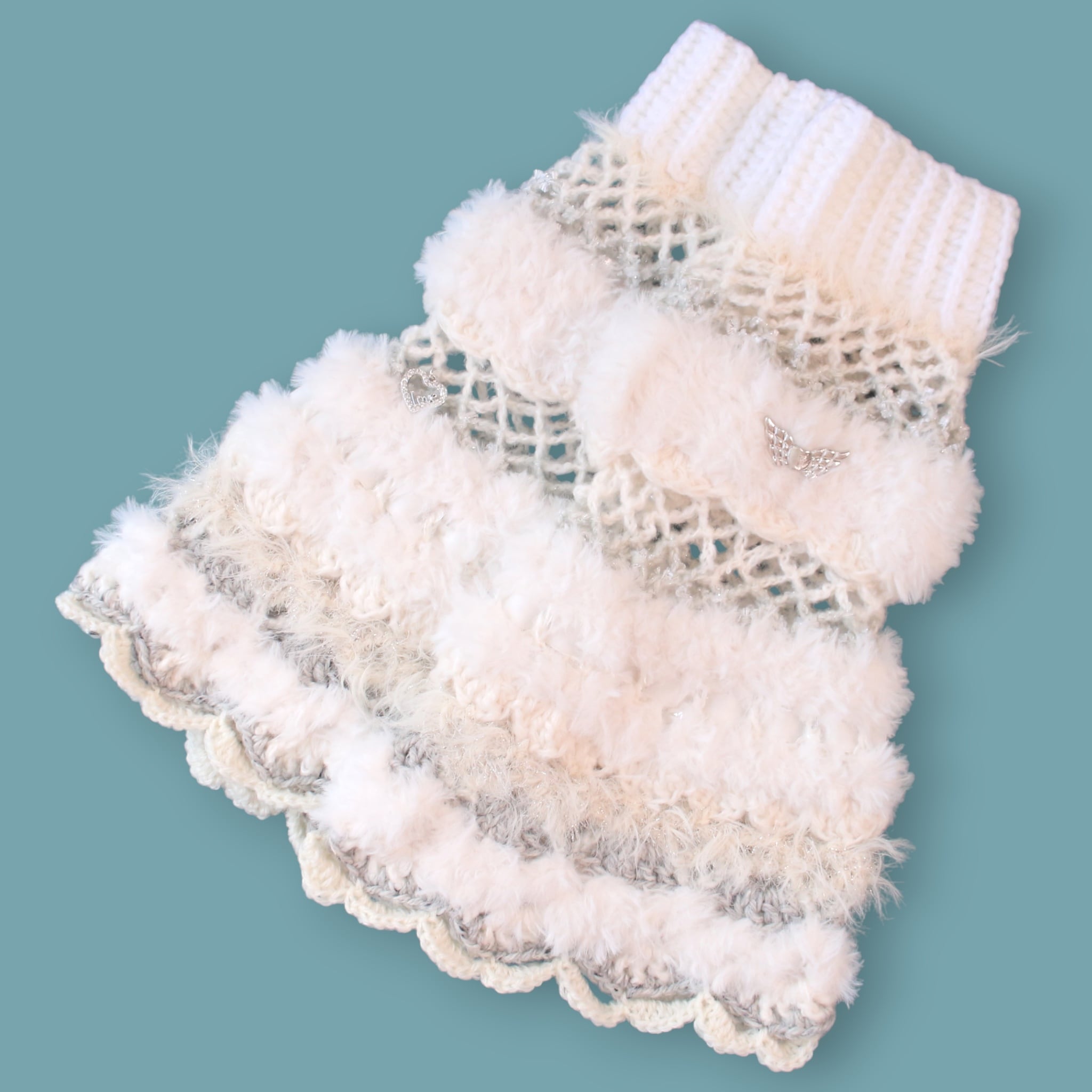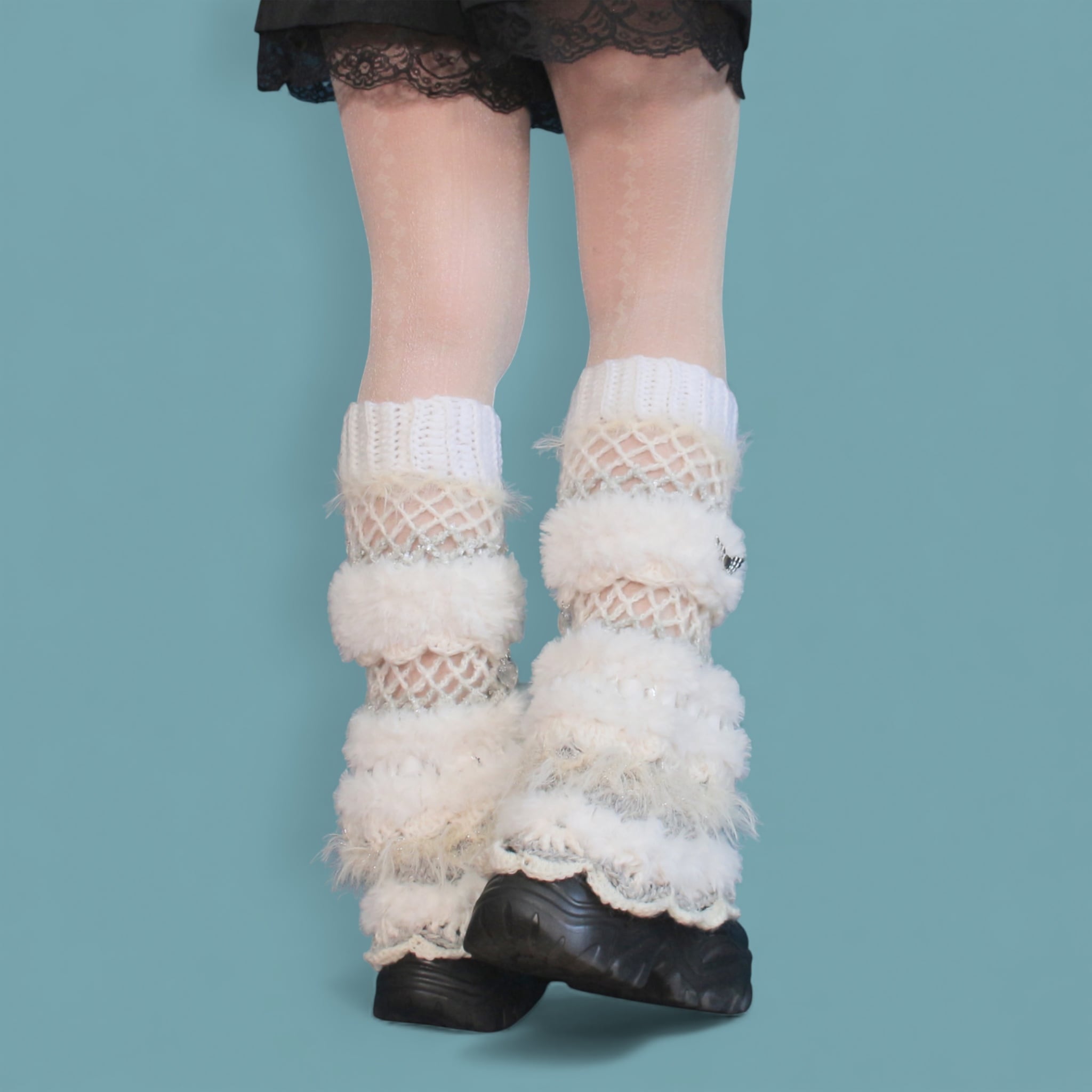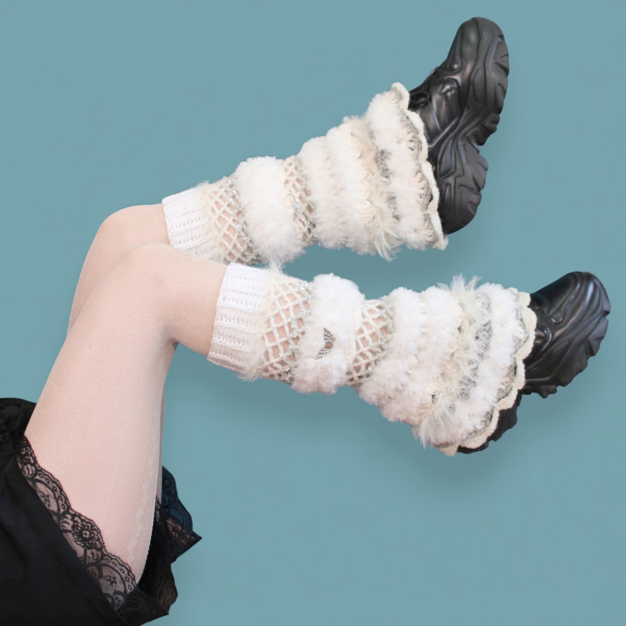 様々な糸を組み合わせたハンドニットのレッグウォーマーです。