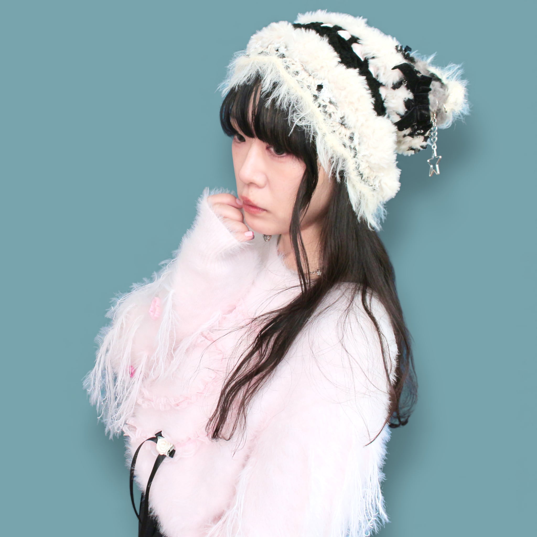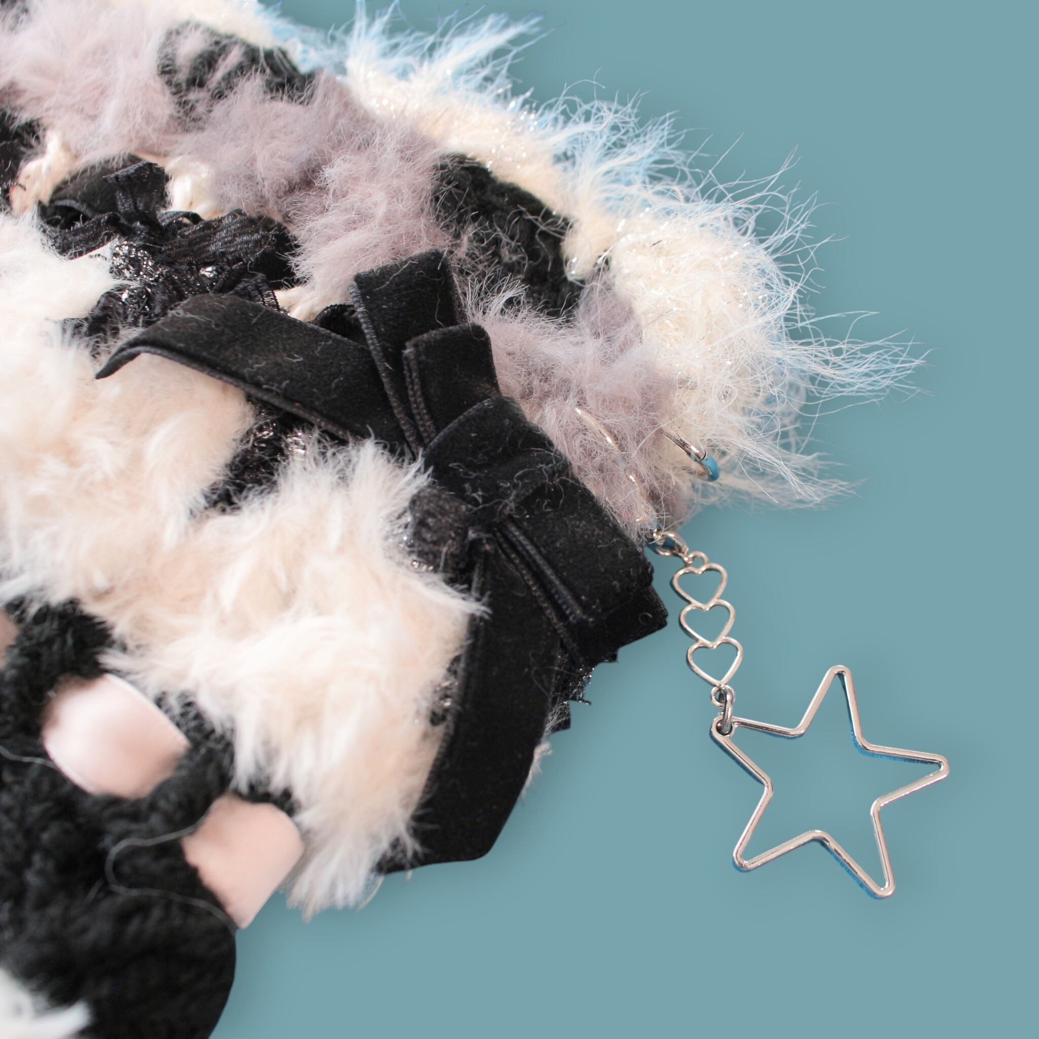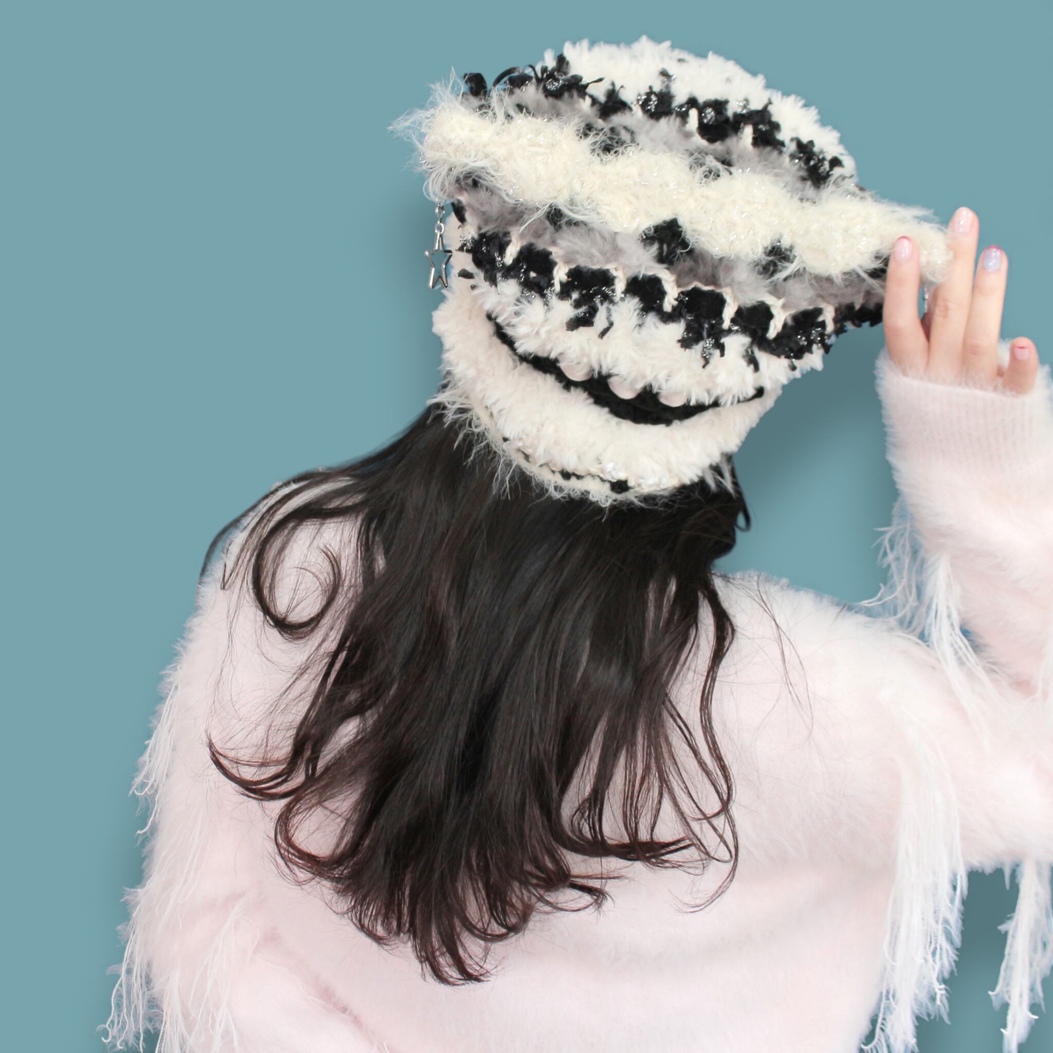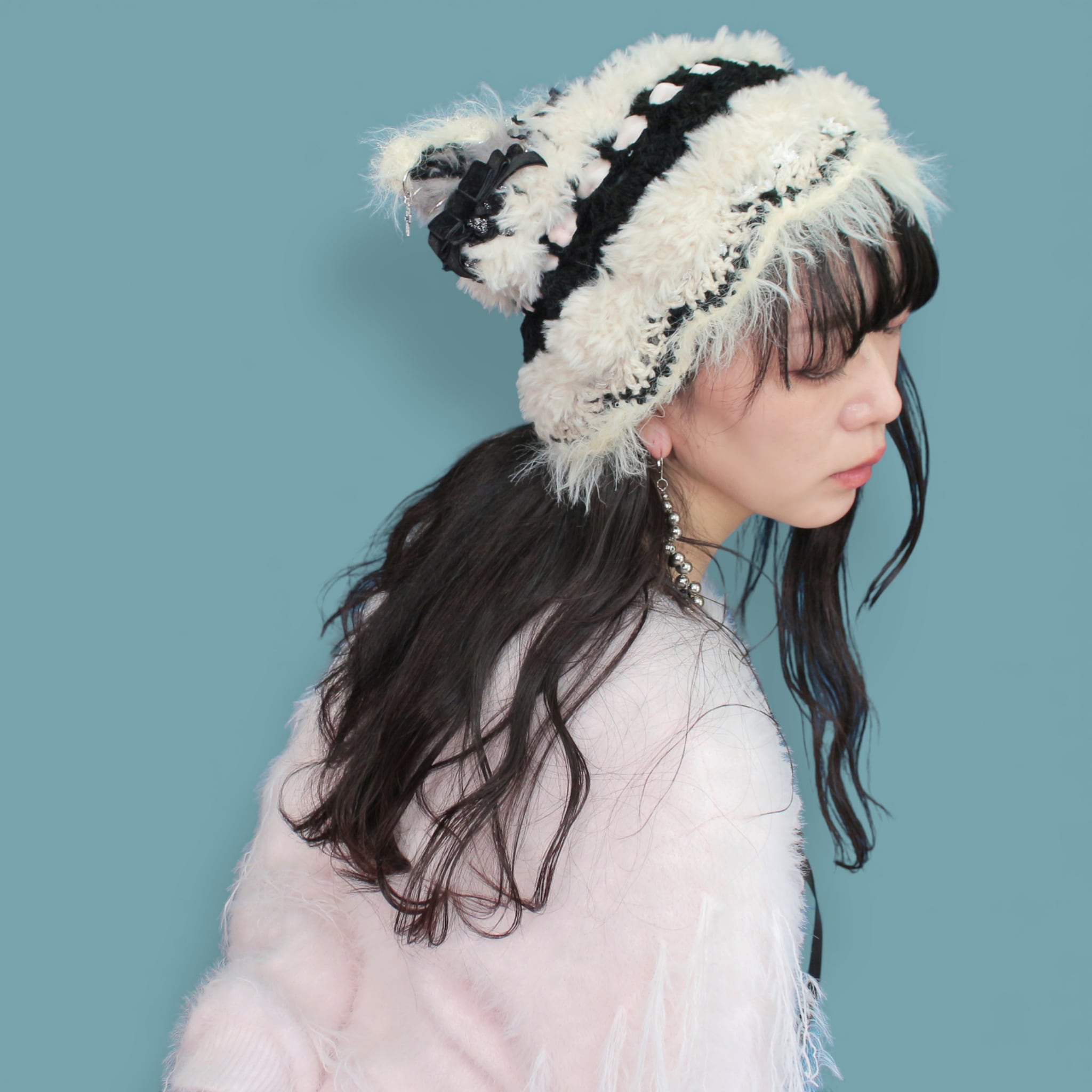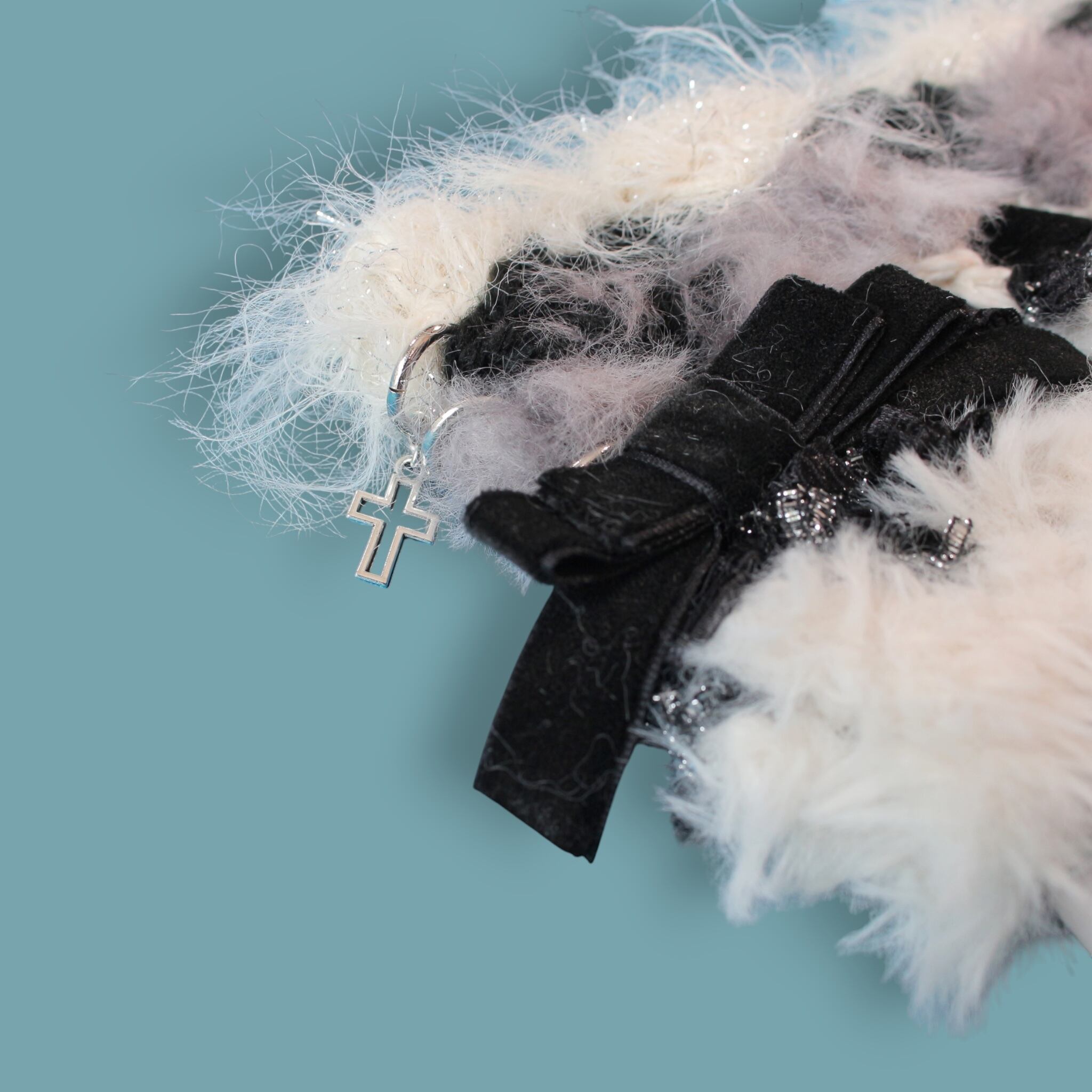 ホワイトベージュのファーと黒い毛糸をメインに、ラメ糸や繊細なシャギー糸など組み合わせて編みました。