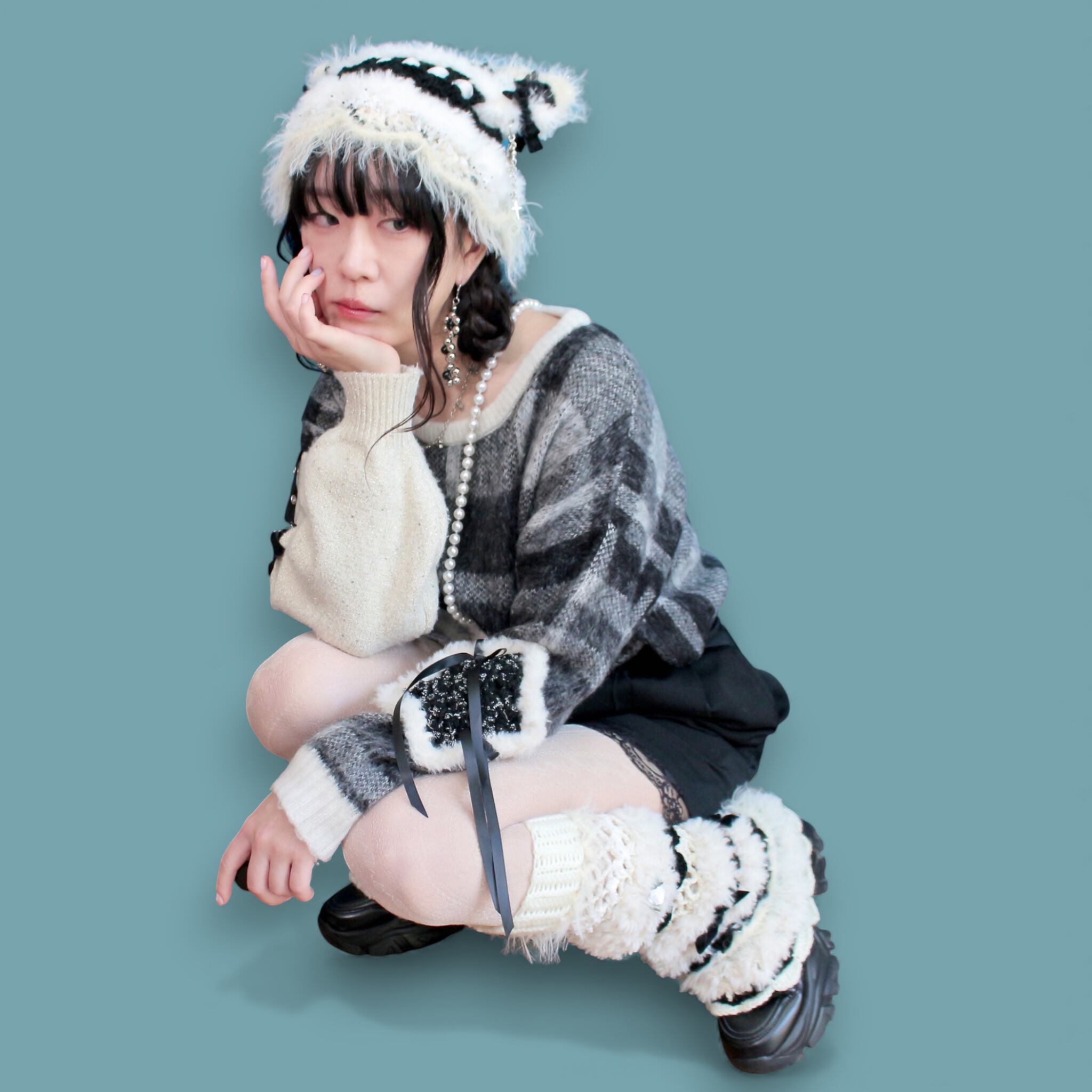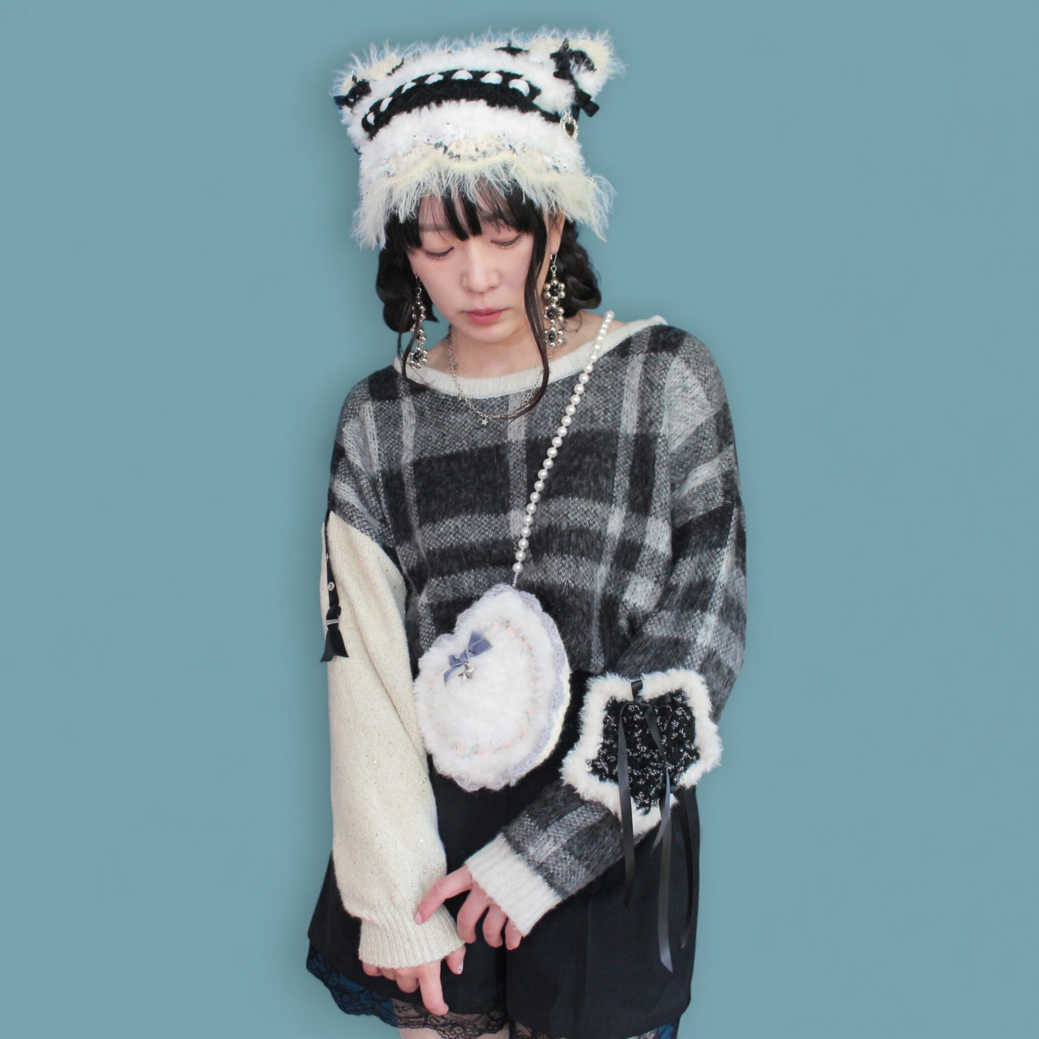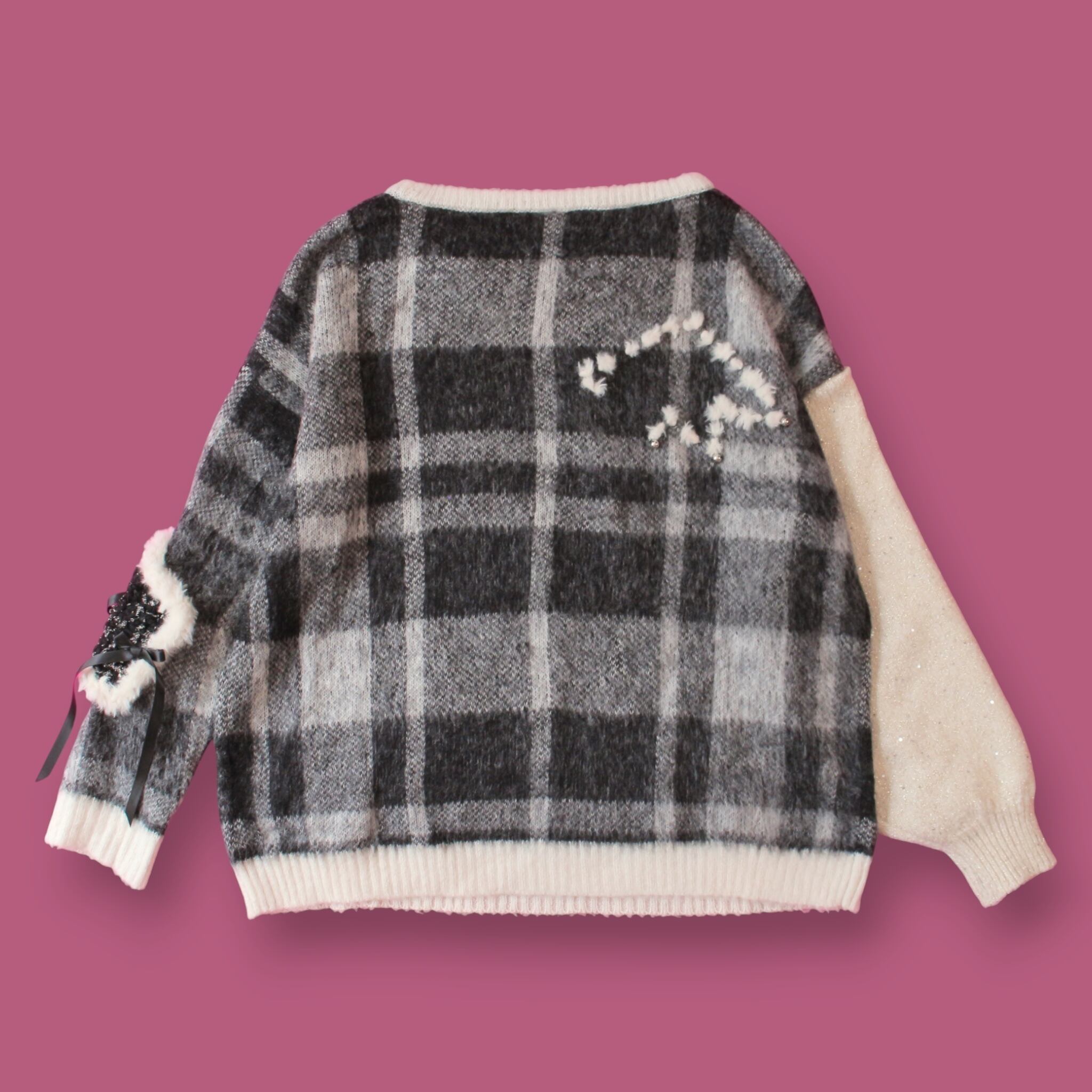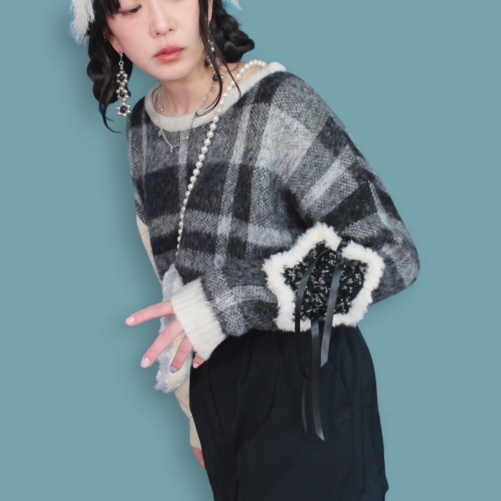 ほんのりシャギー感のあるチェックのニットに、ANGEL MONSTER knit pulloverの素材になったラメニットのお袖を組み合わせています。
