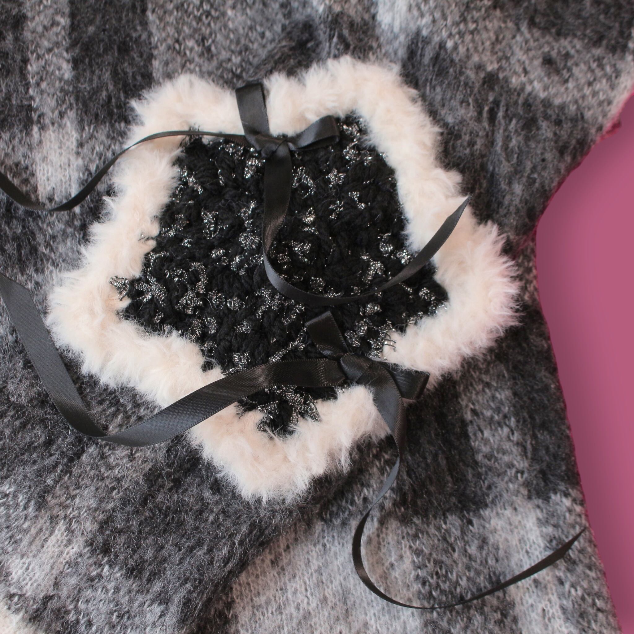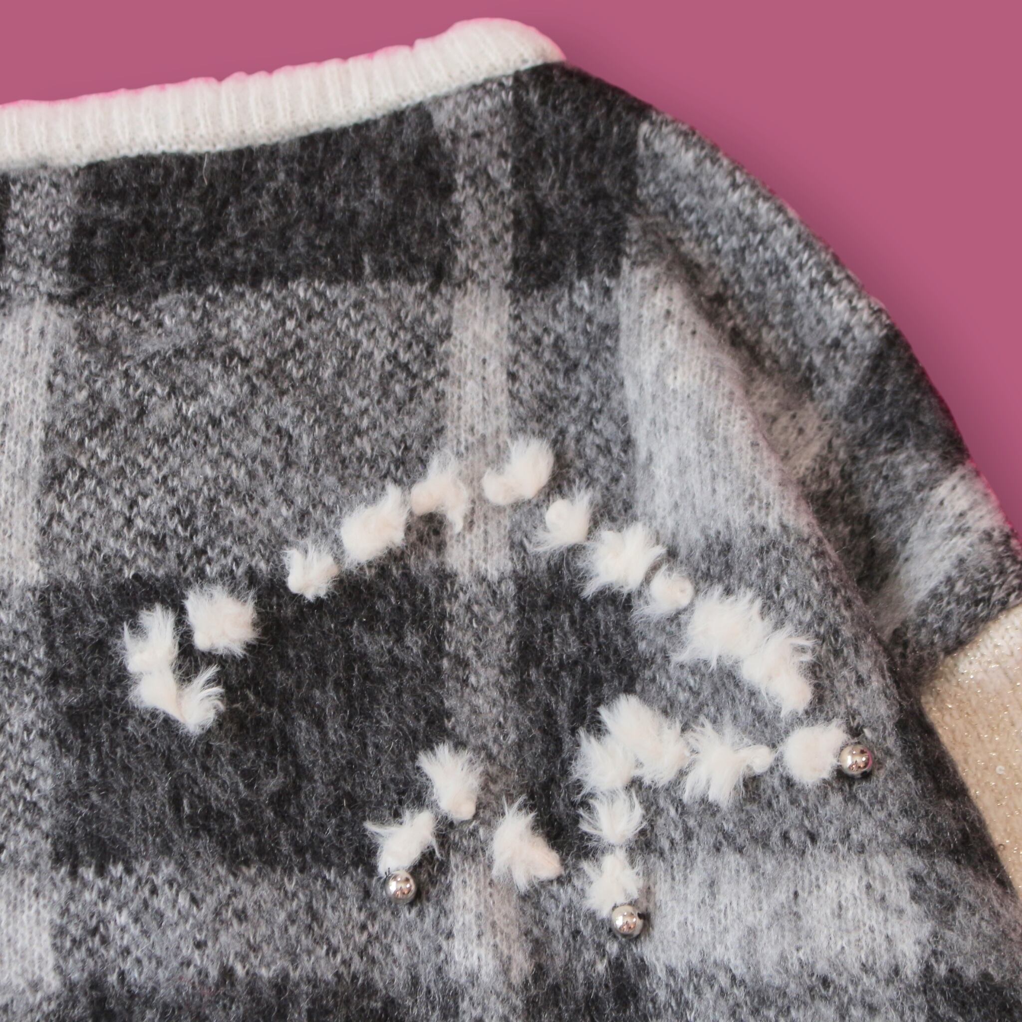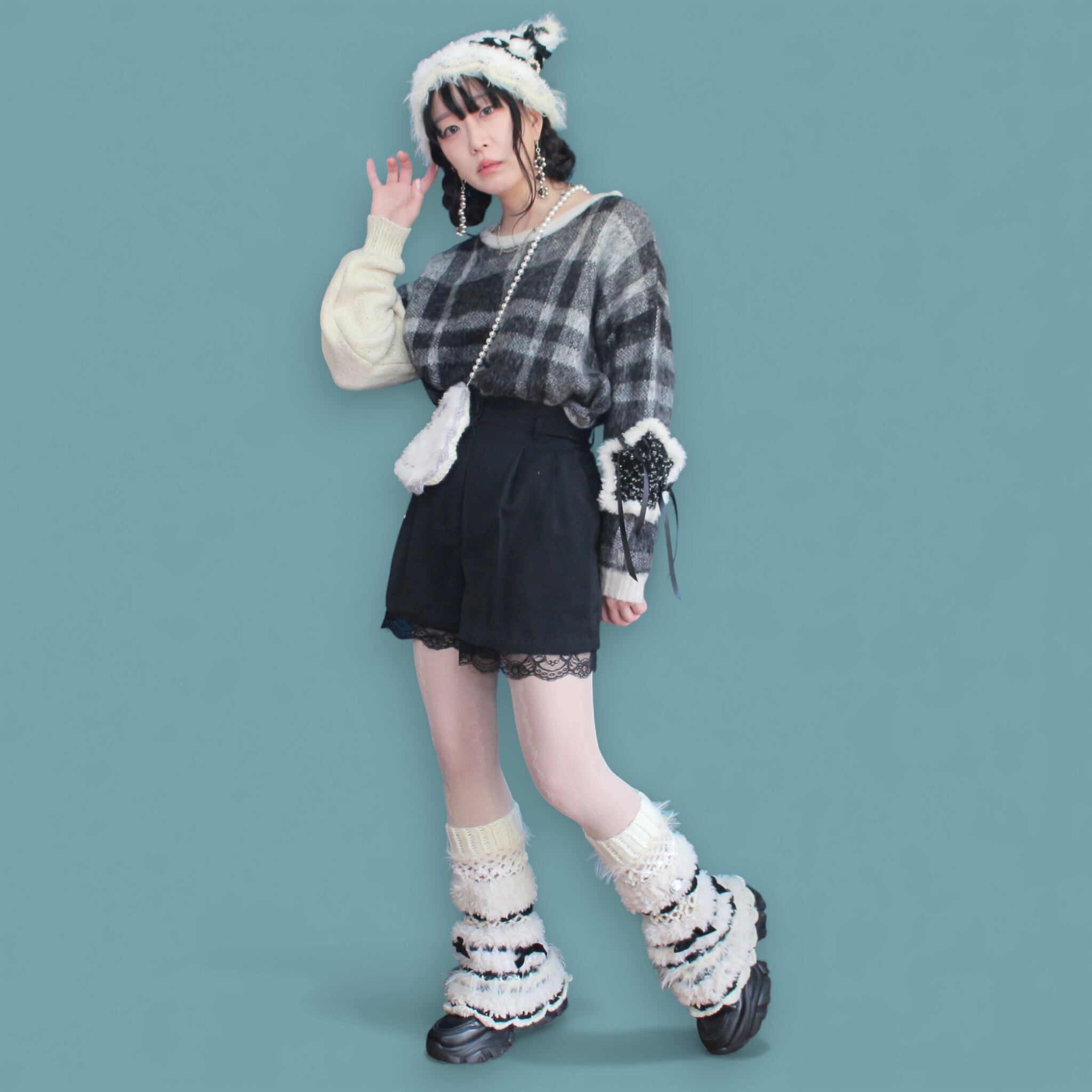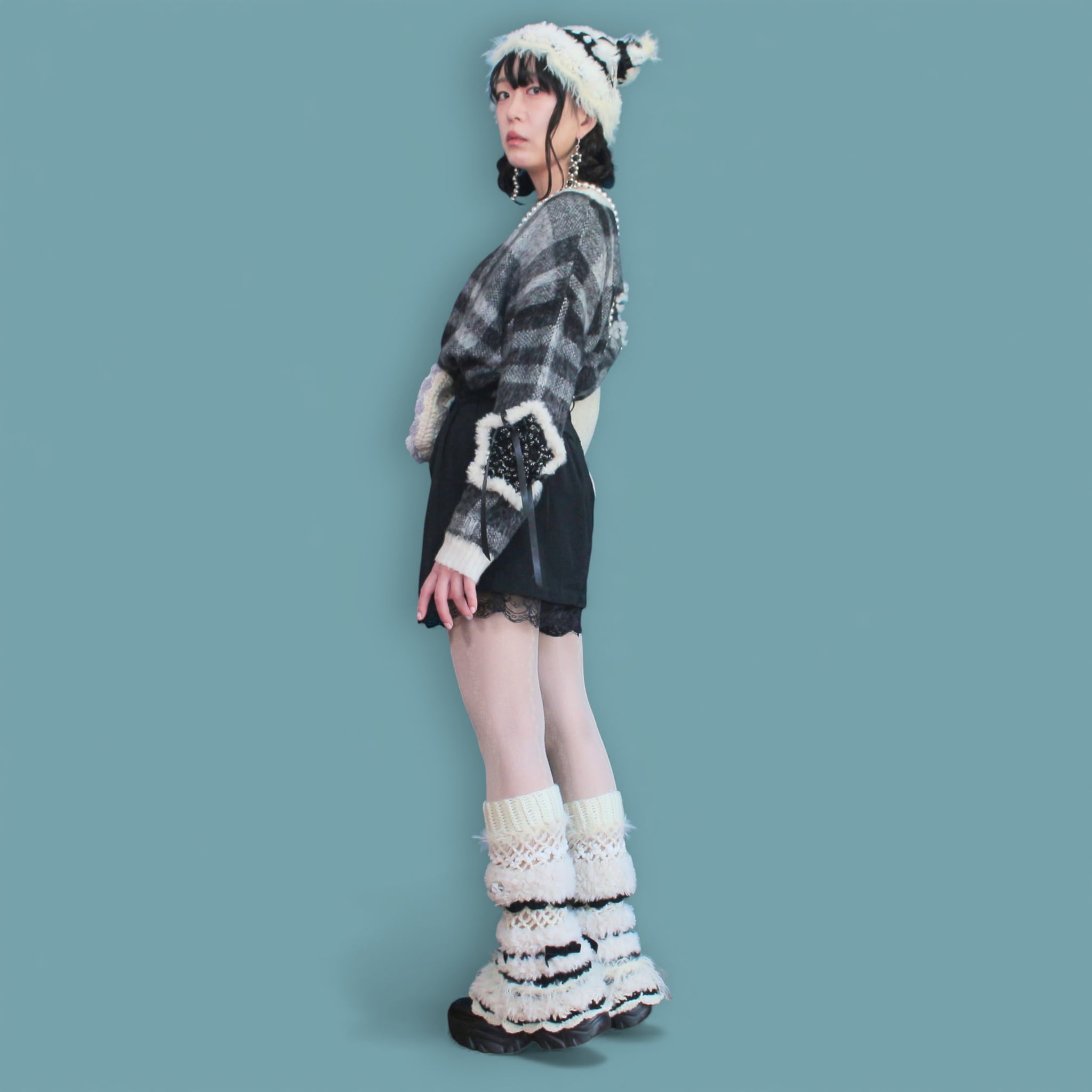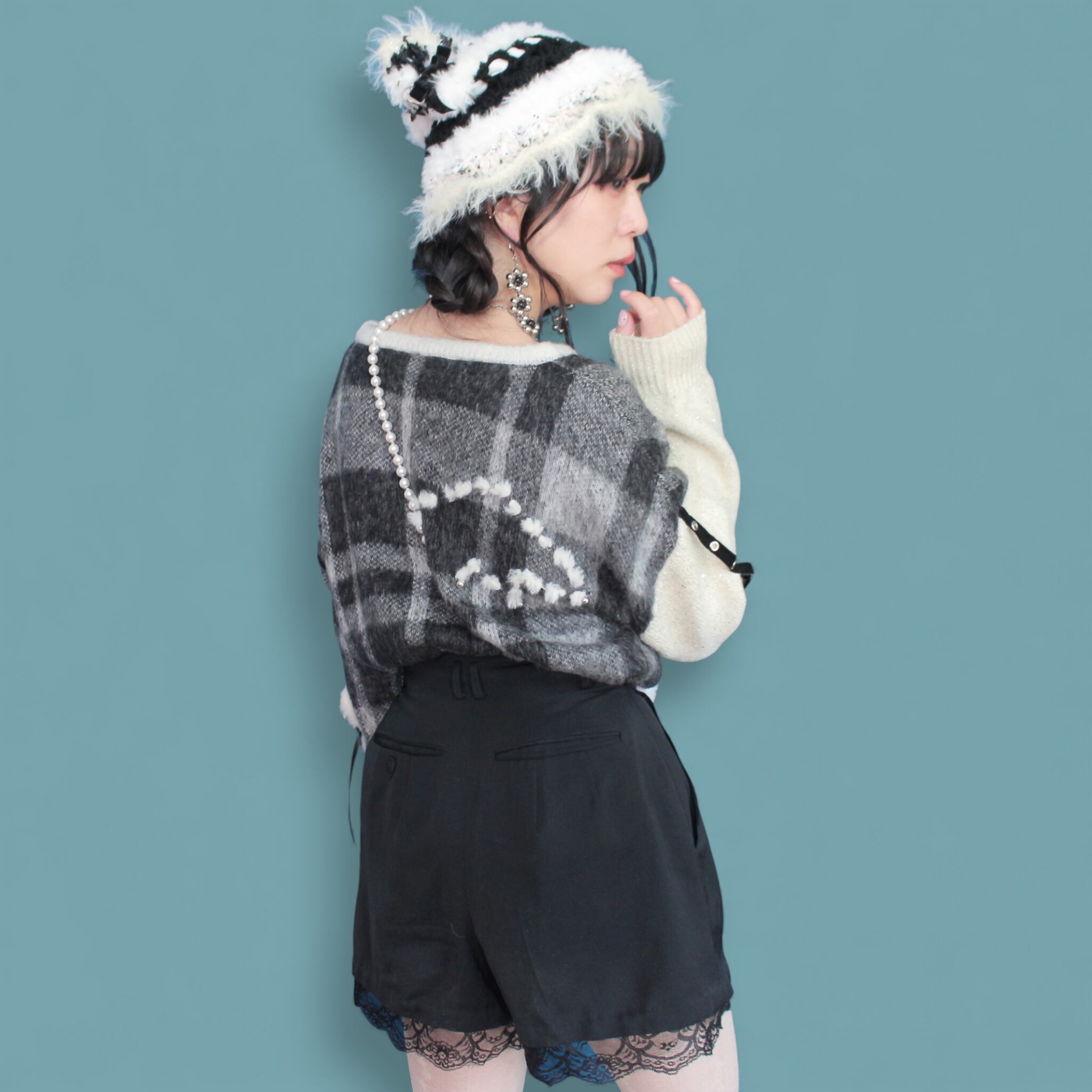 ほんのりシャギー感のあるチェックのニットに、ANGEL MONSTER knit pulloverの素材になったラメニットのお袖を組み合わせています。