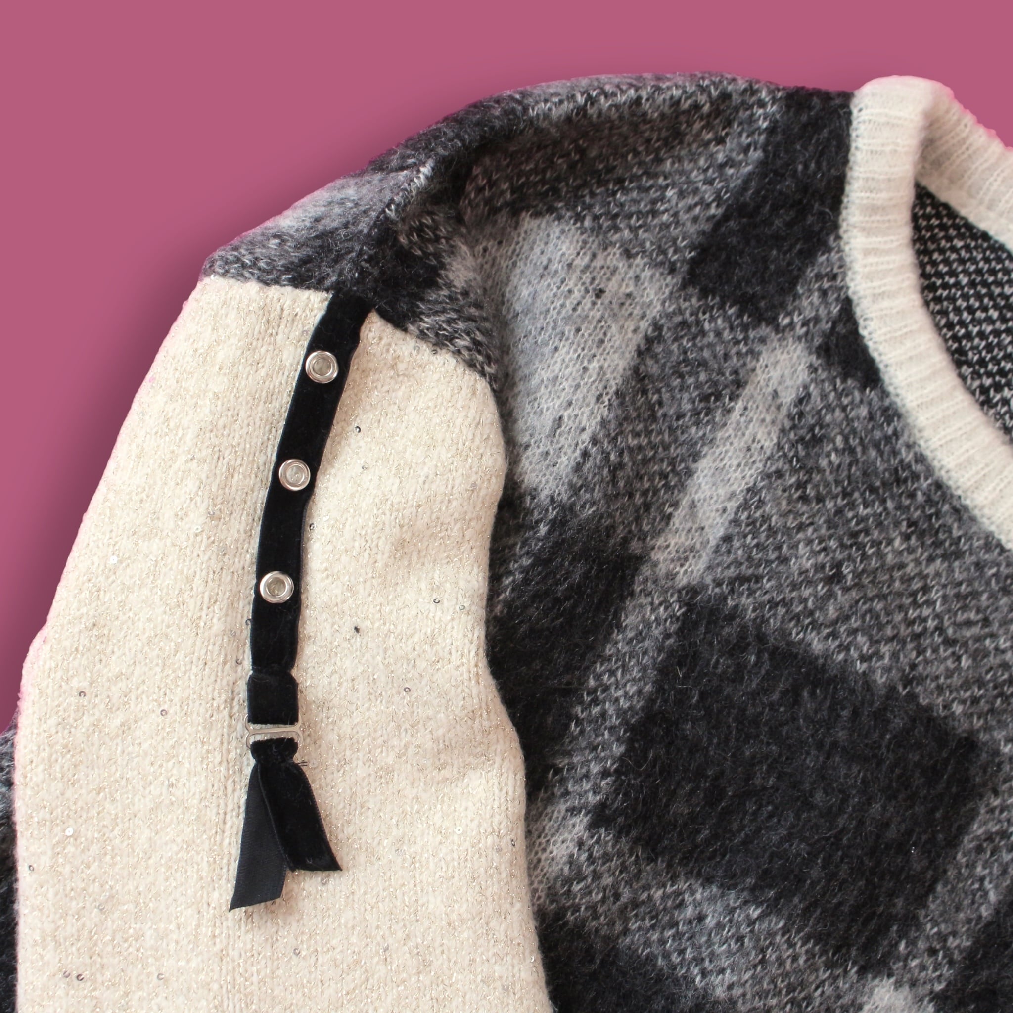 右袖はちょっぴりパンクな雰囲気も出したかったので、ハトメを開けたベロアリボンをあしらいました。