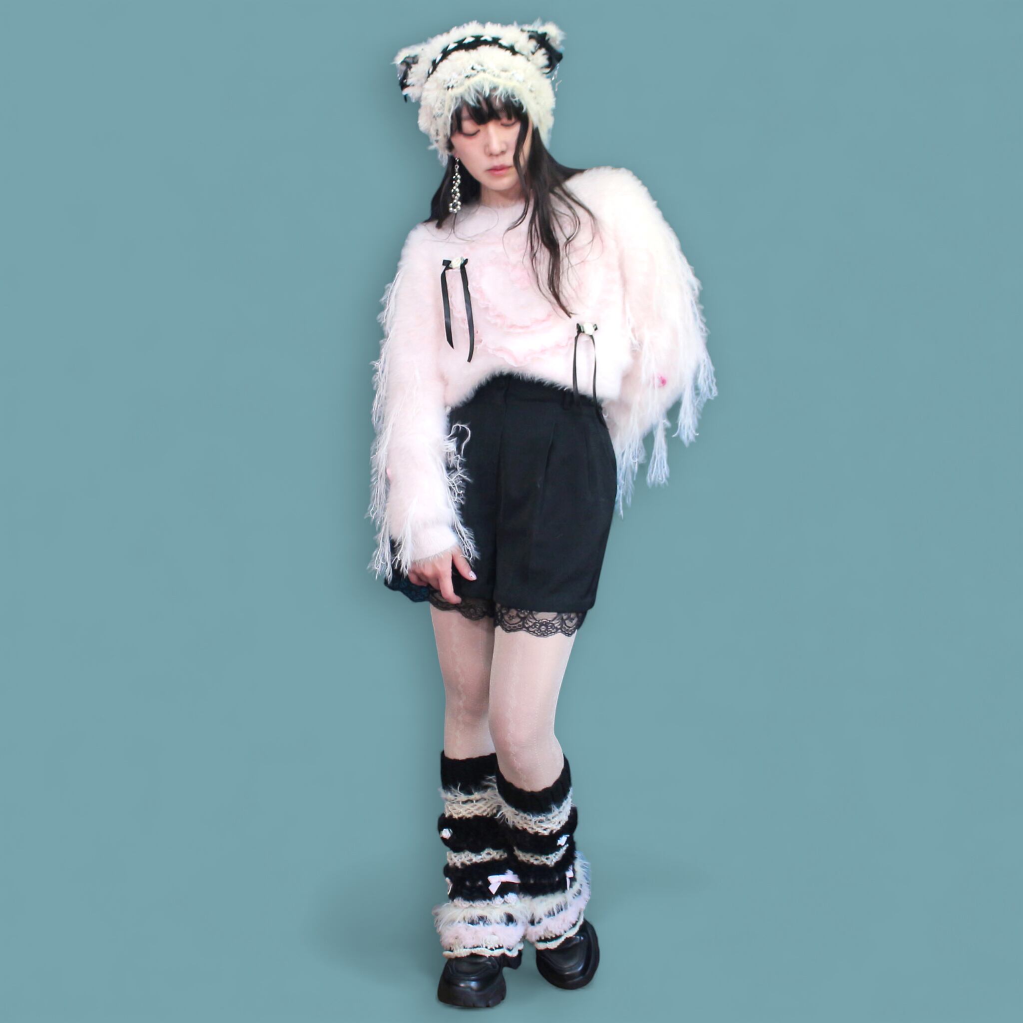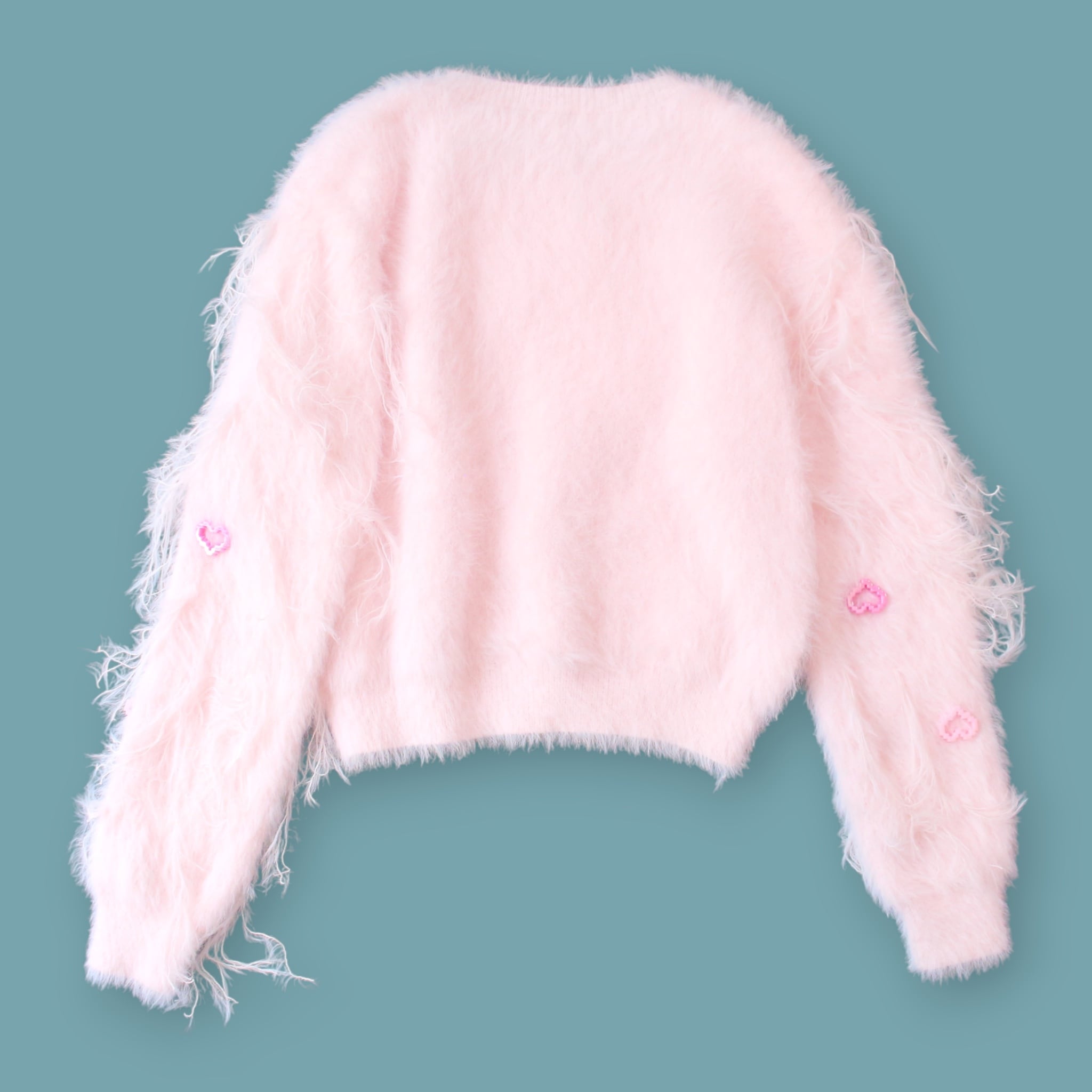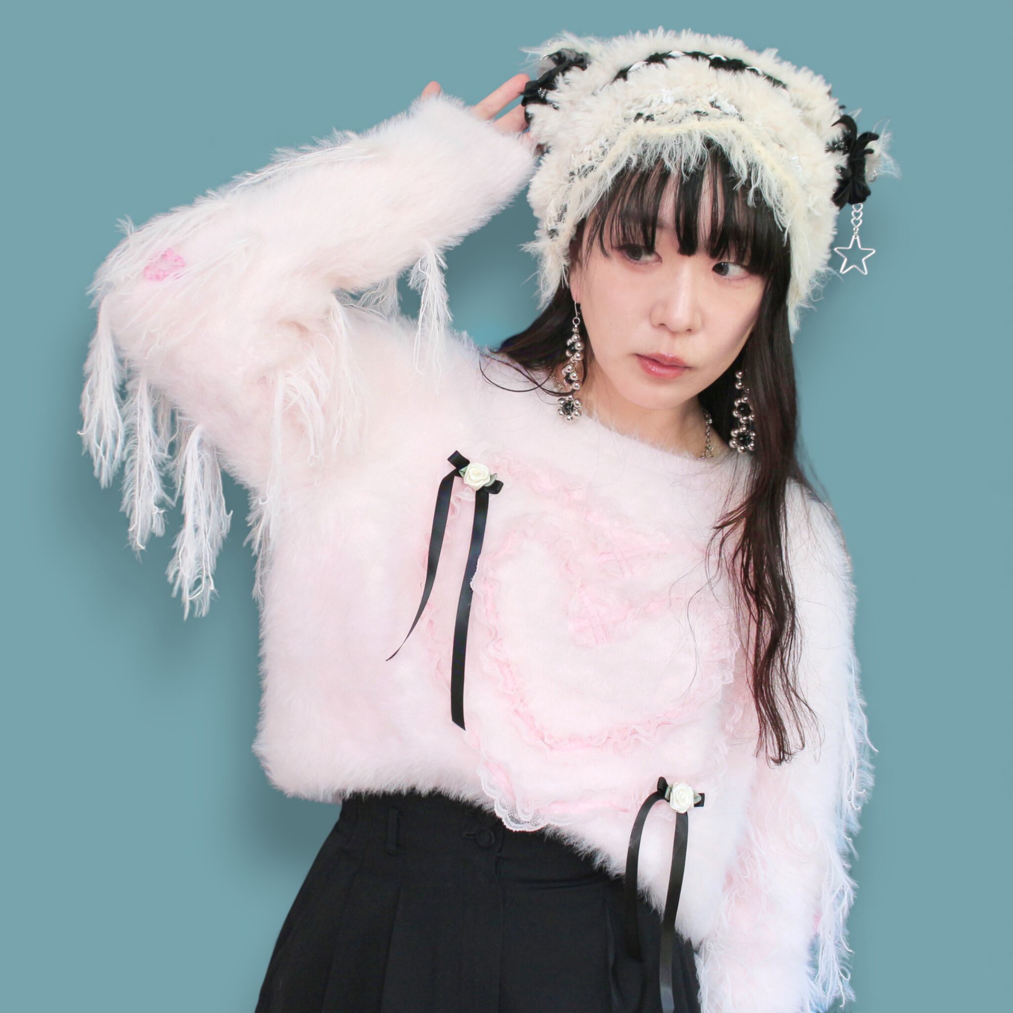 大きなハートがデザインされた子兎のようなシャギーニットです。