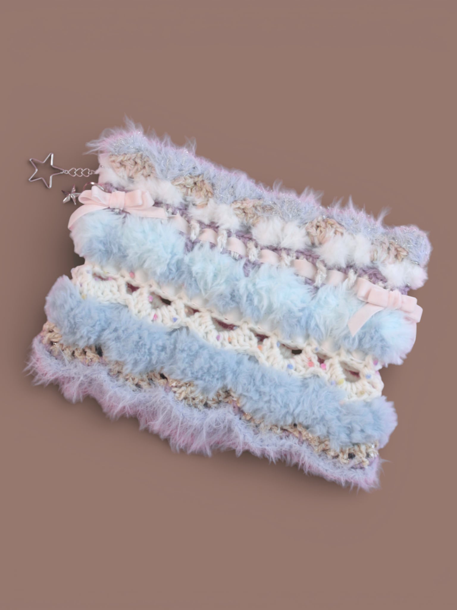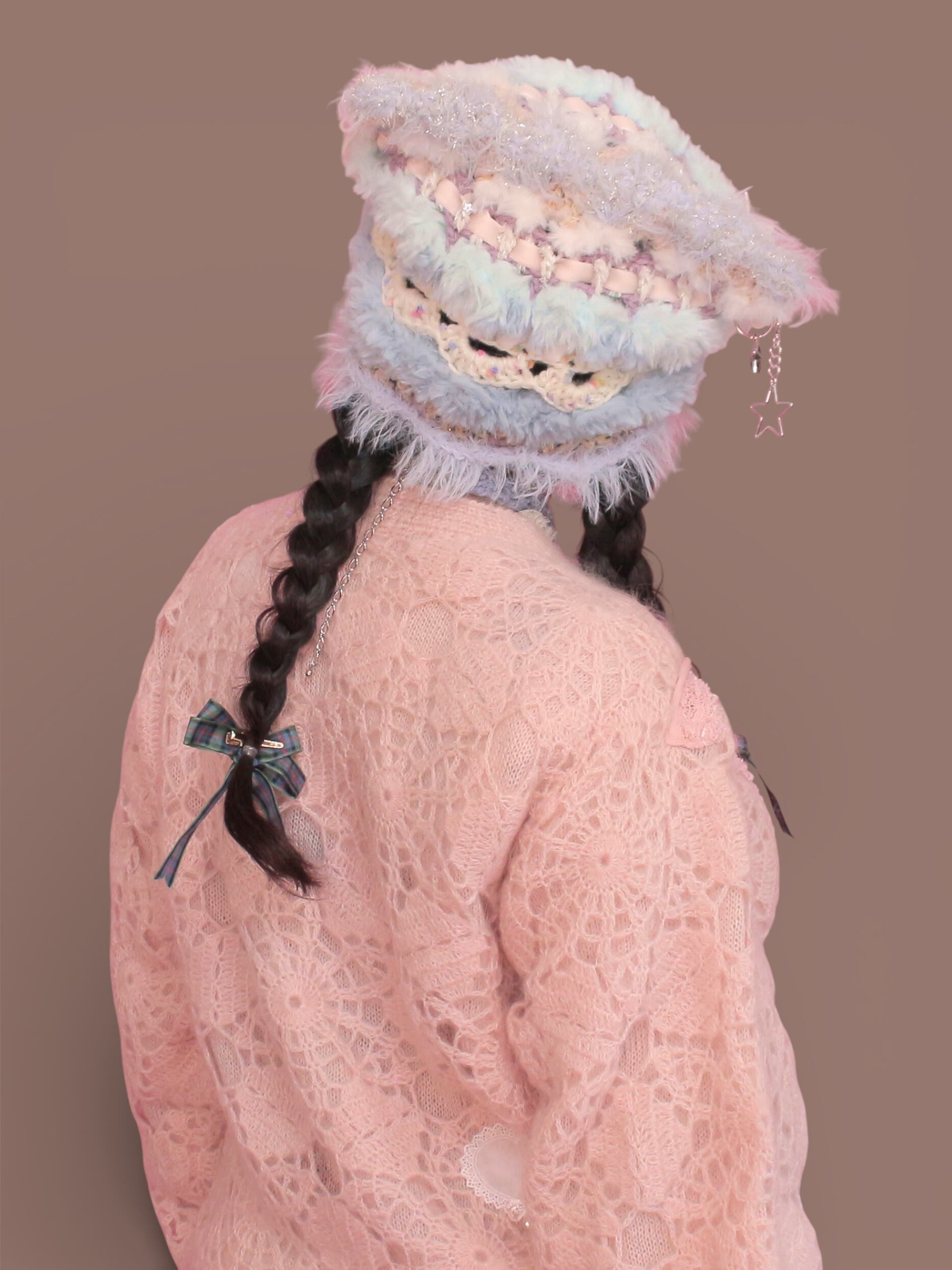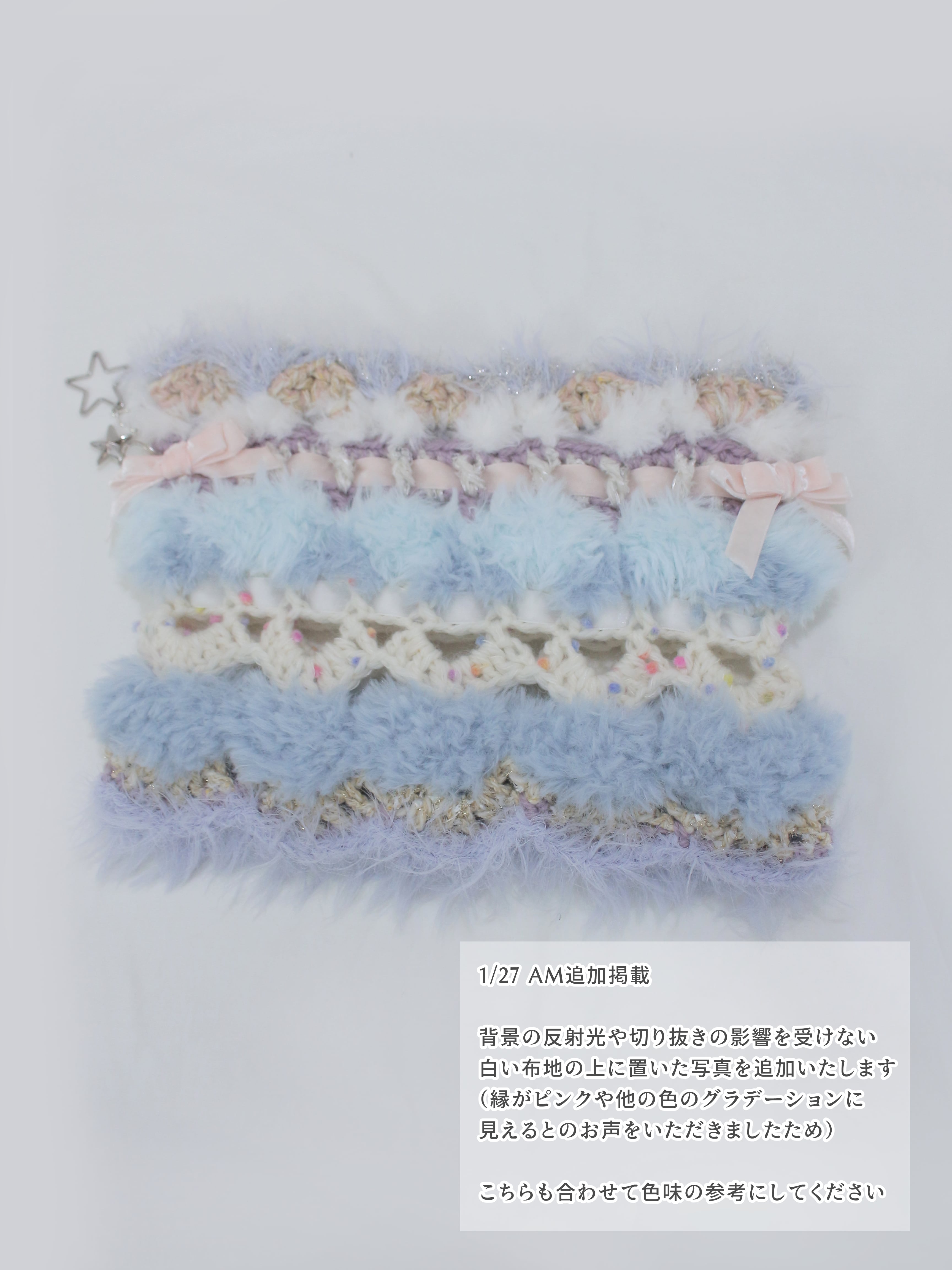 寒色系のファーに、ラメ糸や繊細なシャギー糸、カラフルな粒が混じった毛糸など組み合わせて編みました。