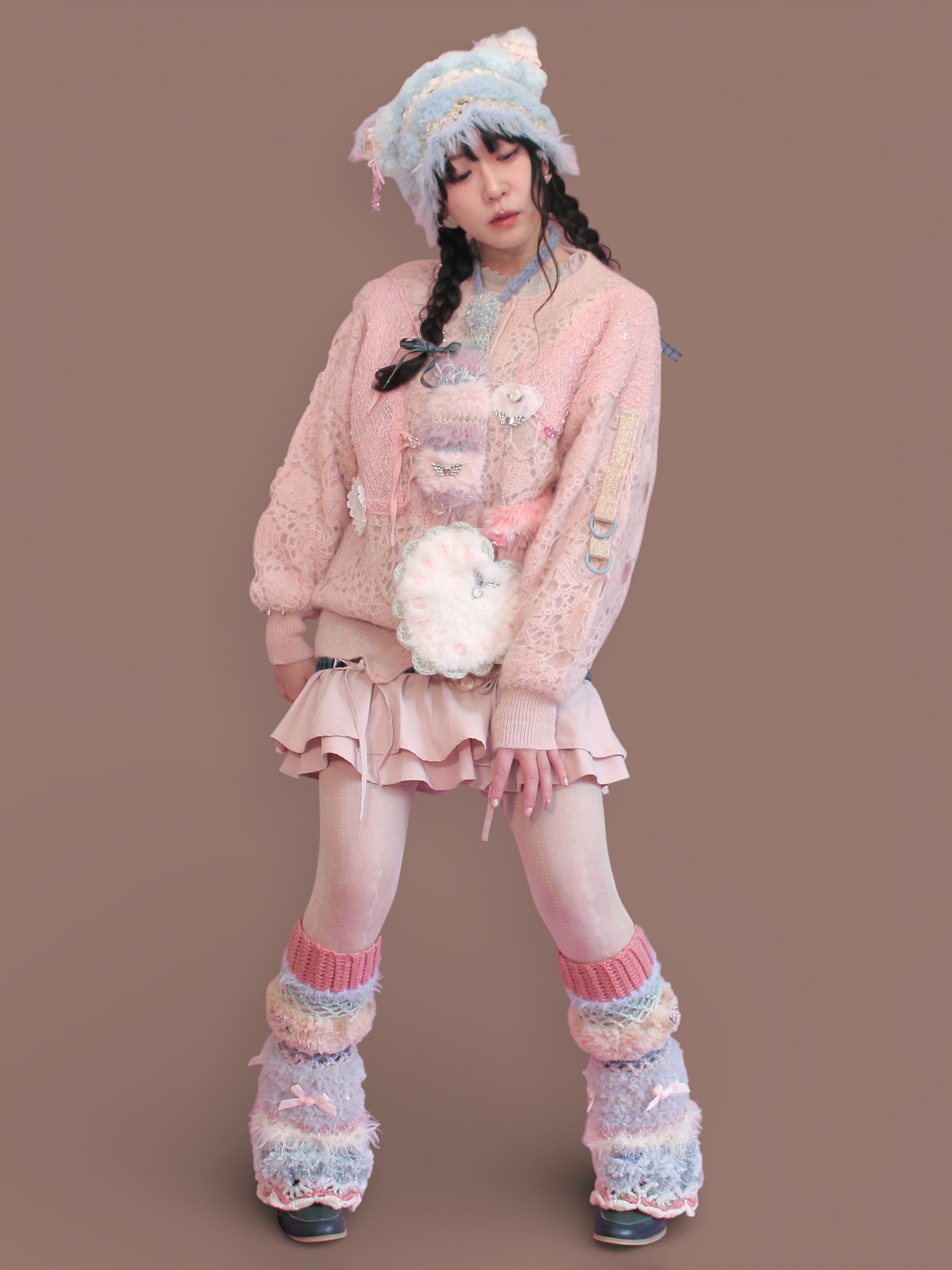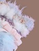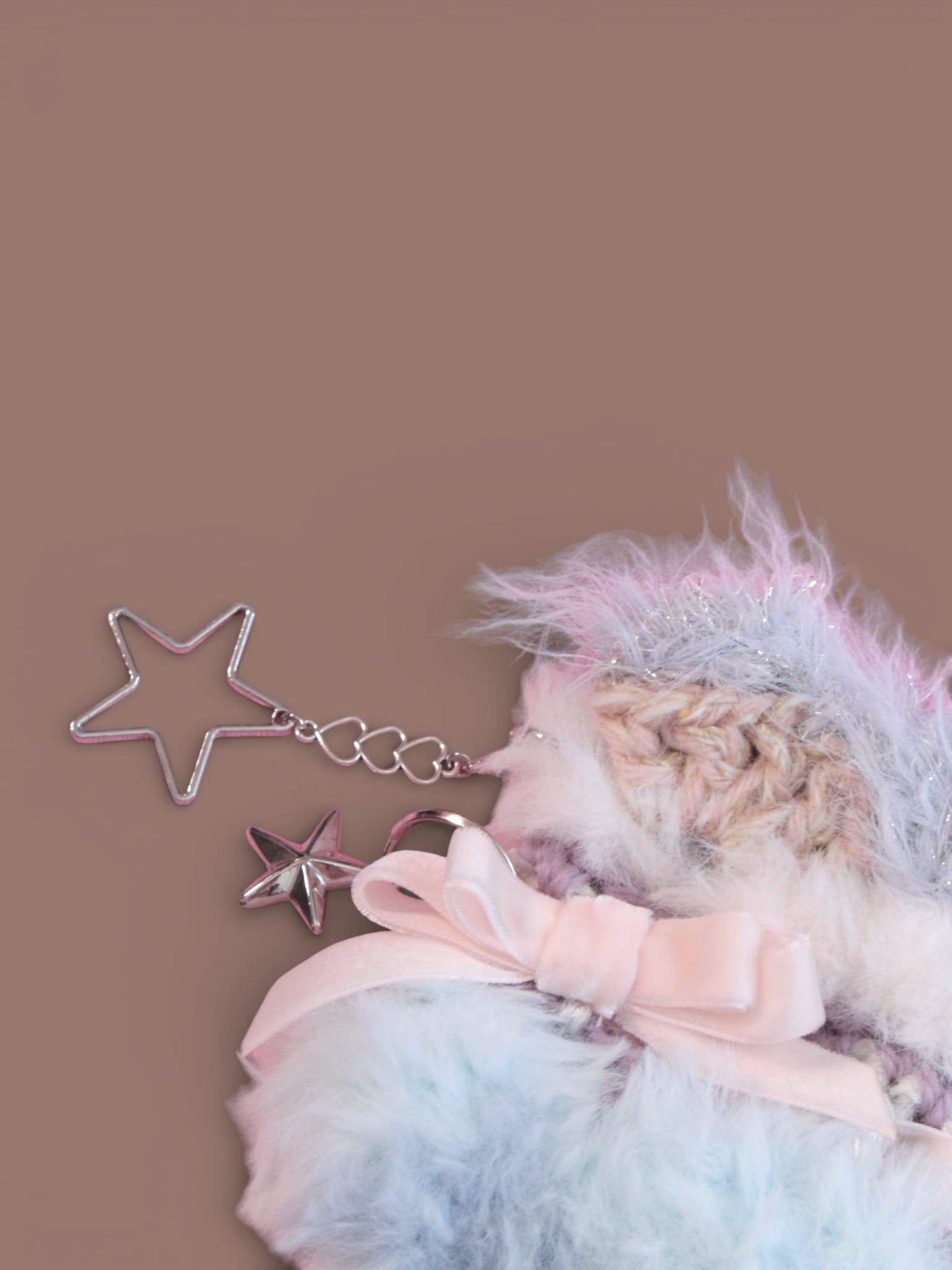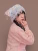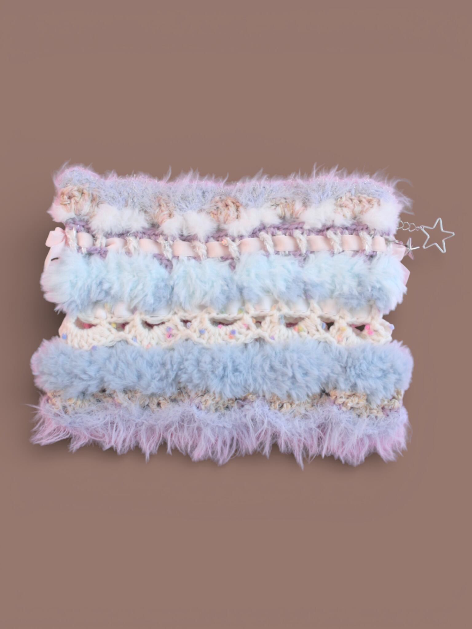 寒色系のファーに、ラメ糸や繊細なシャギー糸、カラフルな粒が混じった毛糸など組み合わせて編みました。
