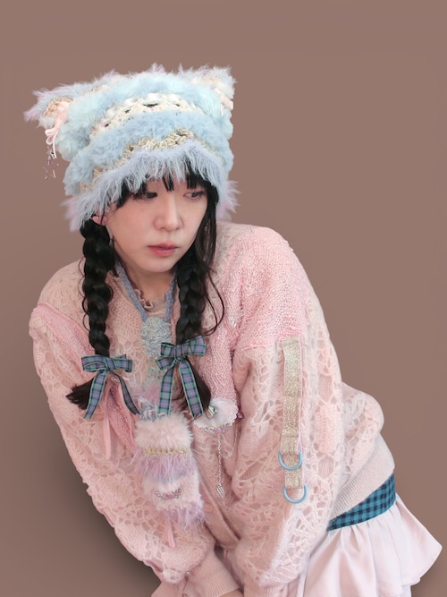 様々な毛糸を組み合わせたハンドニットのケモミミ帽子です。