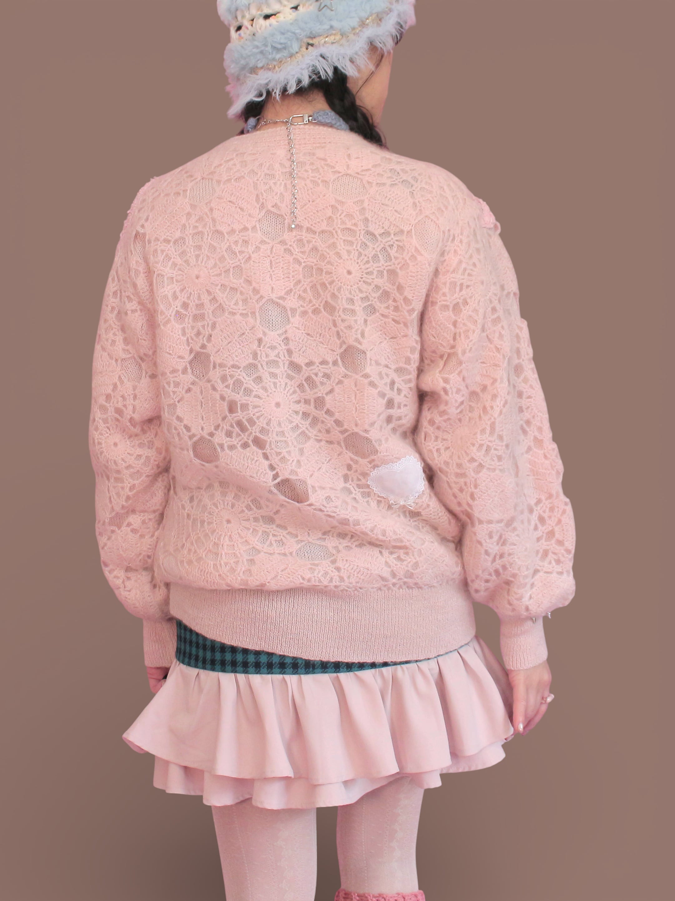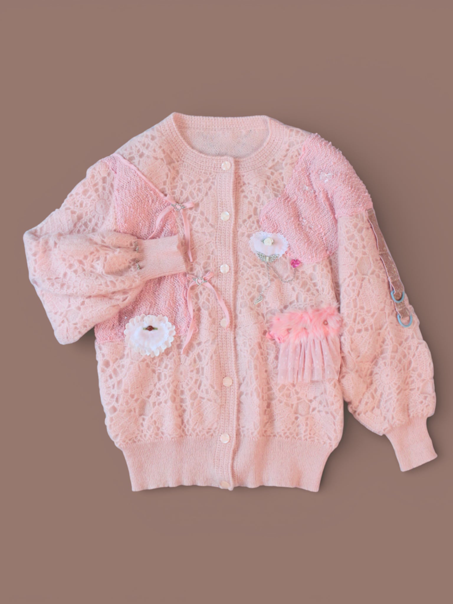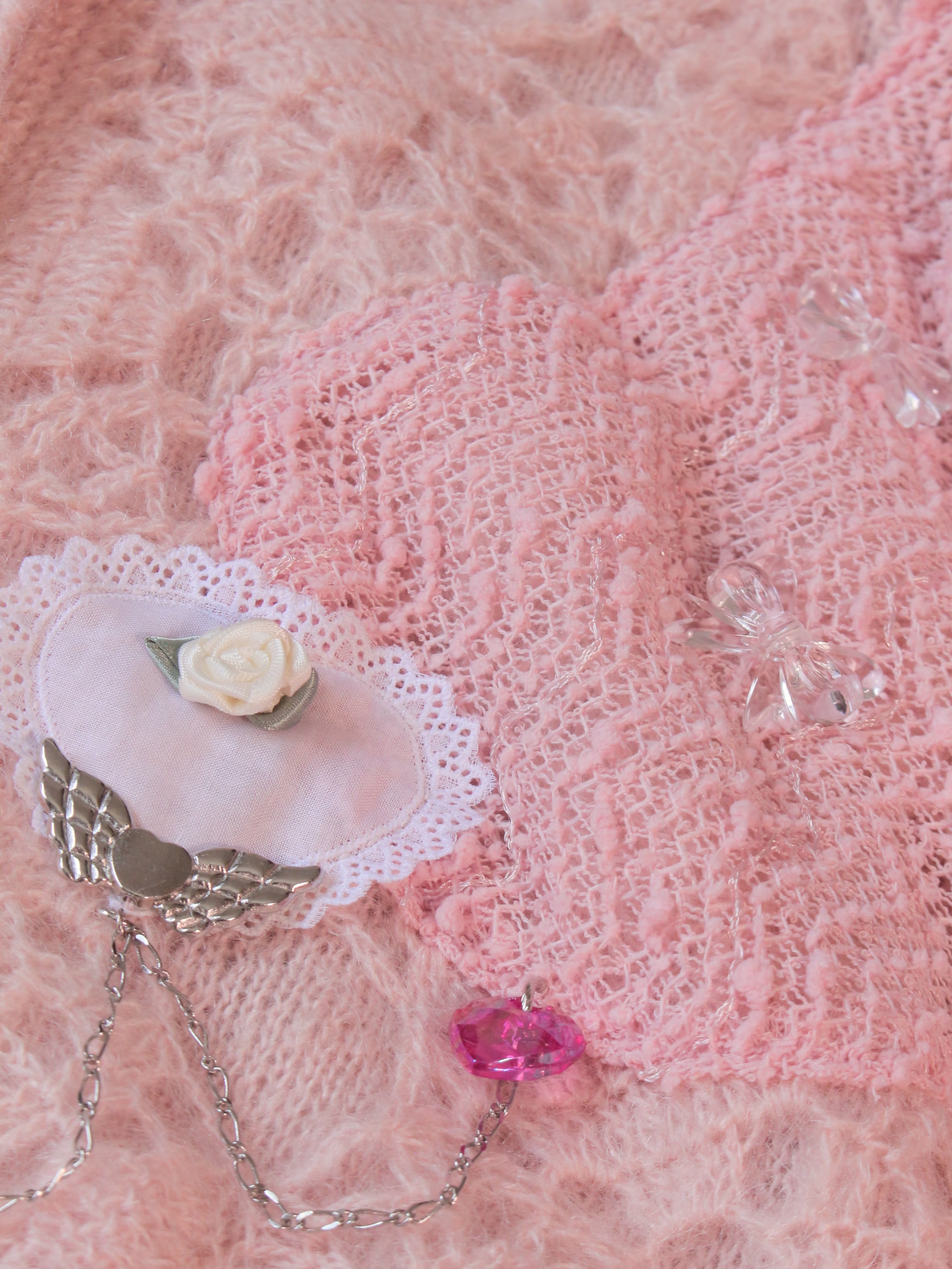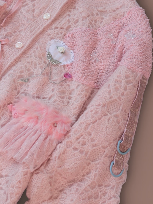 淡いピンクのvintageニットカーデをベースに、キラキラした布地のボレロを解体してトロけるチョコのようにあしらいました。
