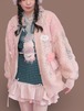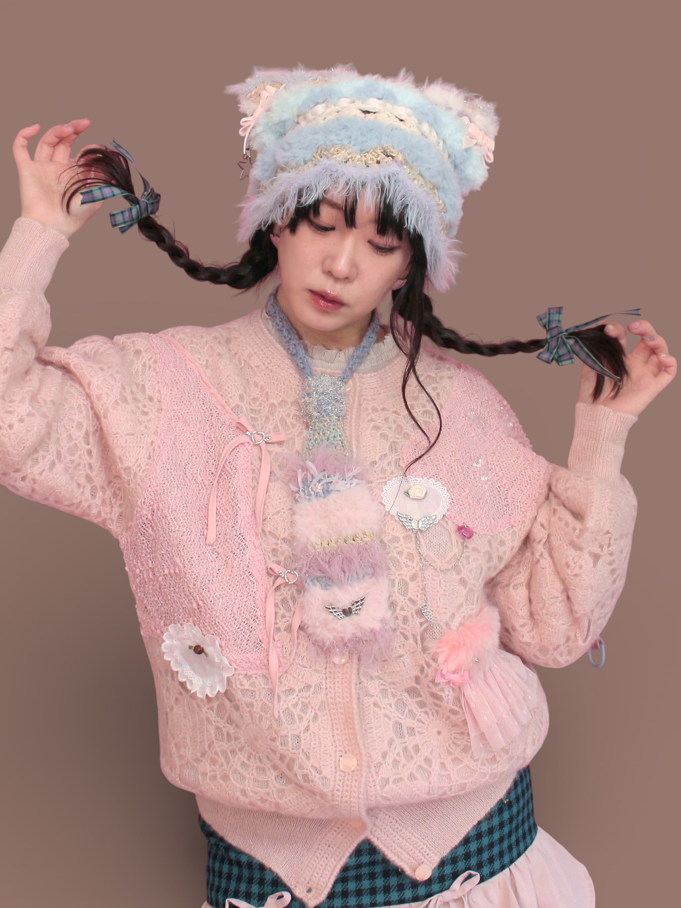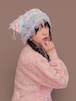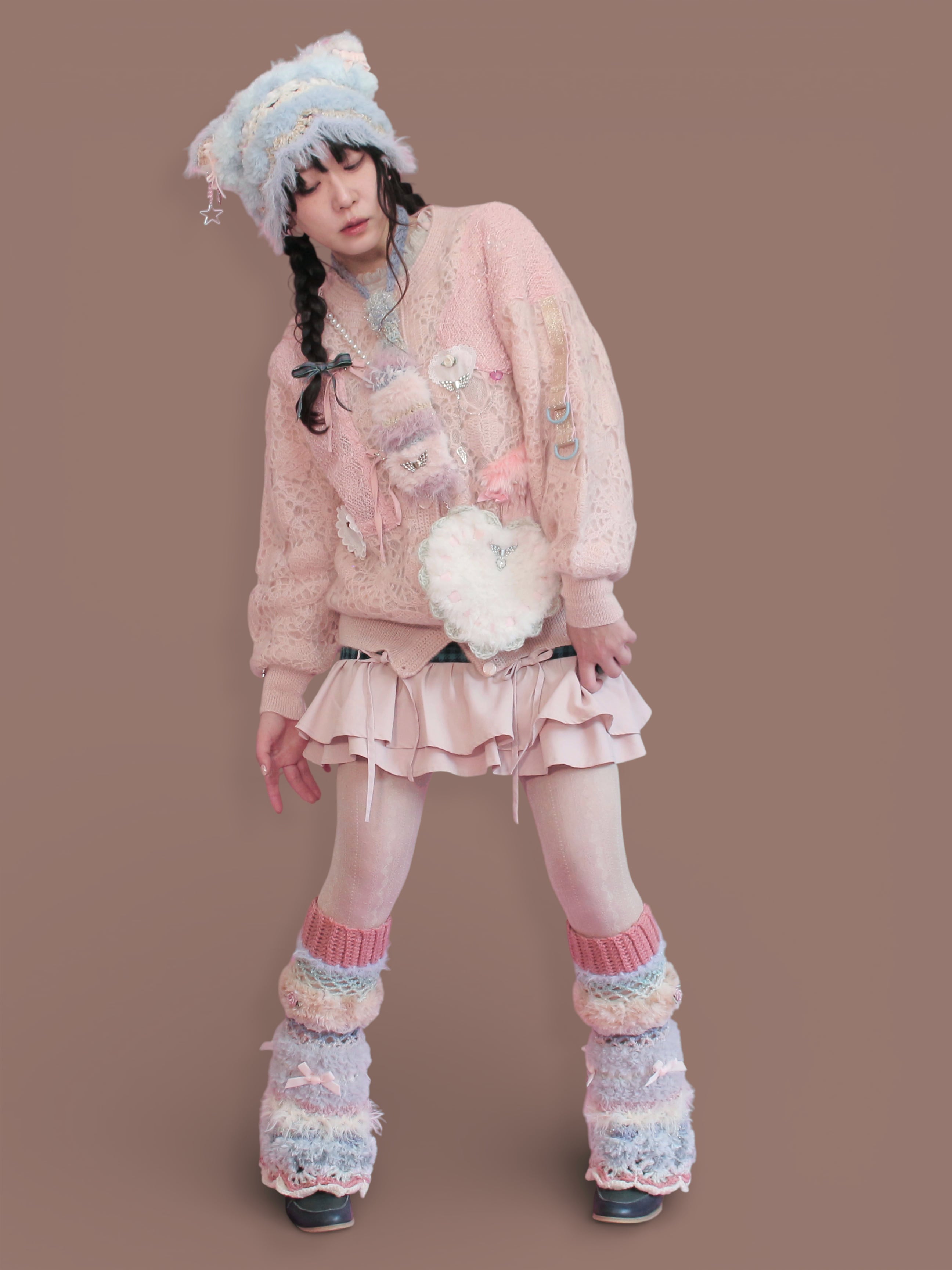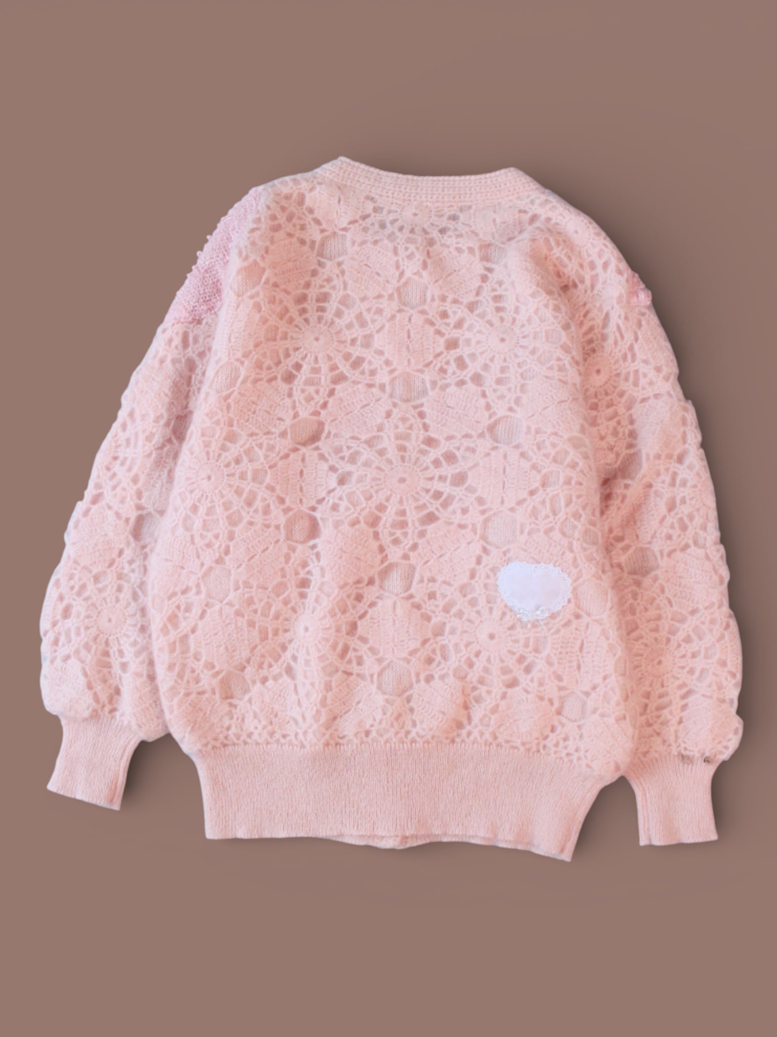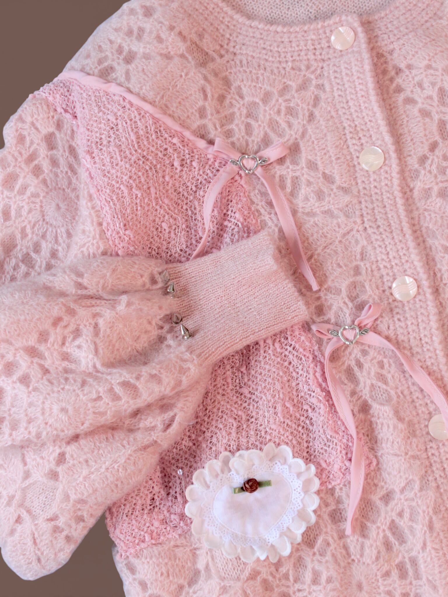 淡いピンクのvintageニットカーデをベースに、キラキラした布地のボレロを解体してトロけるチョコのようにあしらいました。