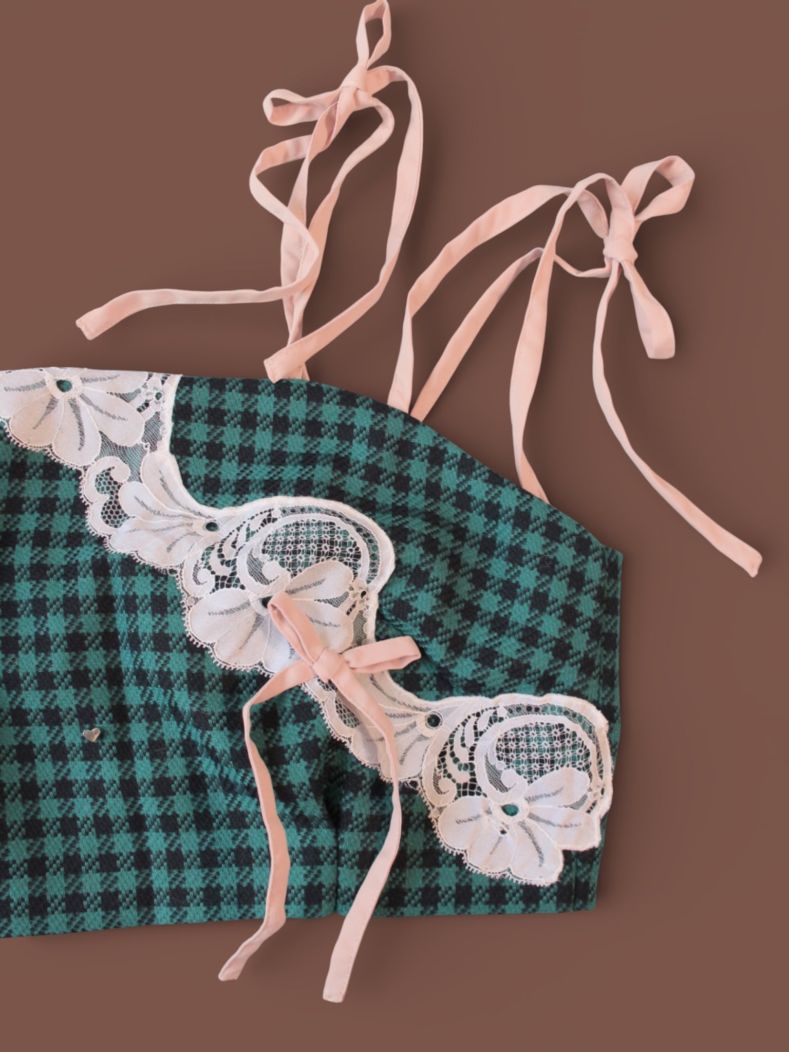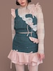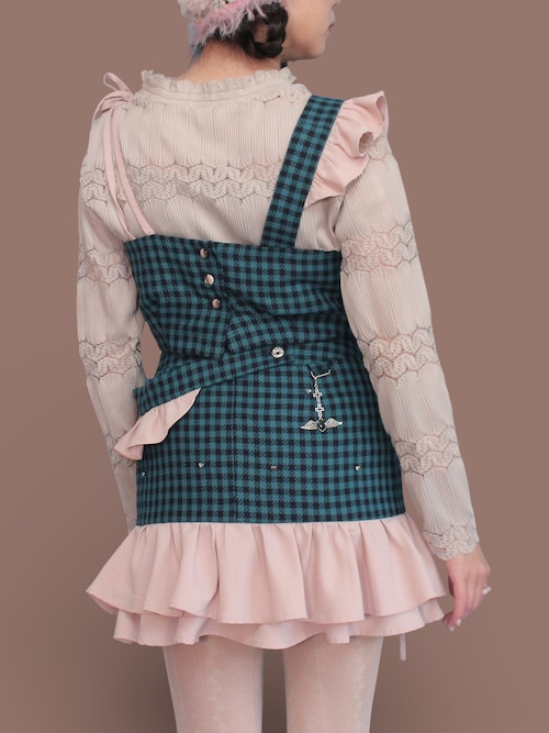 解体した裾部分をドレーピングで0からビスチェに仕立て、別のお洋服のハギレをフリルにして組み合わせました。
