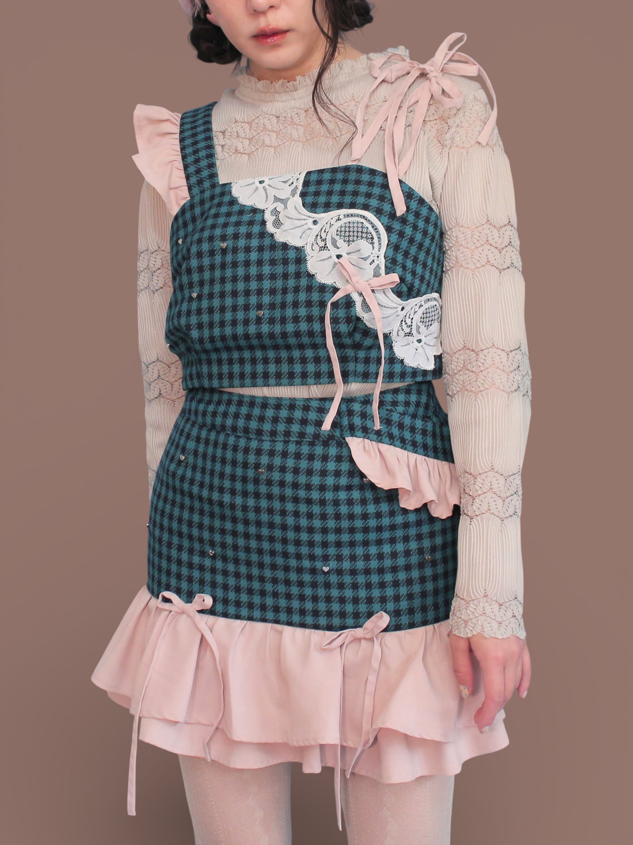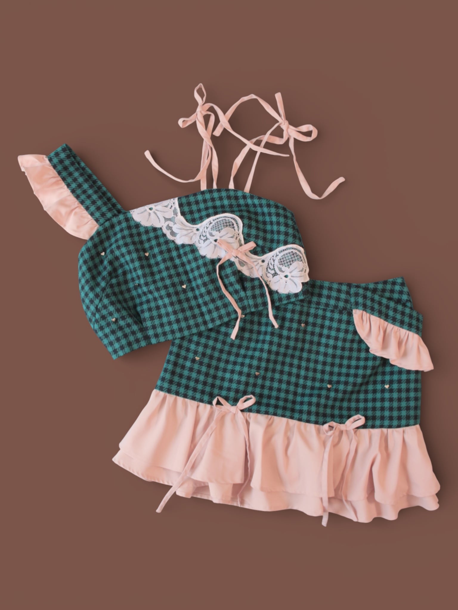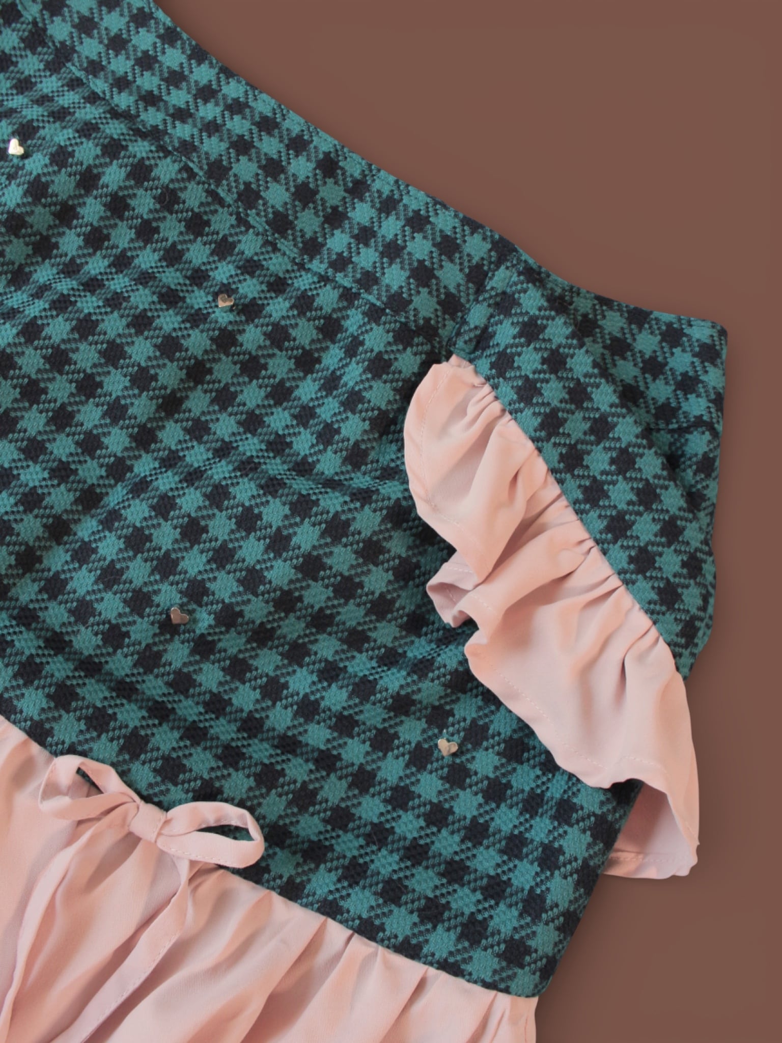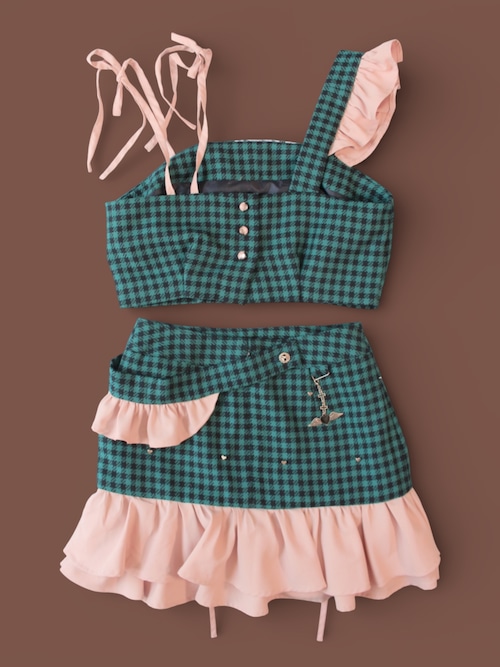 グリーンのチェックにくすんだピンクの組み合わせがかわいいセットアップです。
