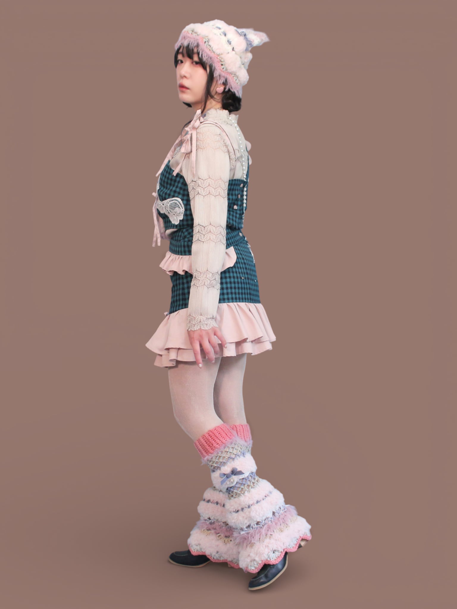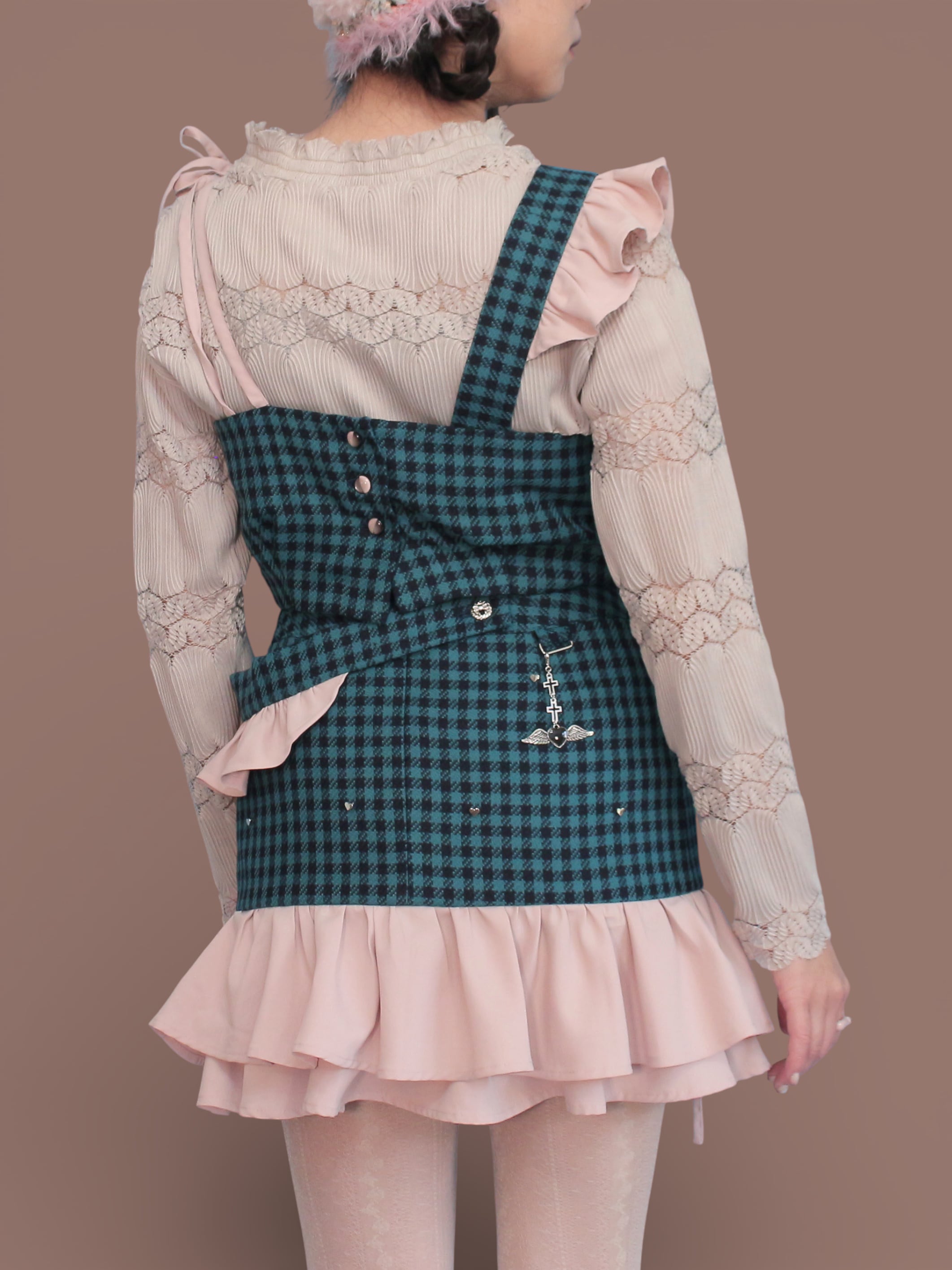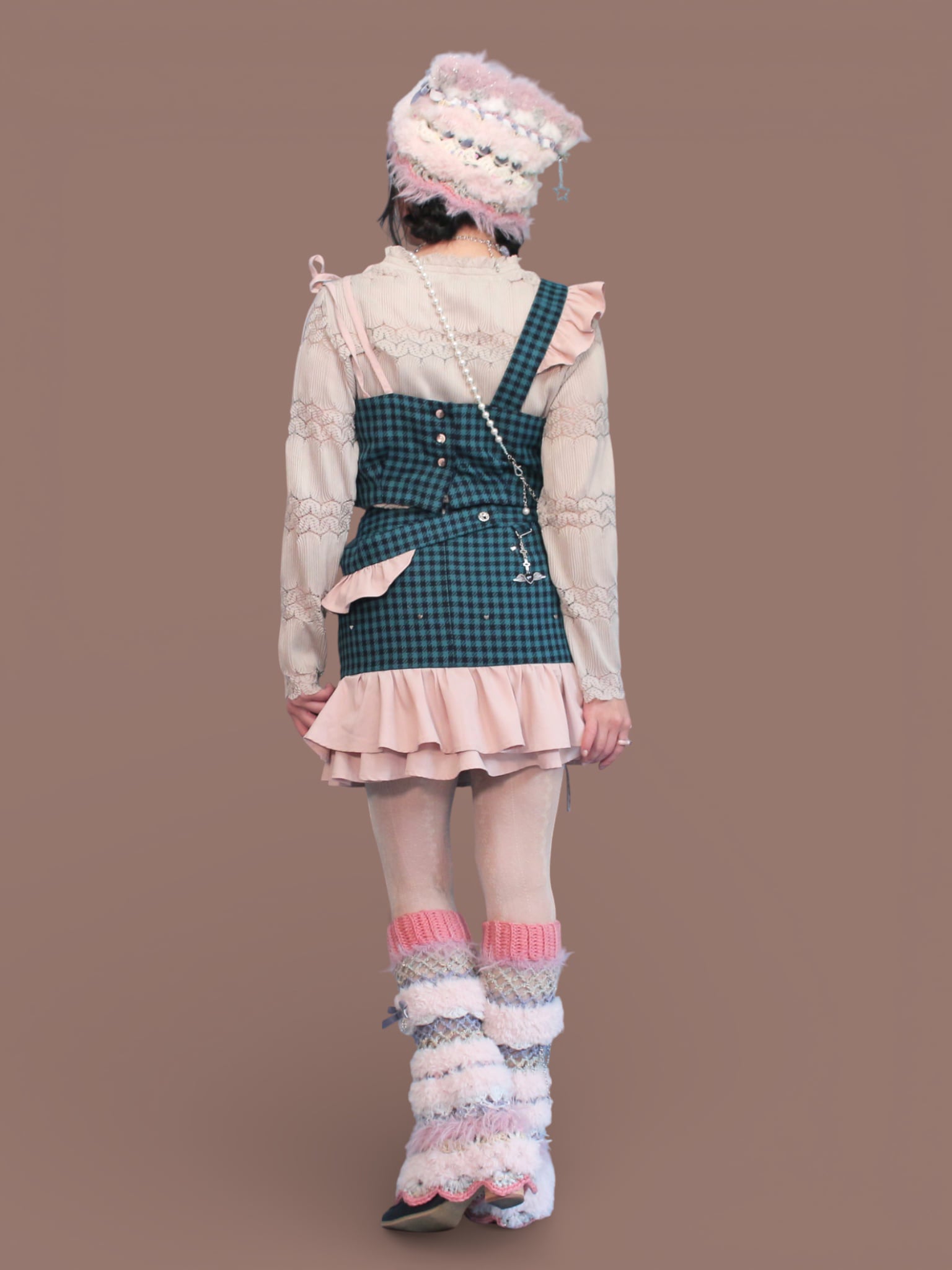 グリーンのチェックにくすんだピンクの組み合わせがかわいいセットアップです。