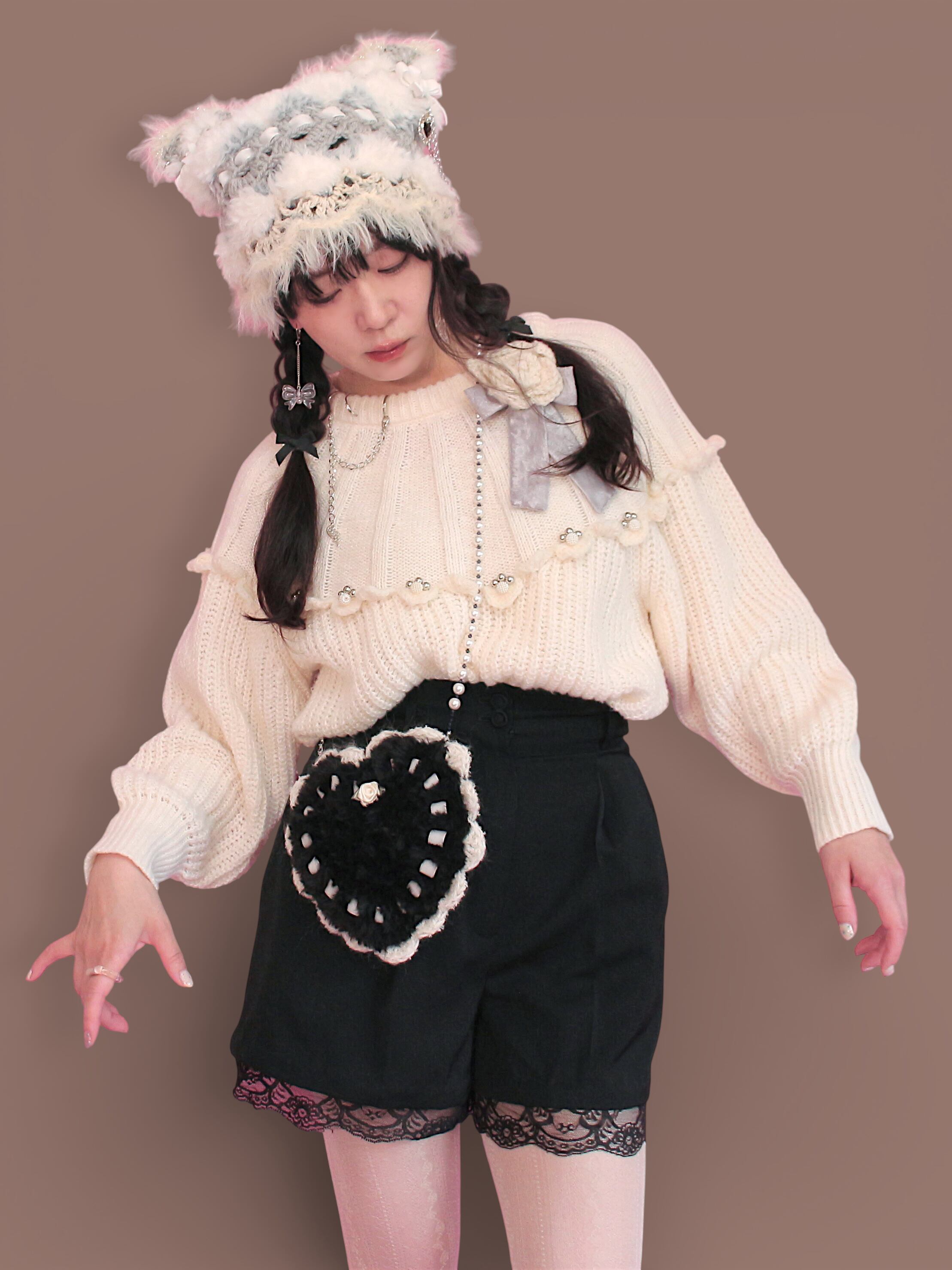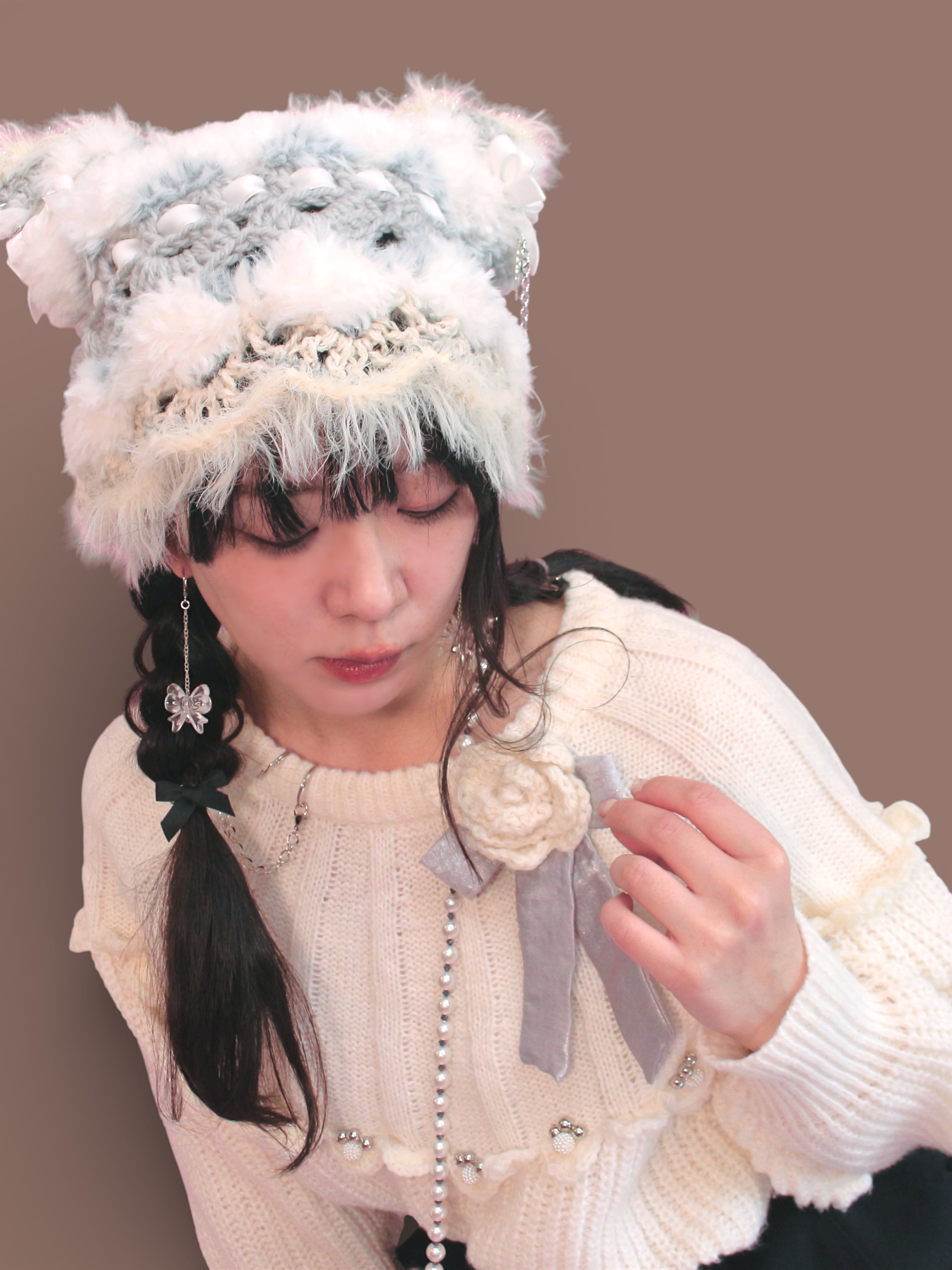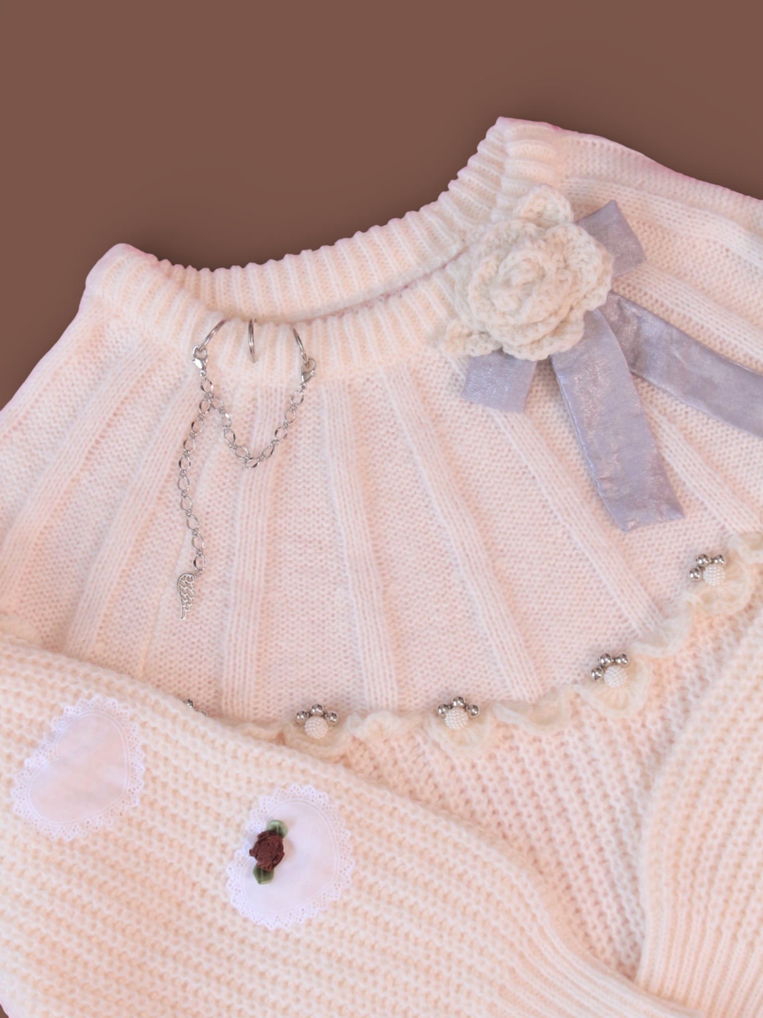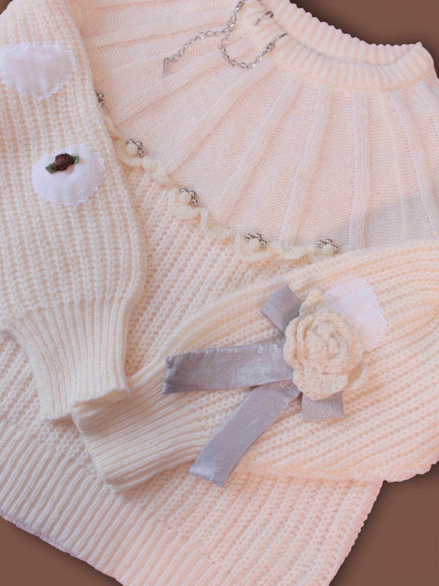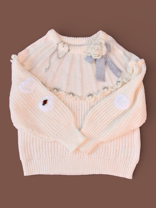 ブローチとチャームが取り外せるオフホワイトのニットです。