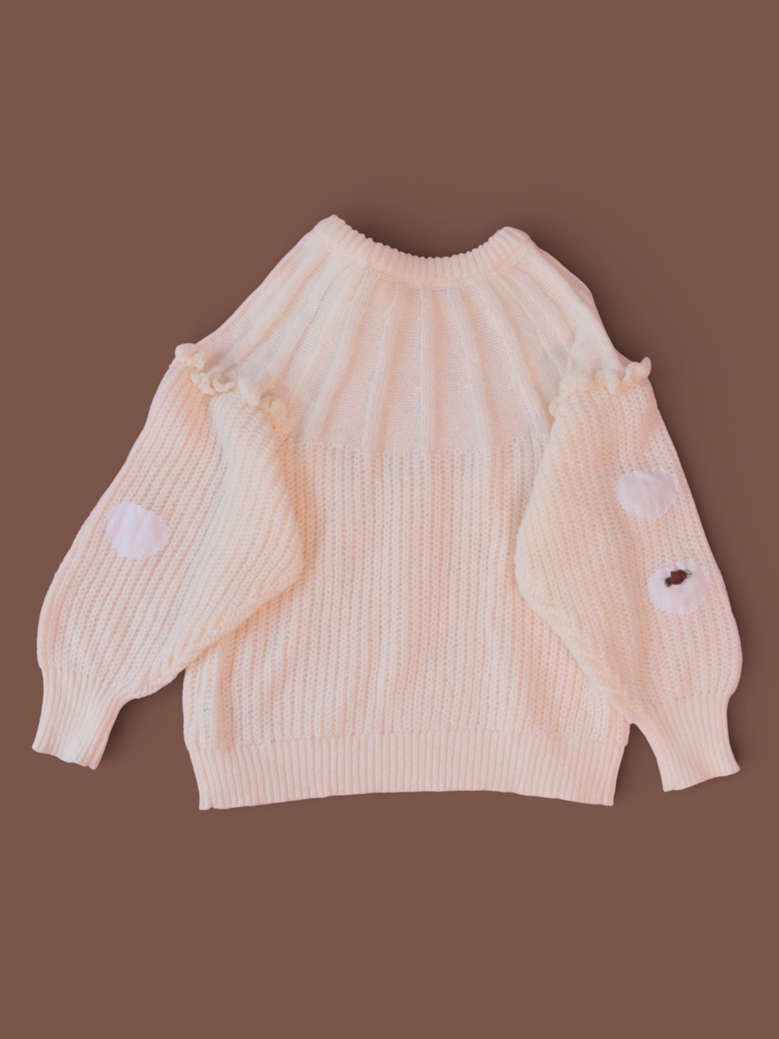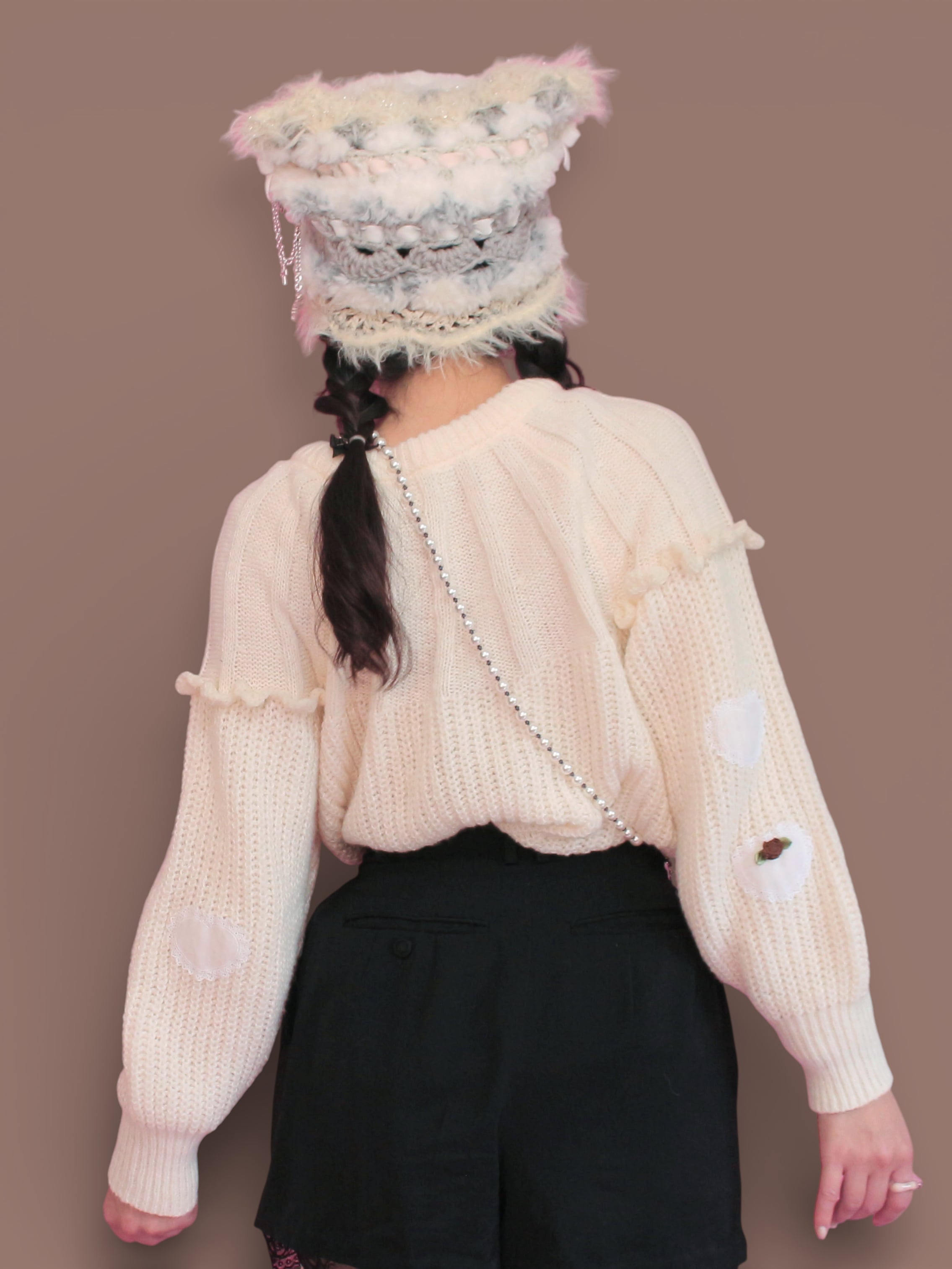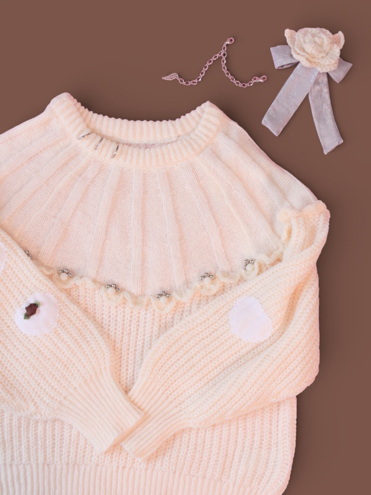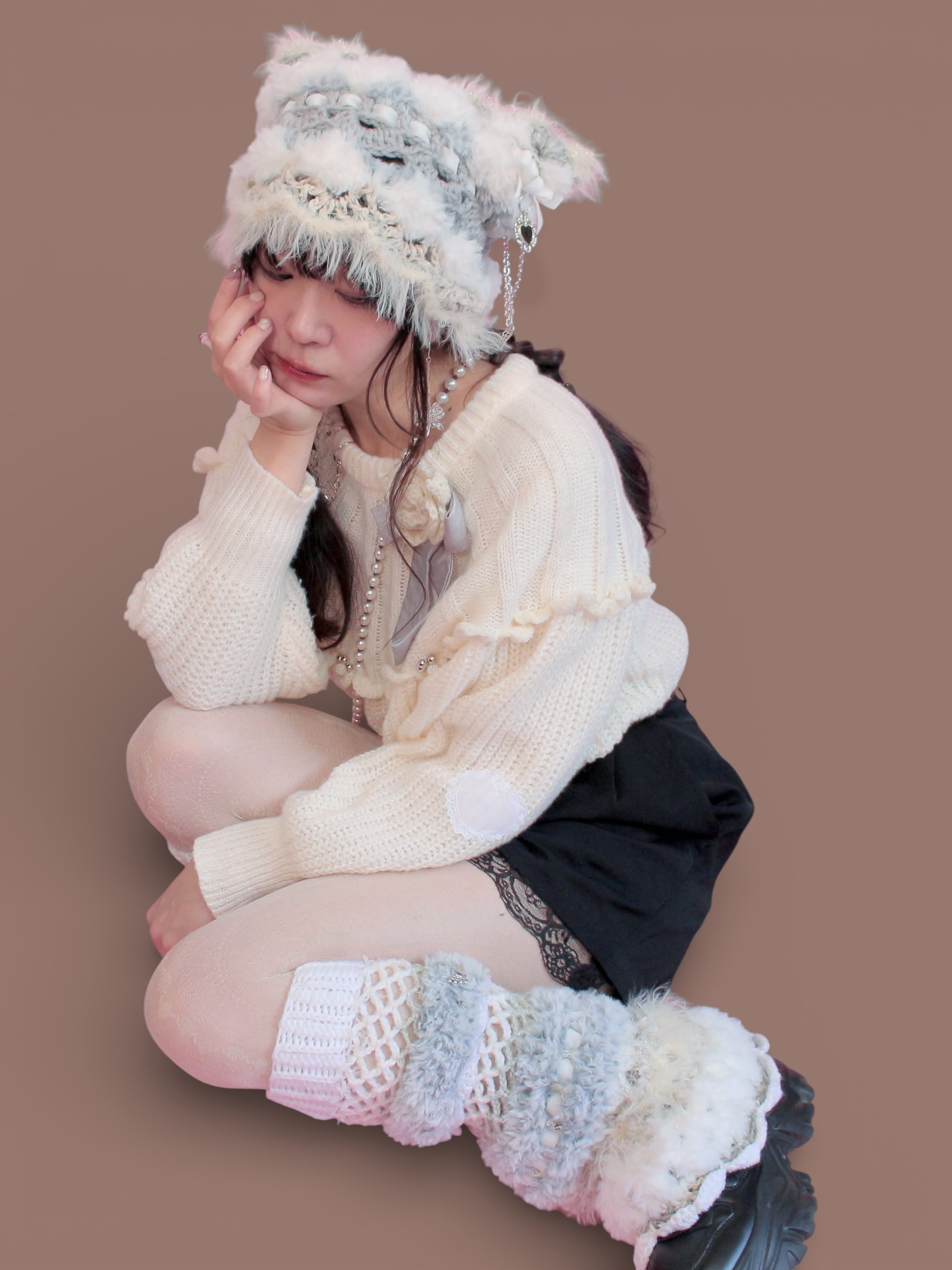 ブローチとチャームが取り外せるオフホワイトのニットです。