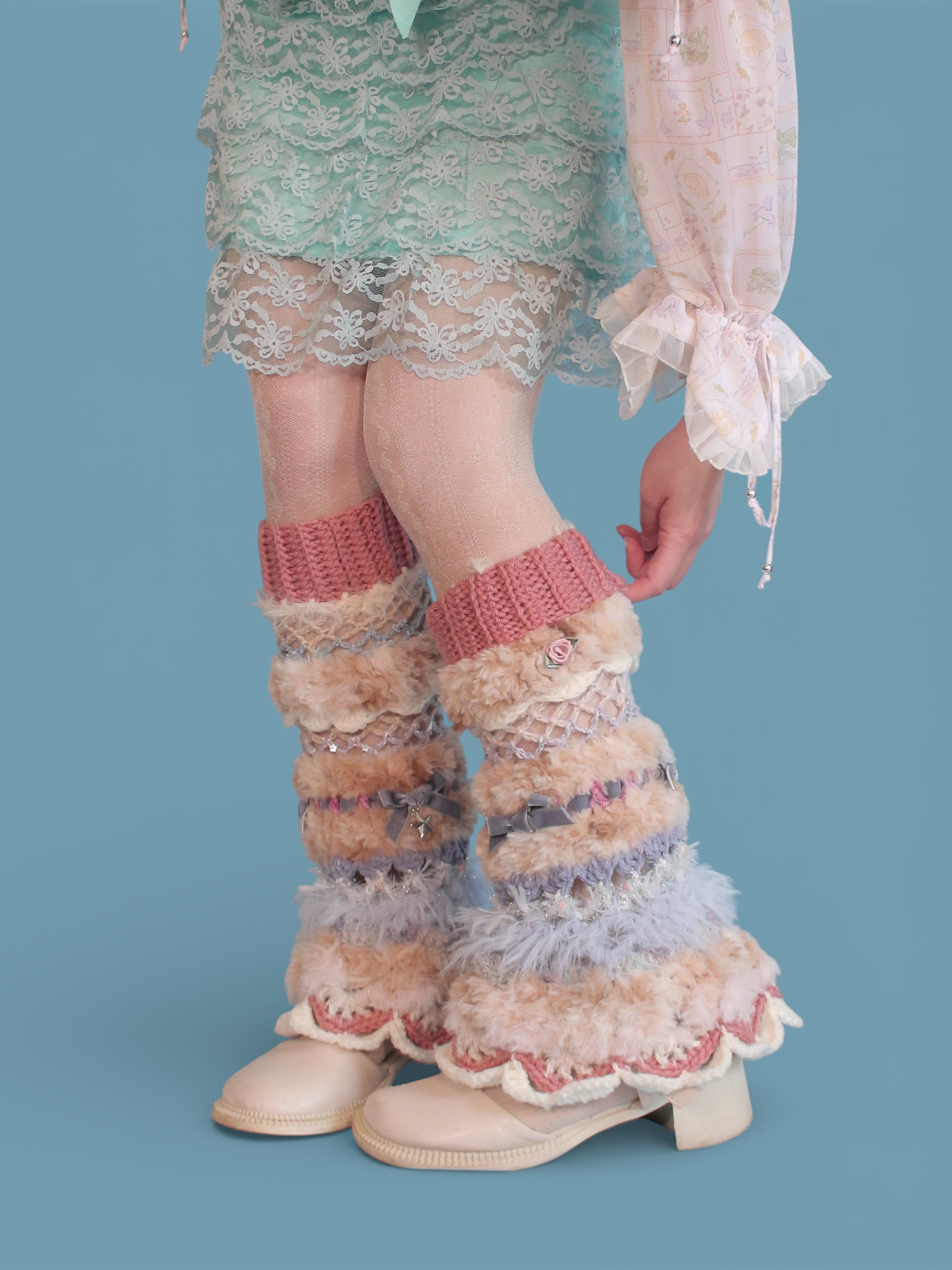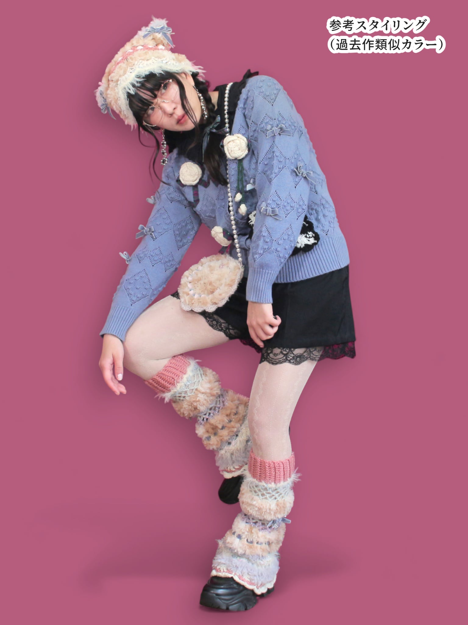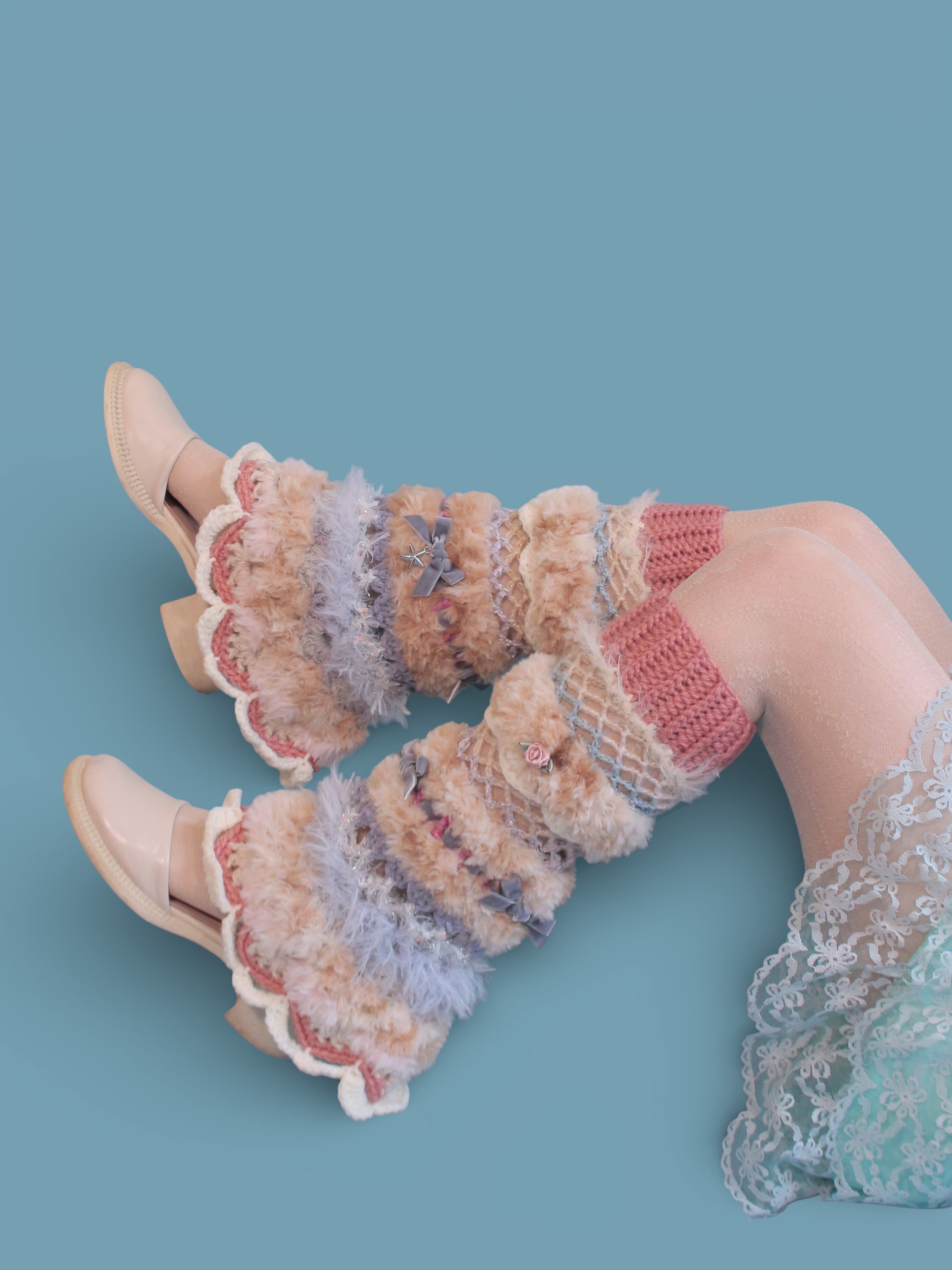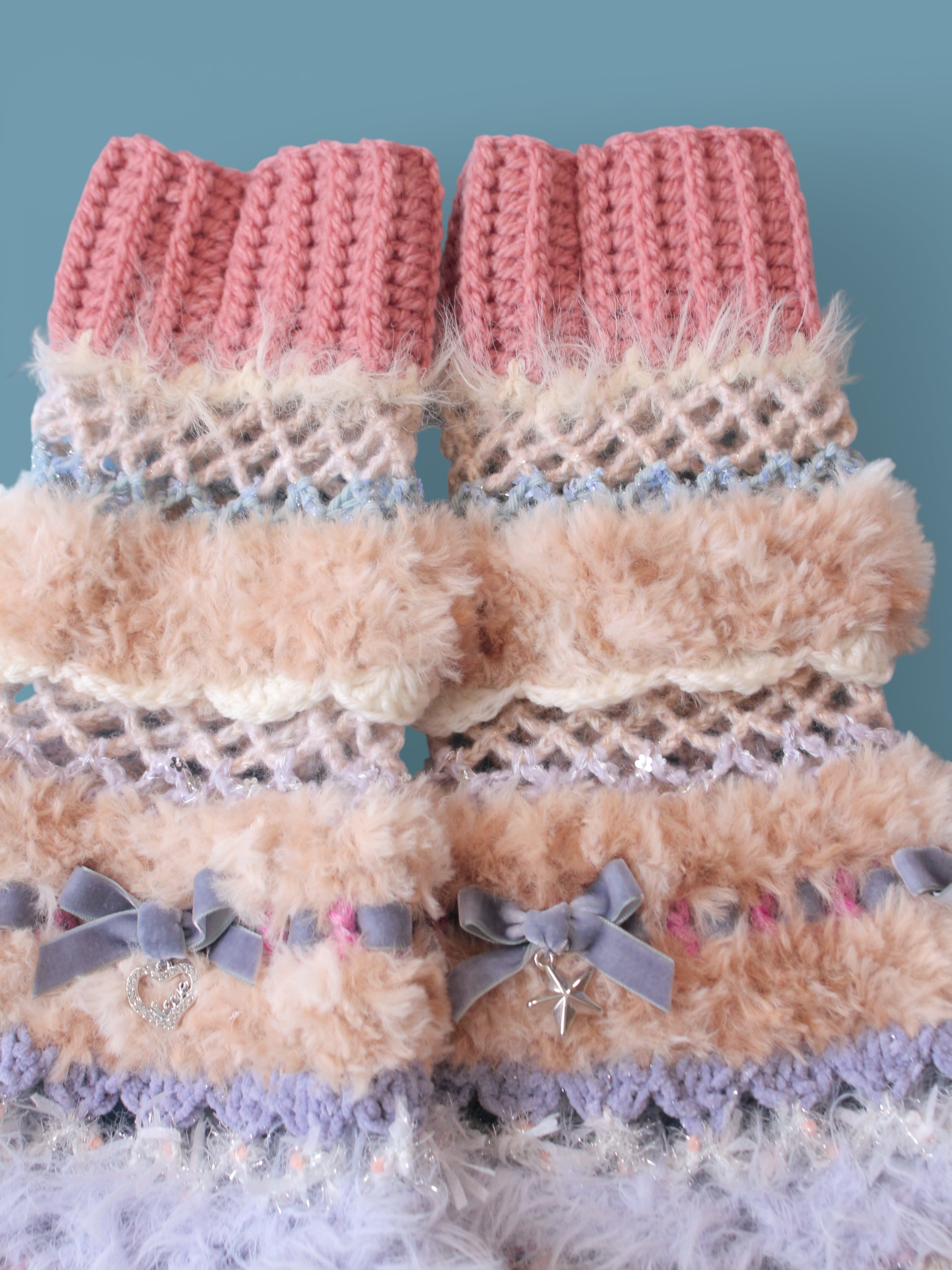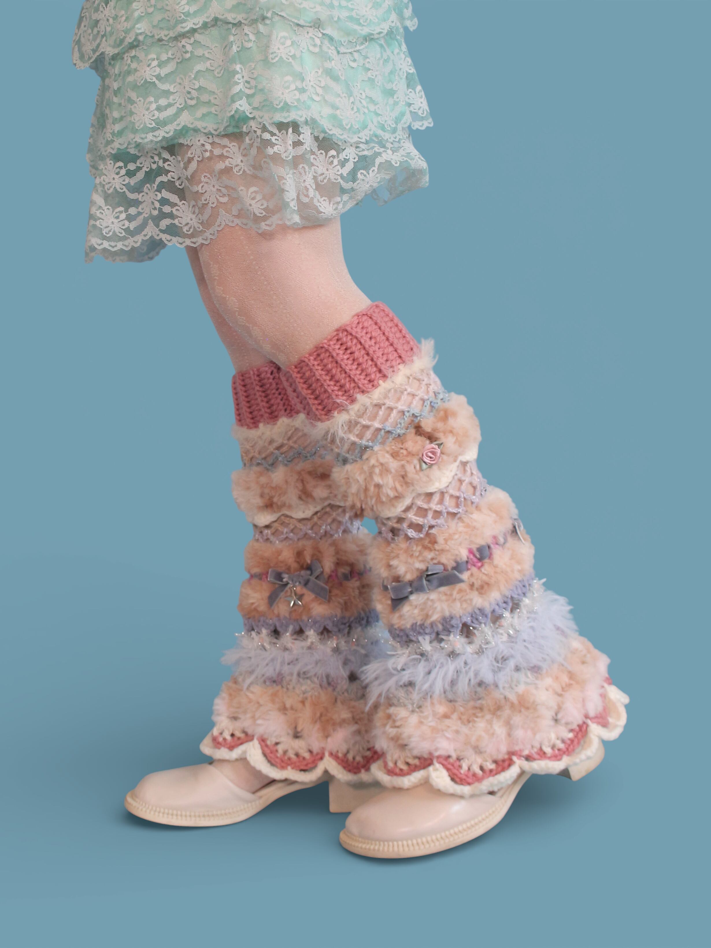 様々な糸を組み合わせたハンドニットのレッグウォーマーです。