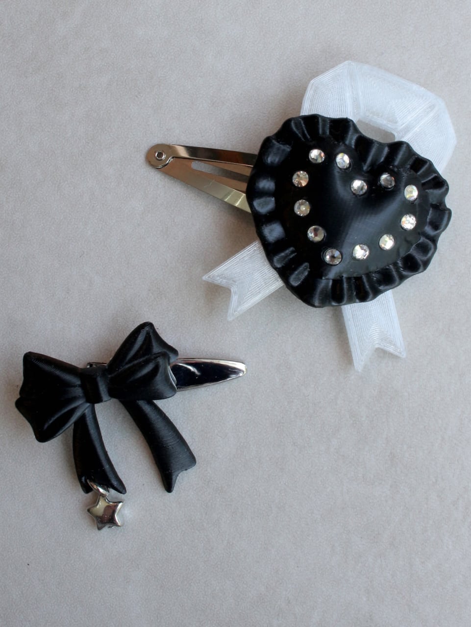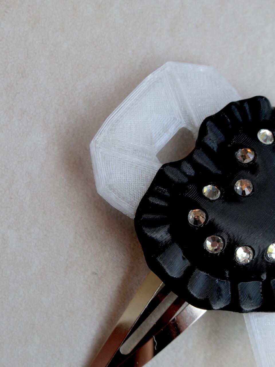 モデリング→出力→背面のバリ処理→組み立てパーツとラインストーン接着→ピン装着・・・と、たくさんの工程を経て、ひとつひとつ手作業で仕上げていくお品です。
