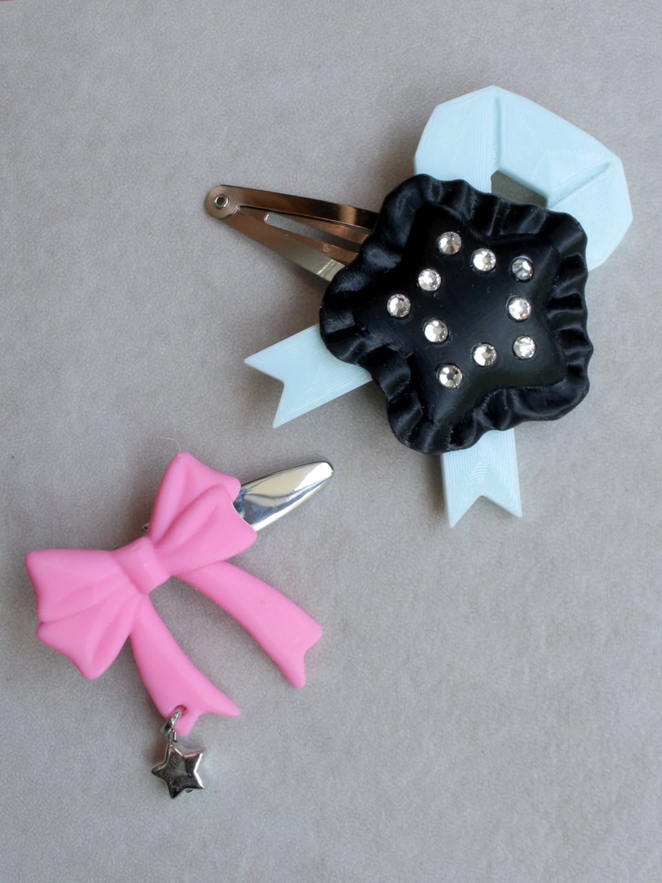 モデリング→出力→背面のバリ処理→組み立てパーツとラインストーン接着→ピン装着・・・と、たくさんの工程を経て、ひとつひとつ手作業で仕上げていくお品です。