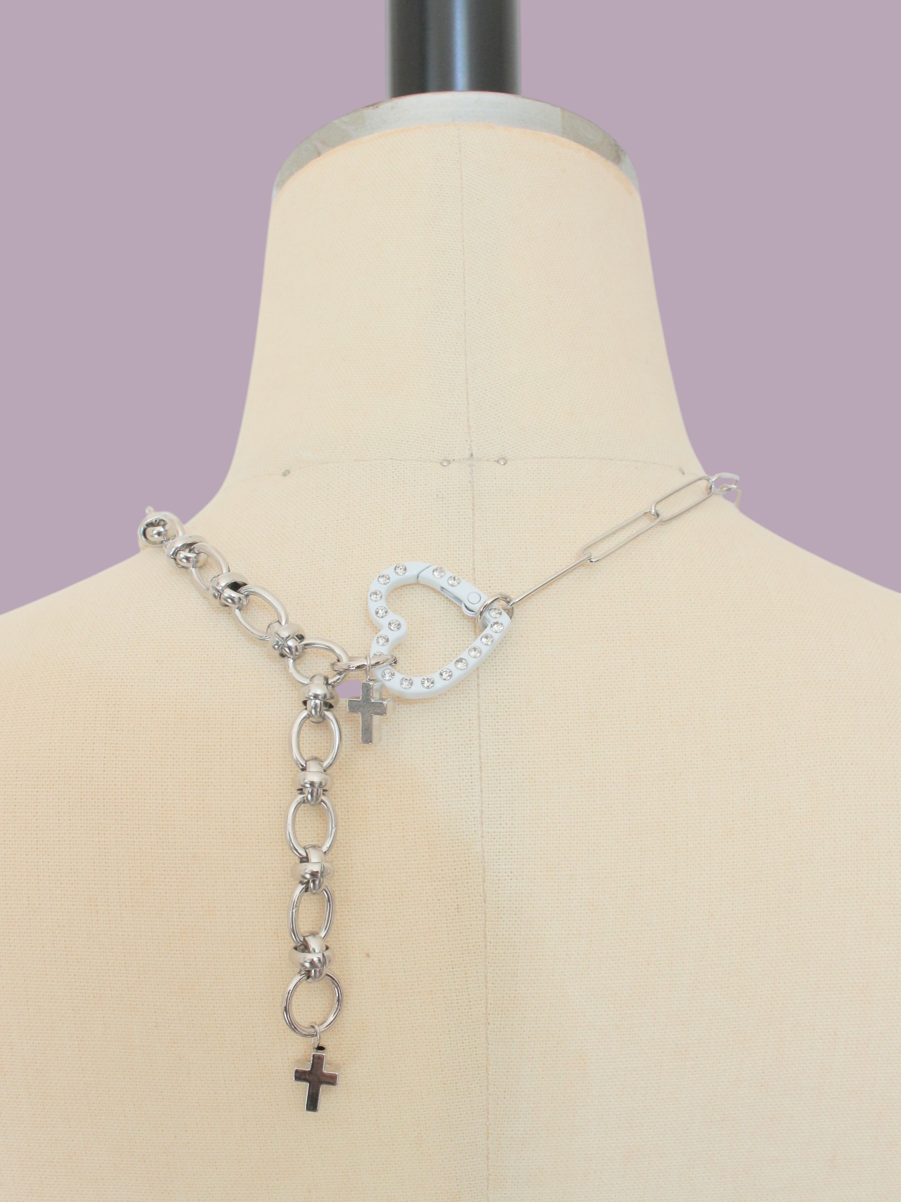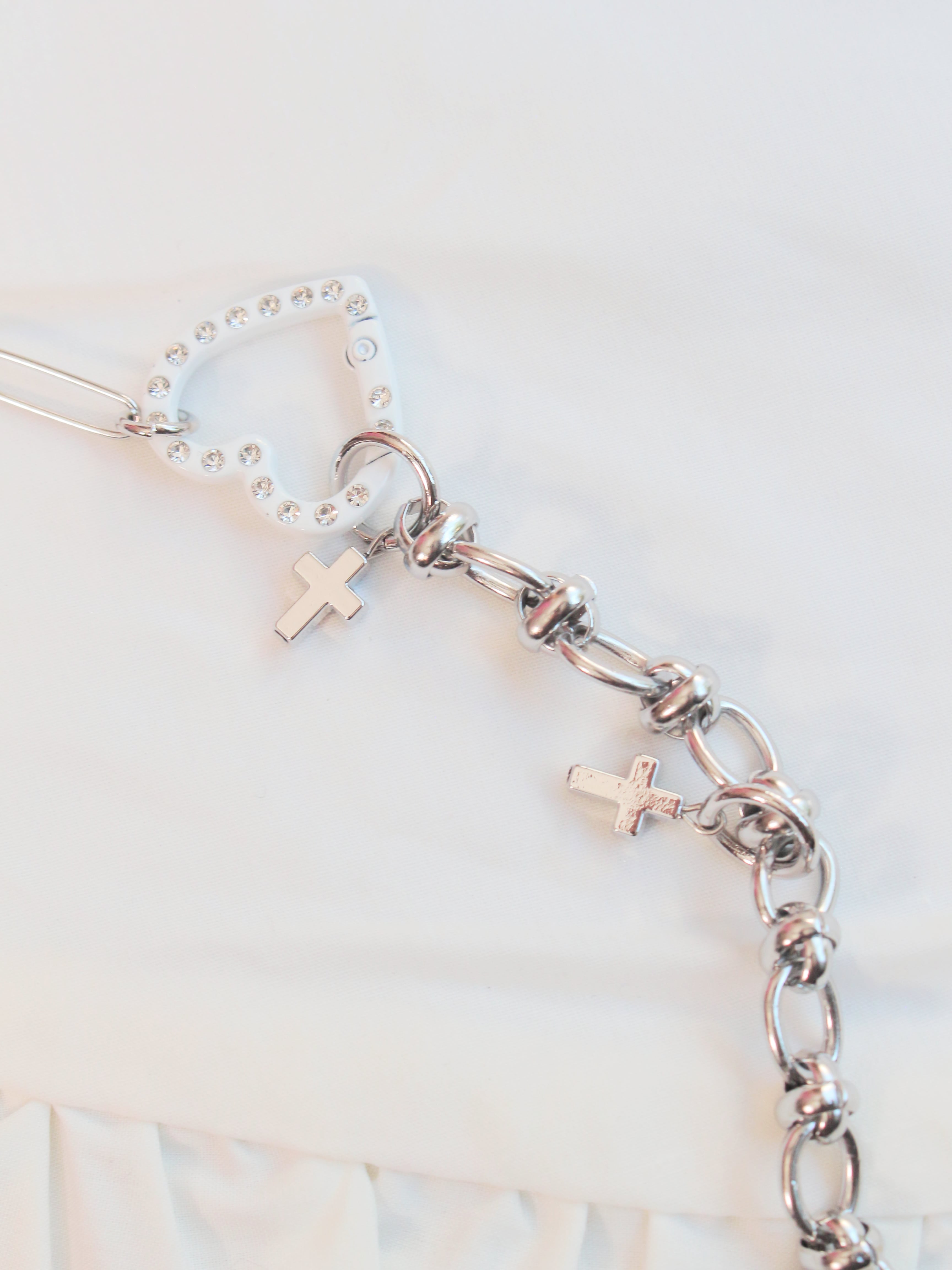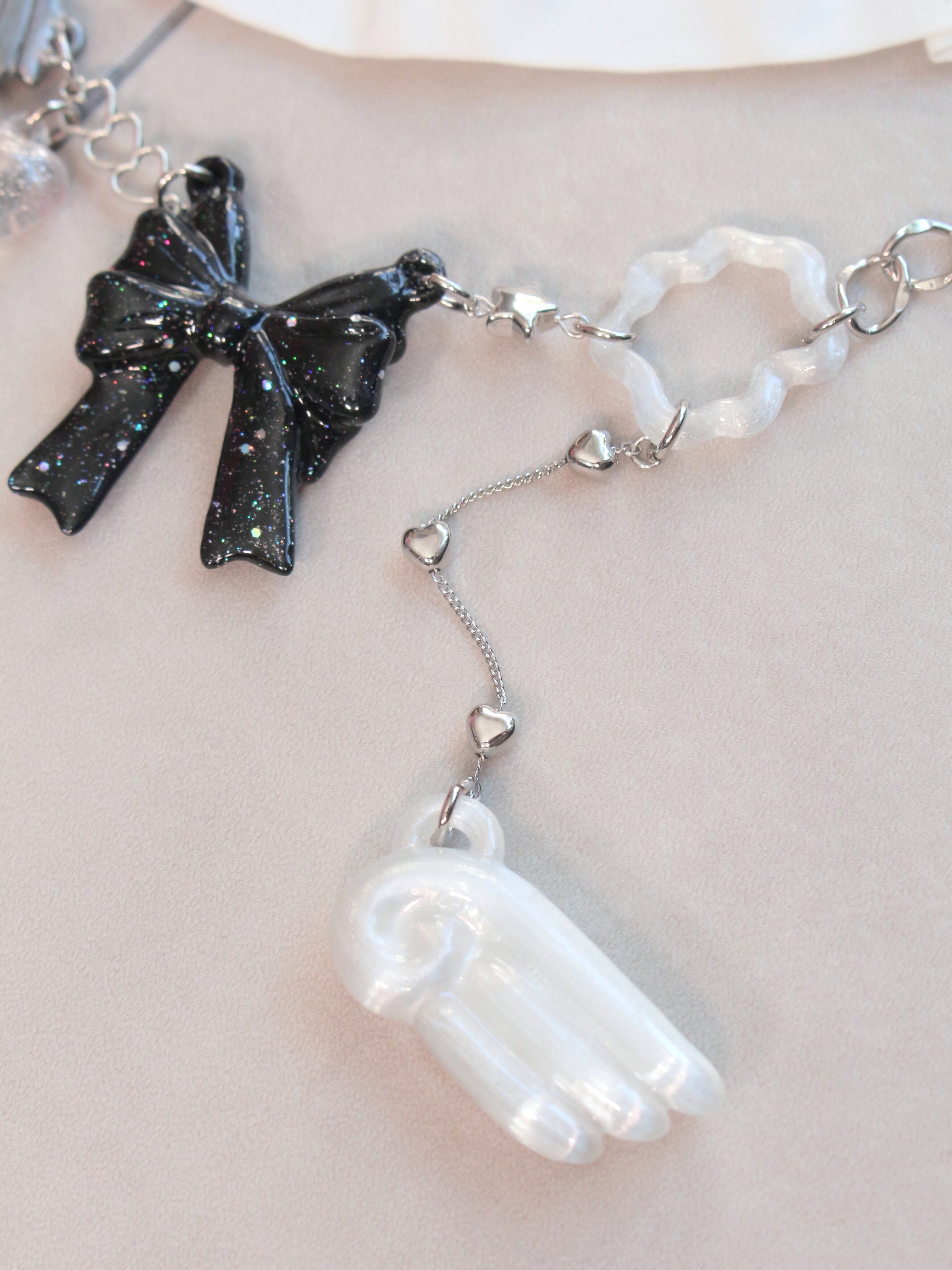 長さは後ろについた白いハートと、反対側の輪っかで2段階に調整できます。