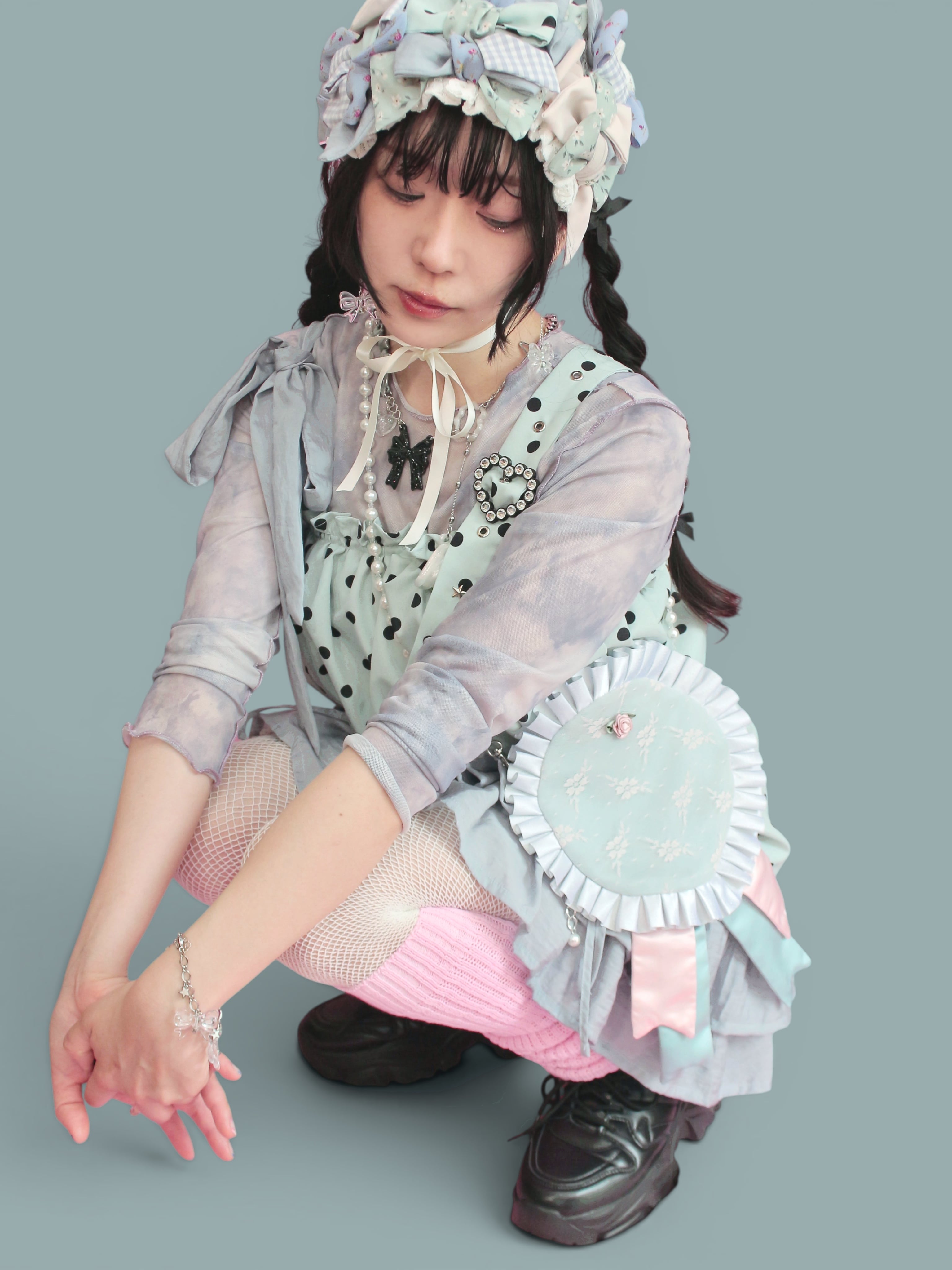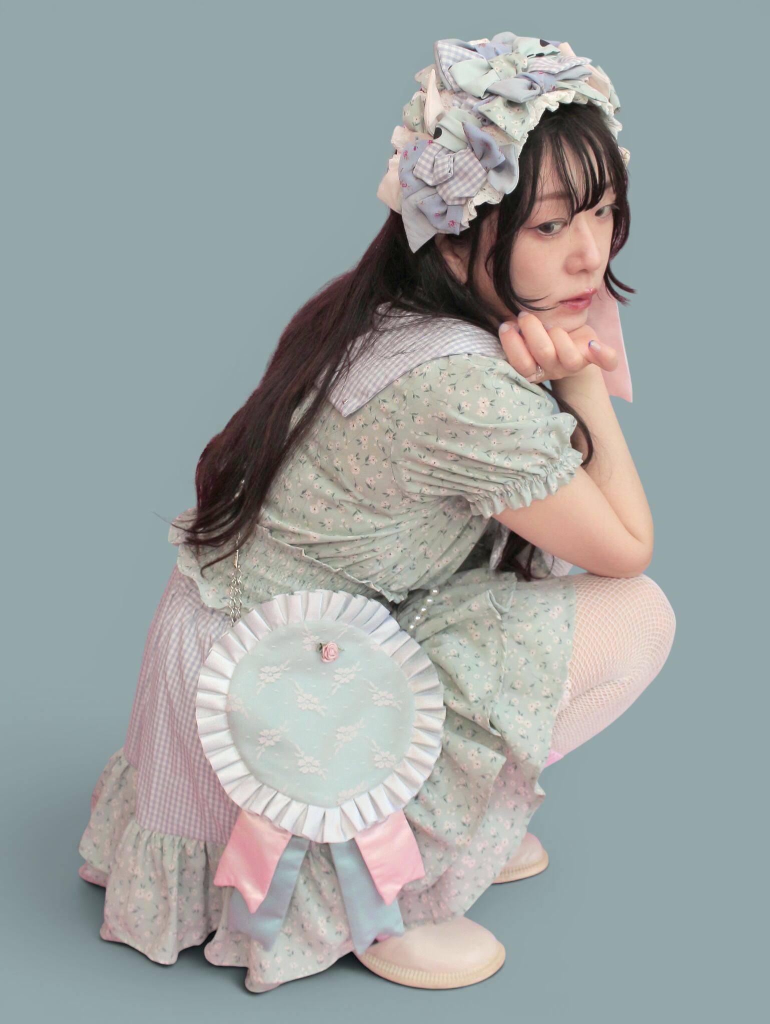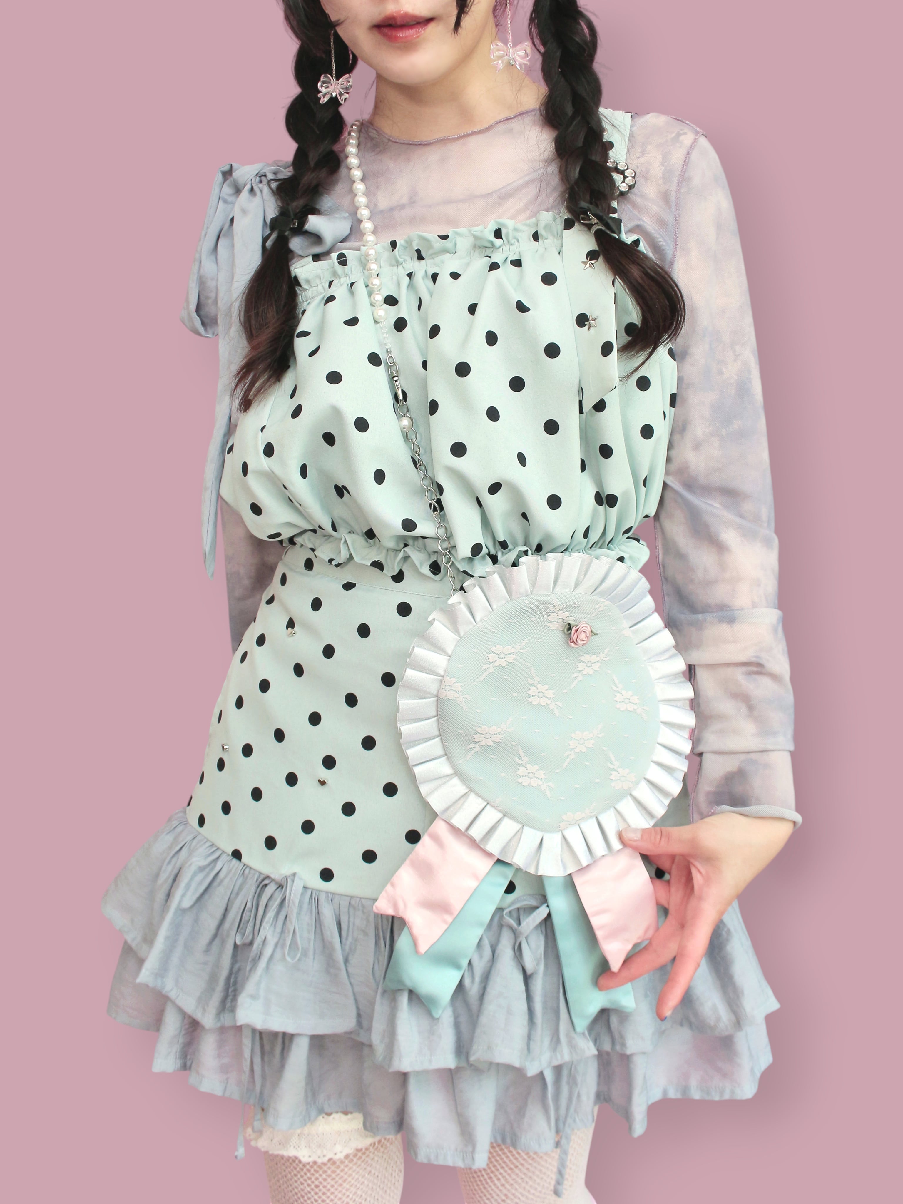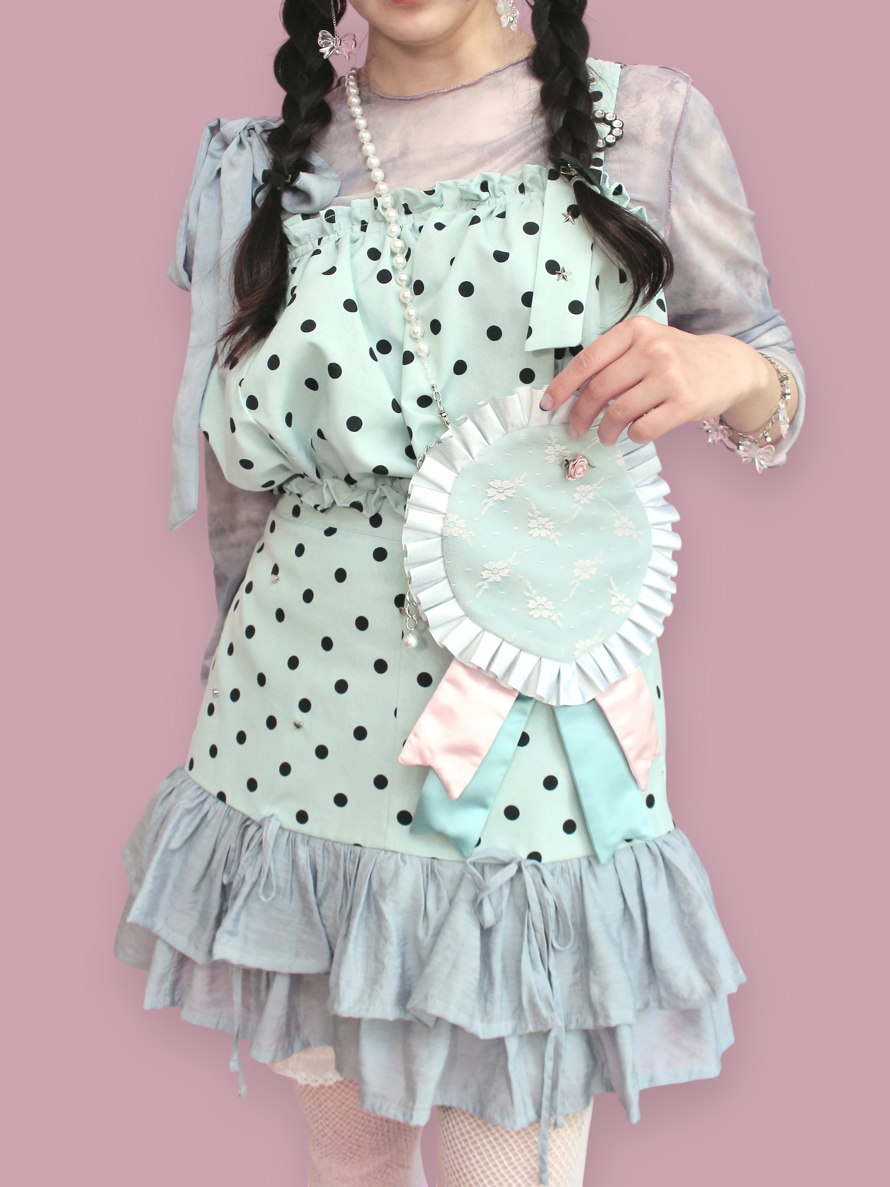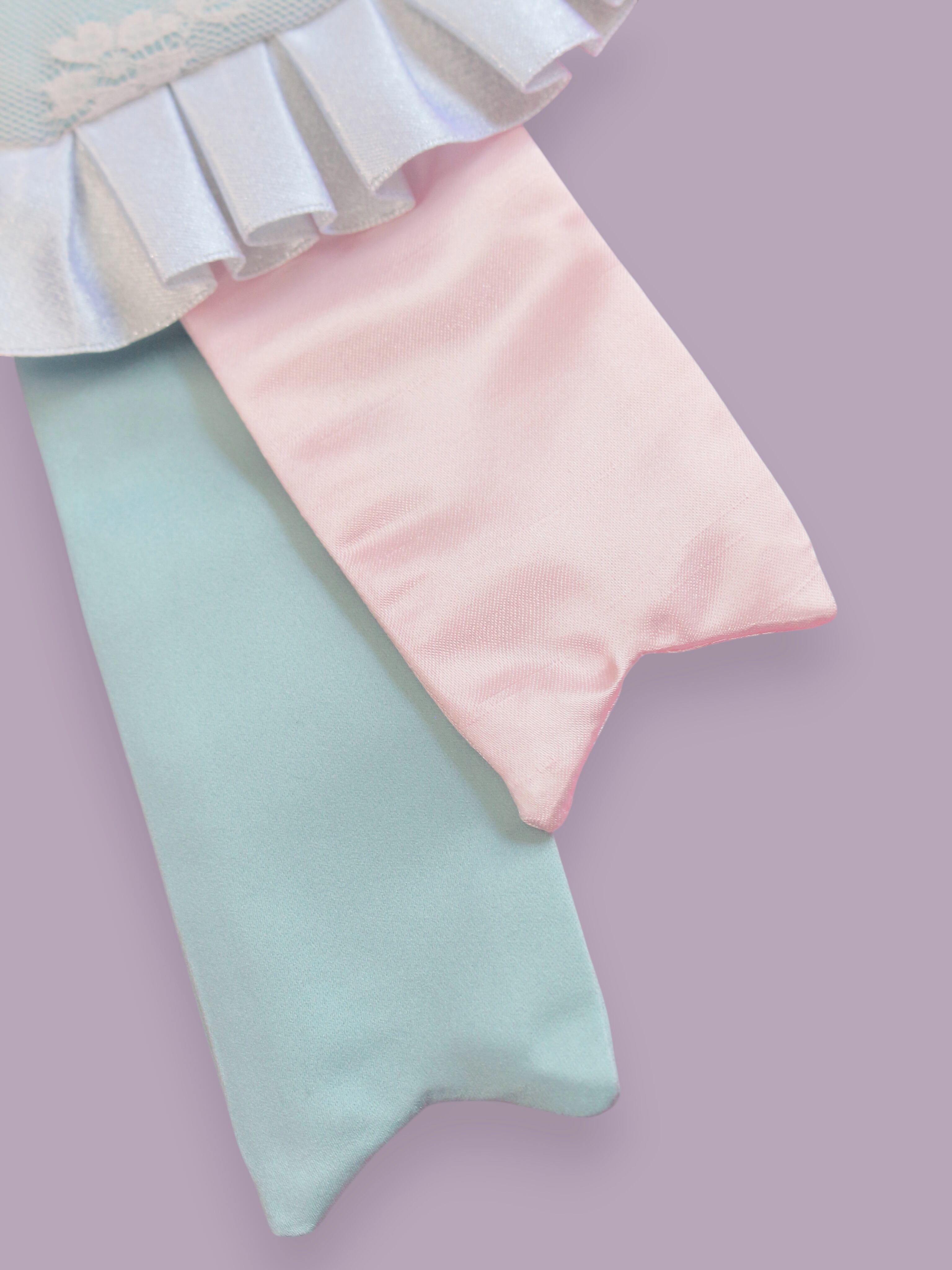 リメイクで生まれたハギレやお気に入りの布たちを組み合わせ、キラキララメ入りのフリルを飾りました。