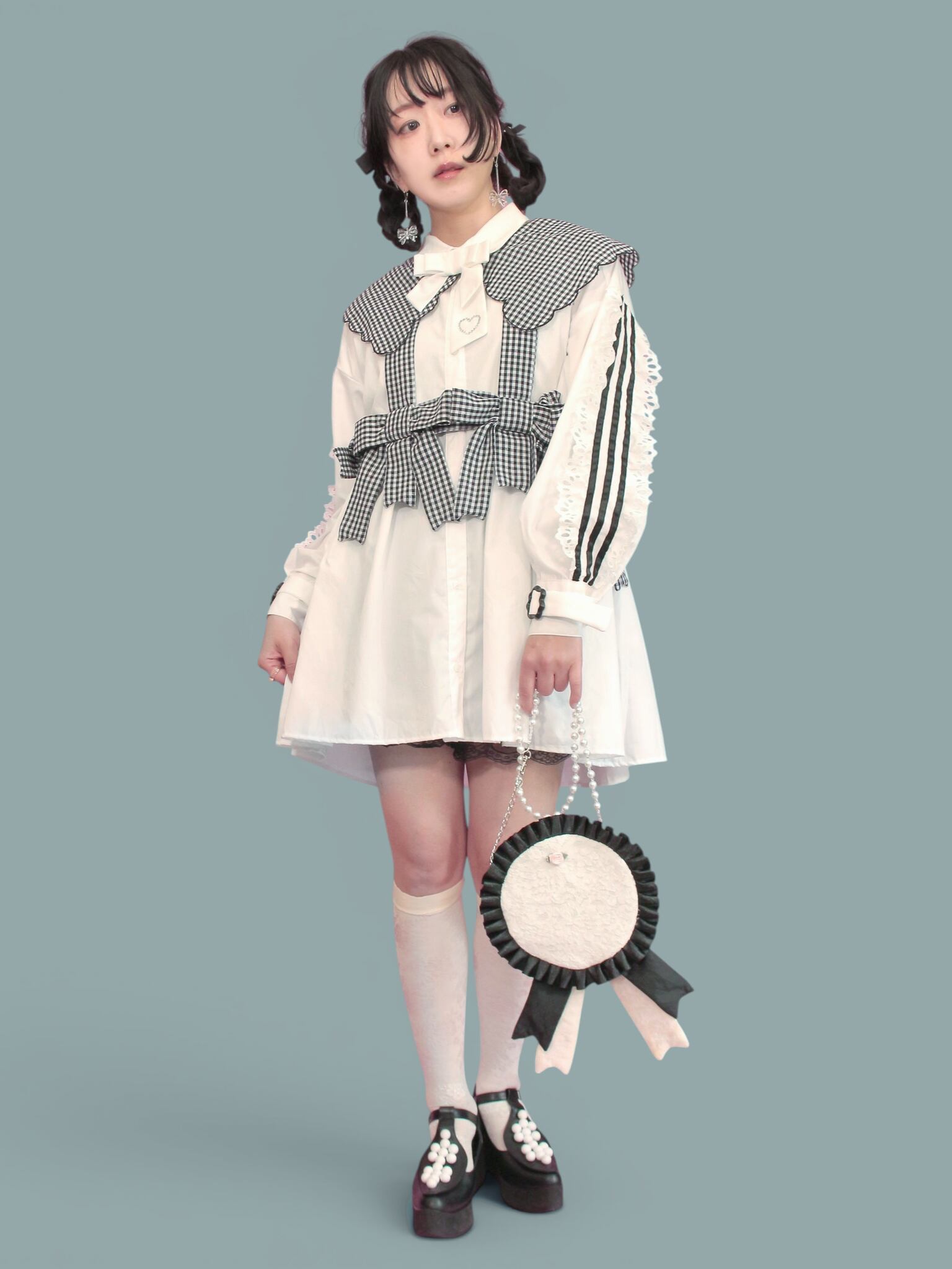 リメイクで生まれたハギレやお気に入りの布たちを組み合わせ、キラキララメ入りのフリルを飾りました。