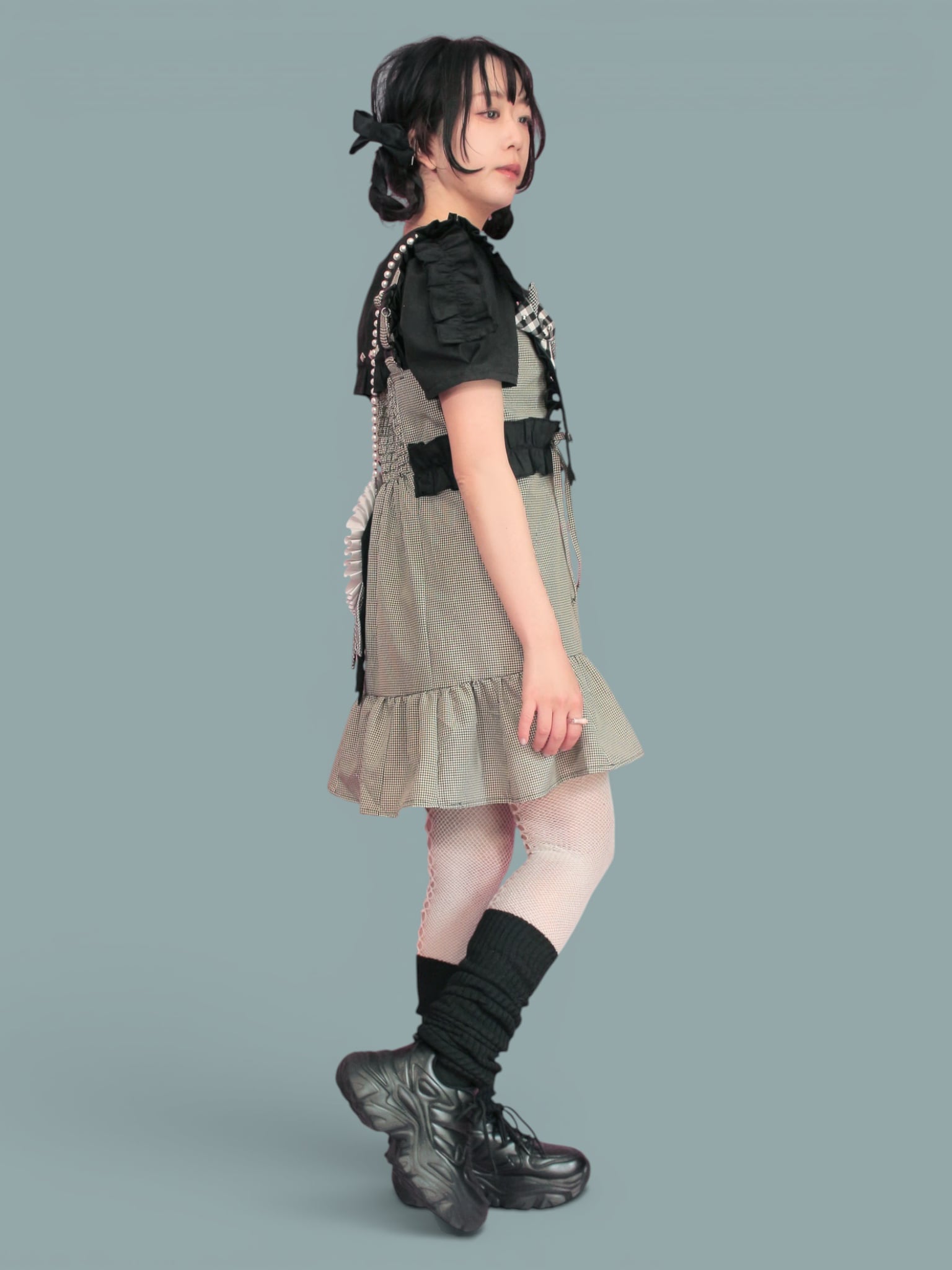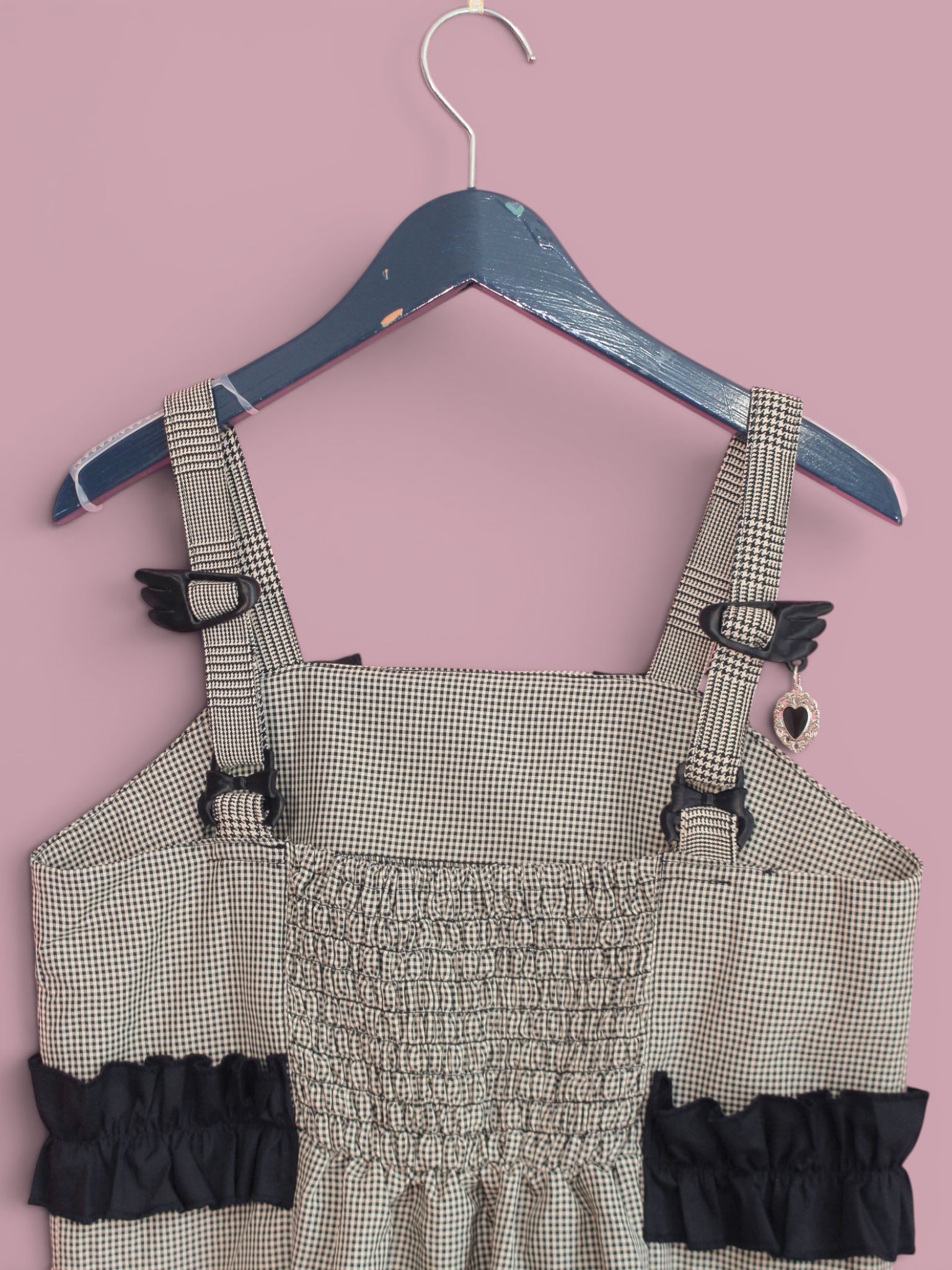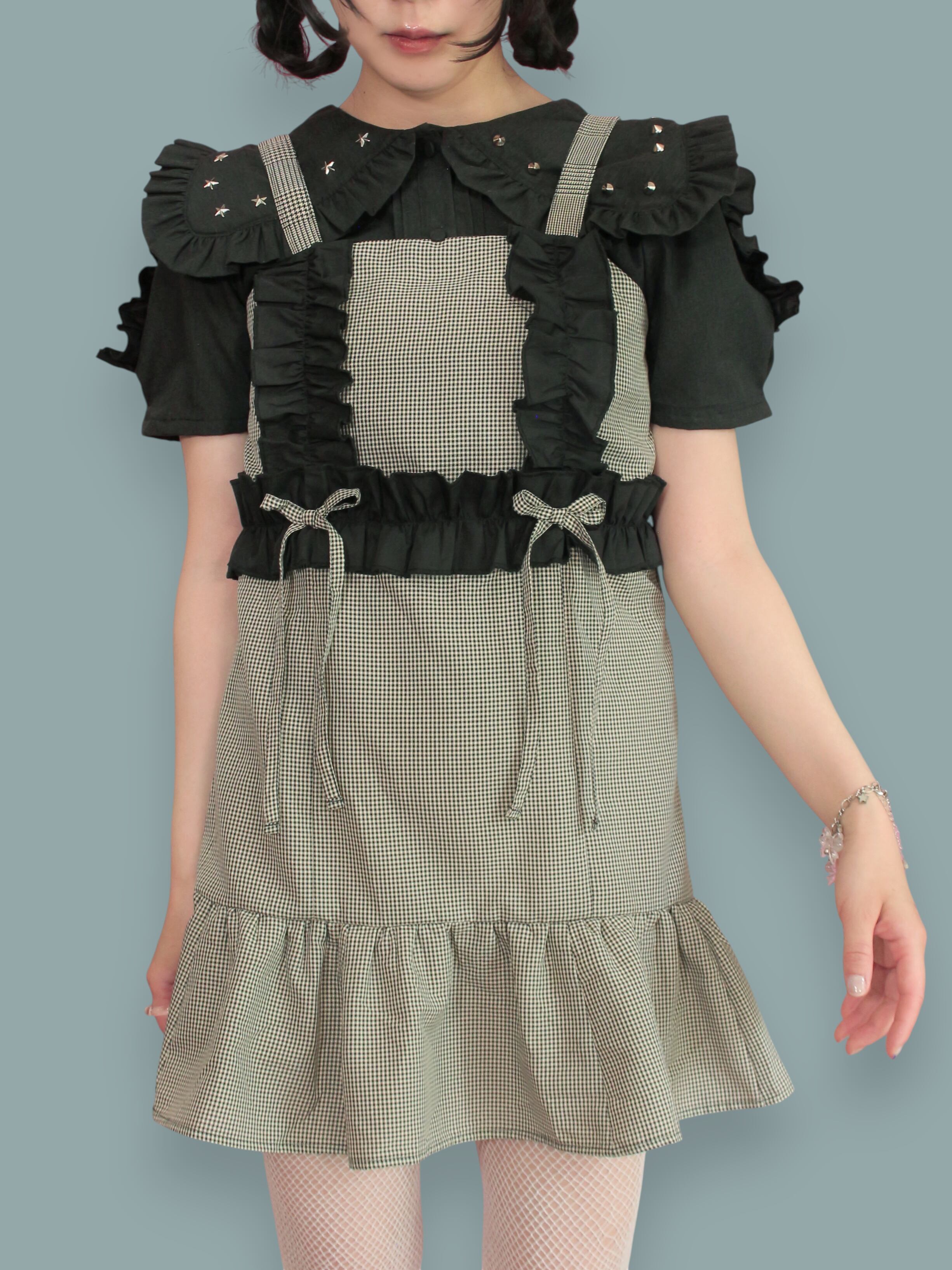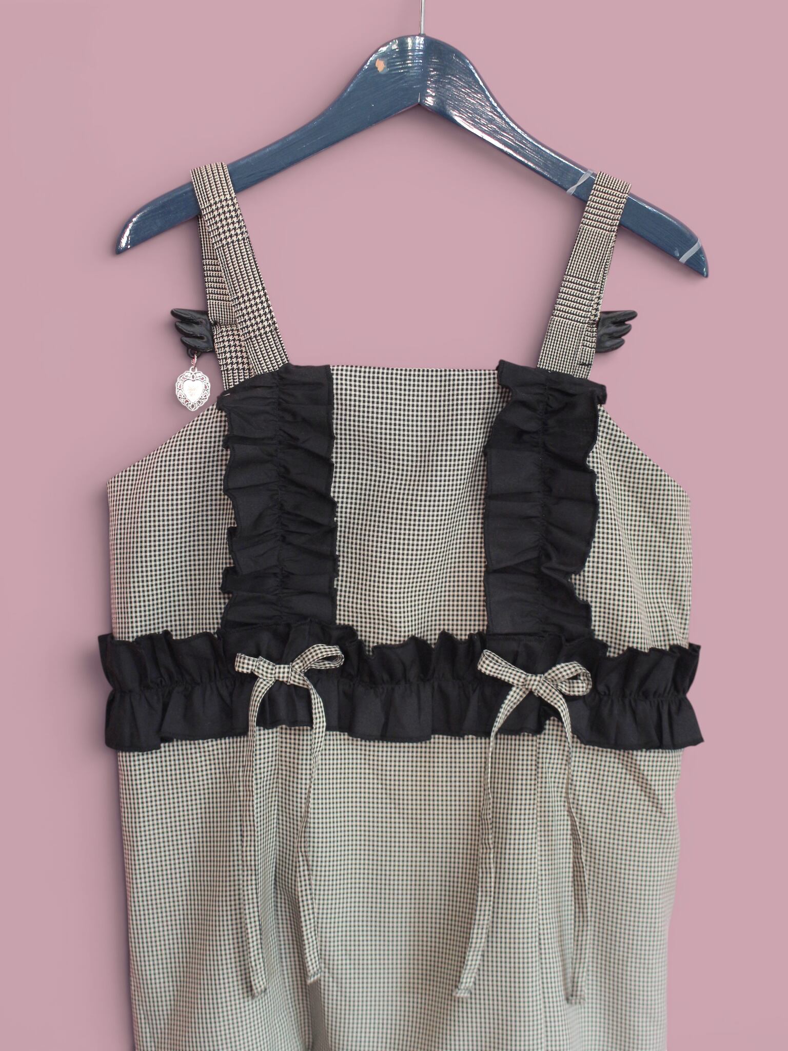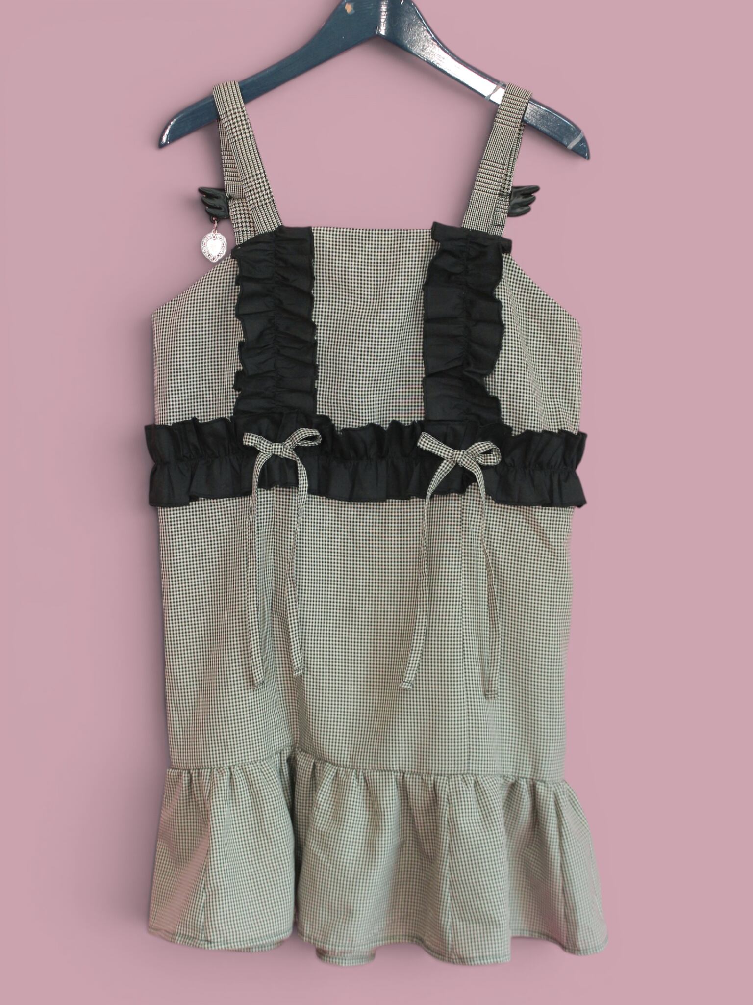 リボンと羽根をモチーフにしたオリジナルパーツを使用したチェックのミニワンピです。