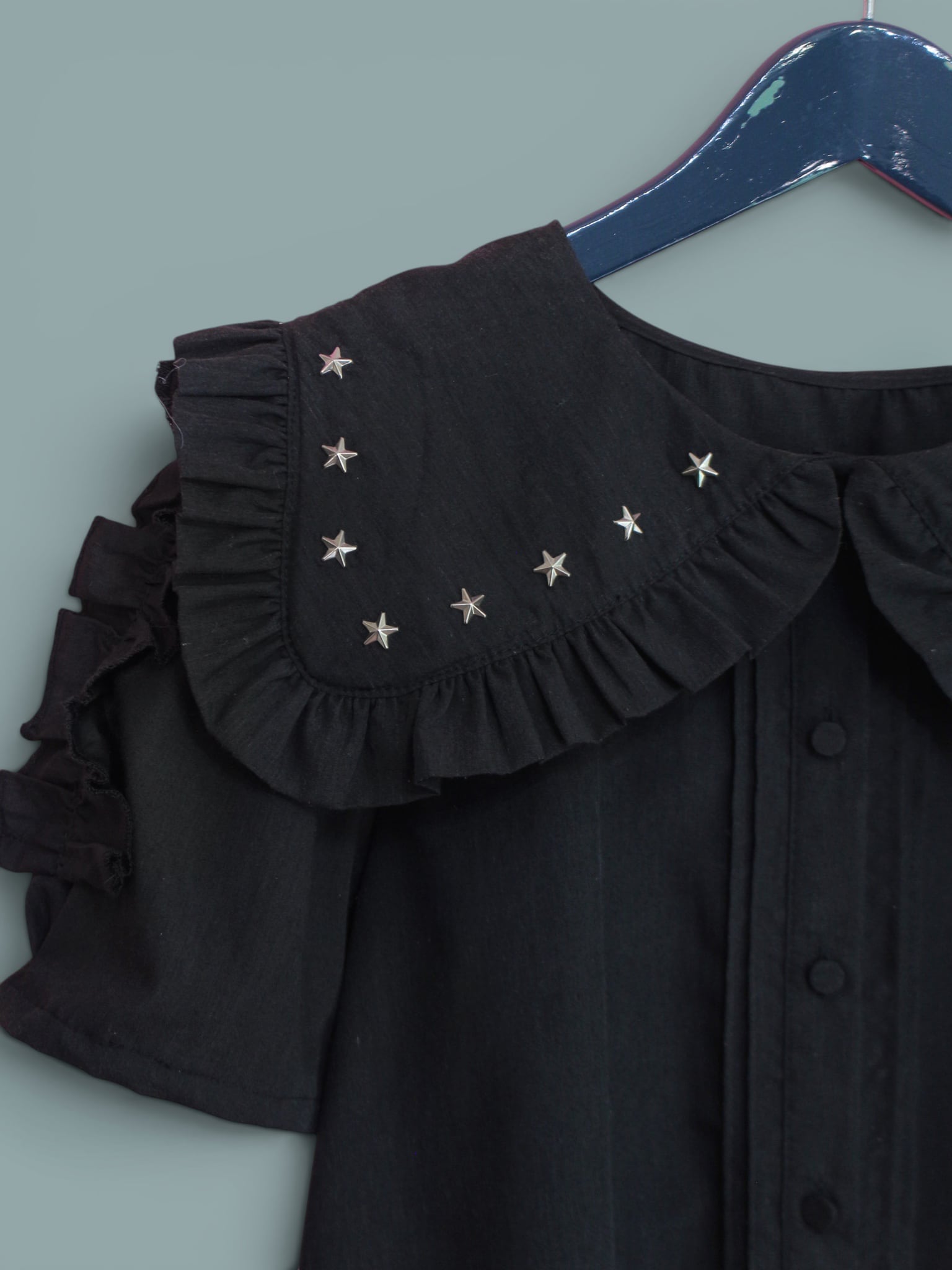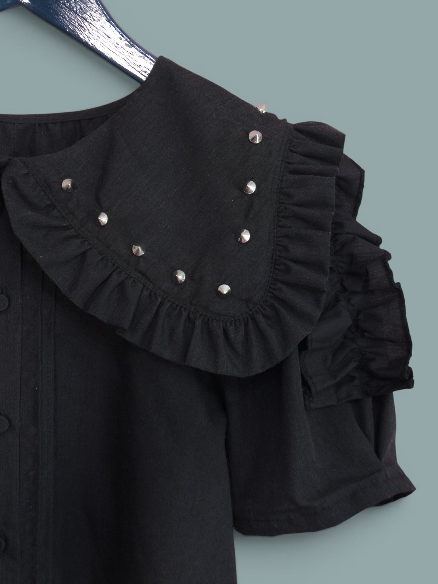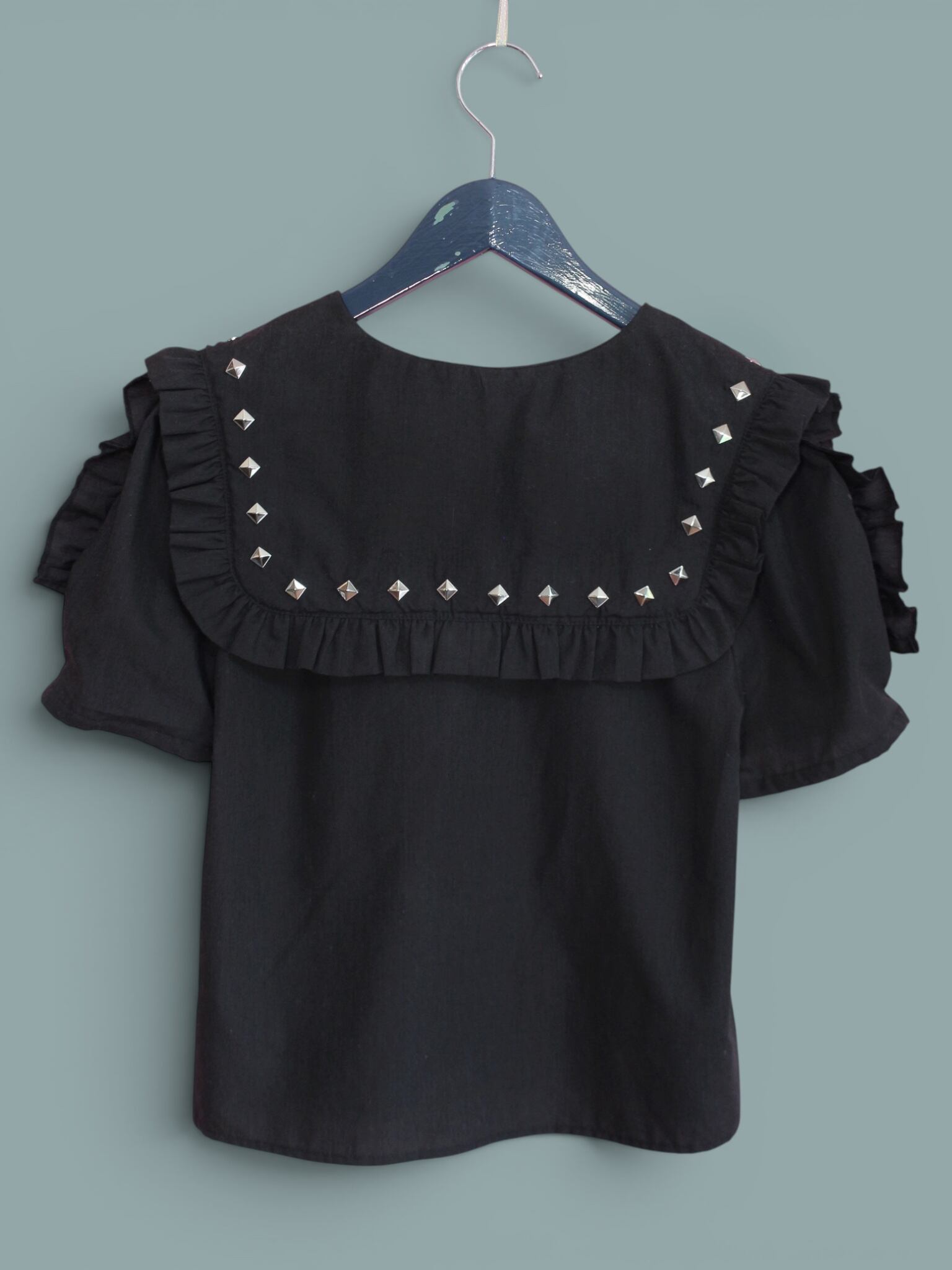 2種類のスタッズ使いとフリルのボリュームがかわいい半袖ブラウスです。