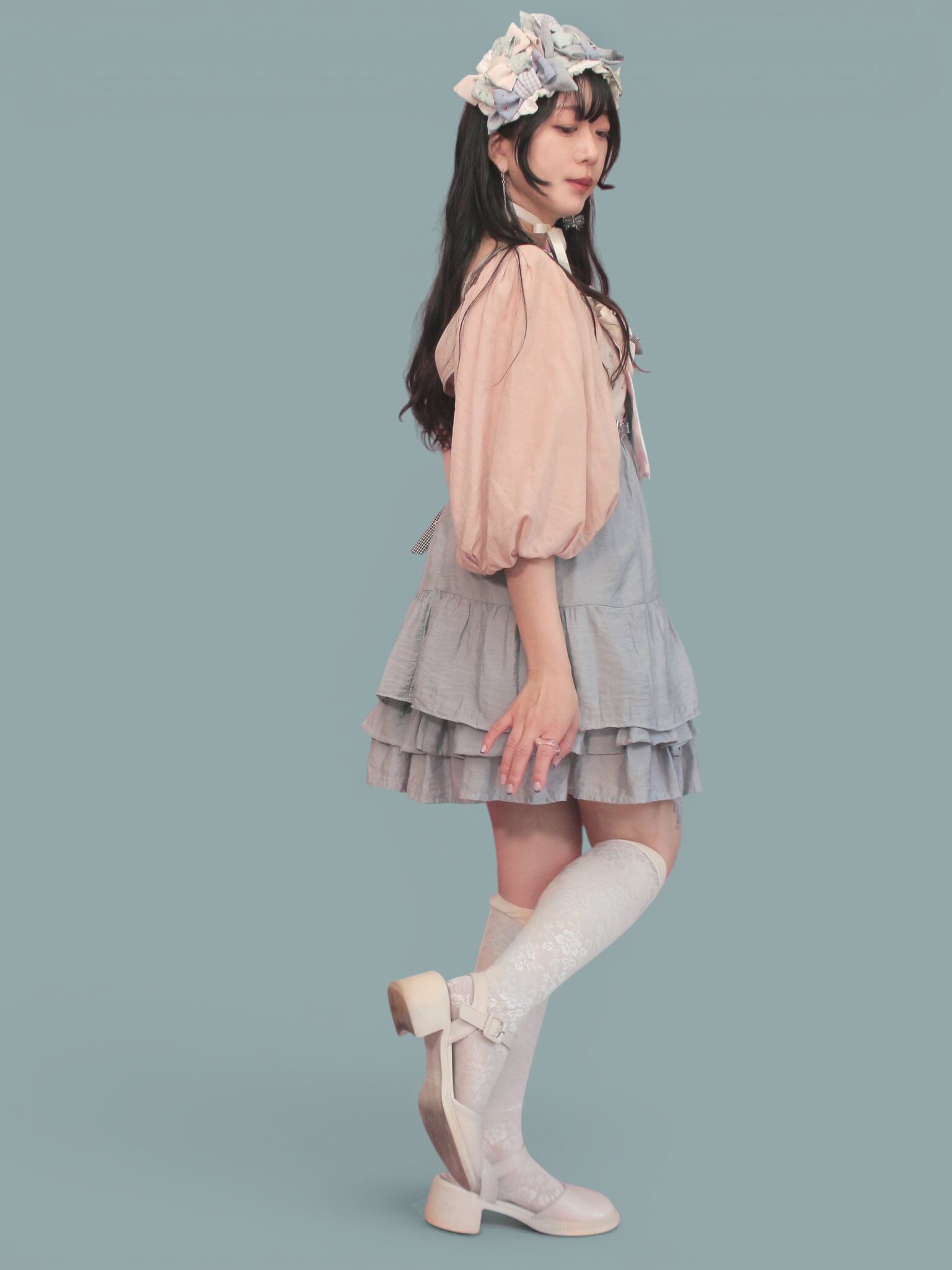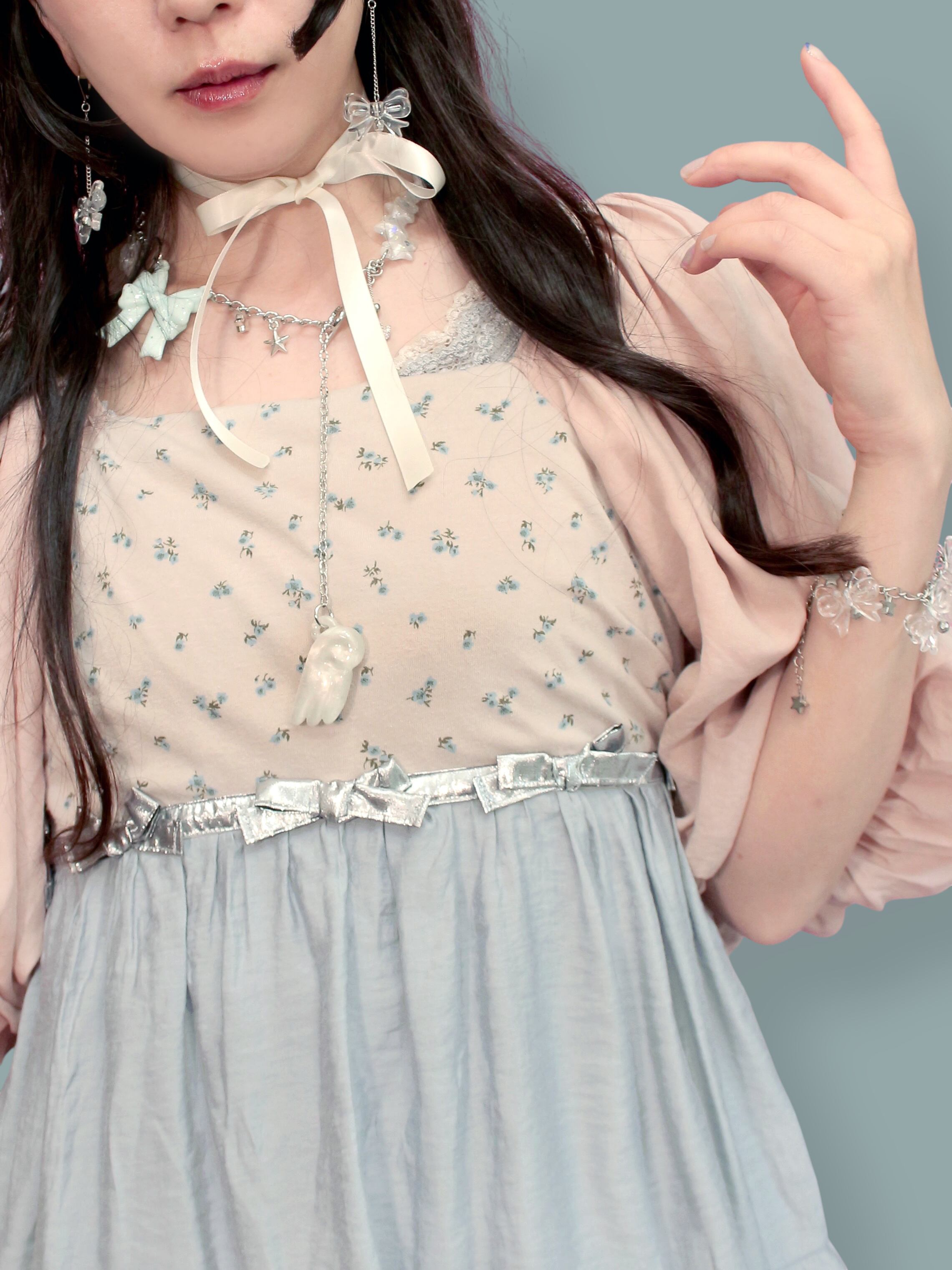 着丈は一枚で着ると短いので、下にお手持ちのスカートやショートパンツ、デニムなどを合わせてください。
