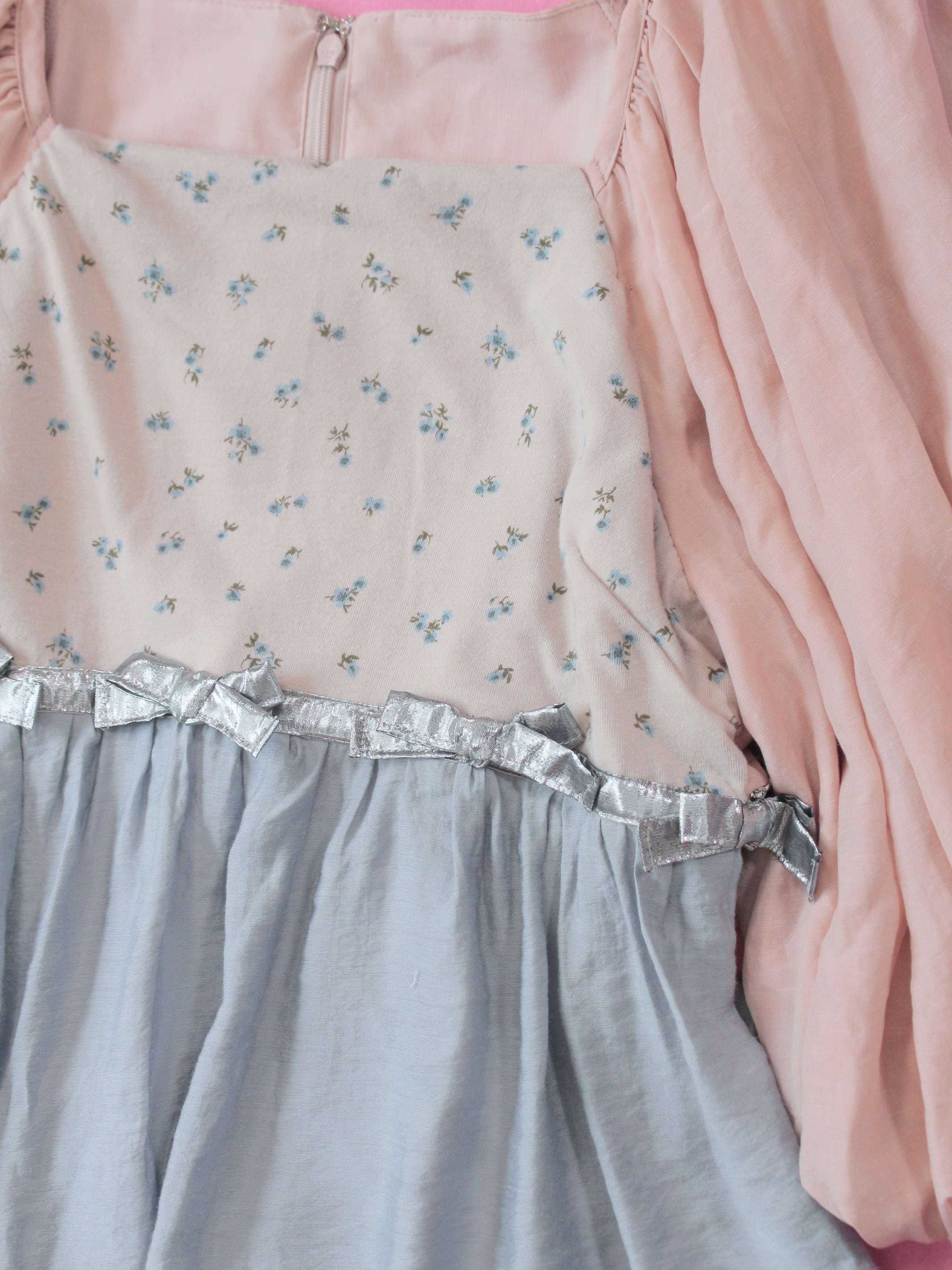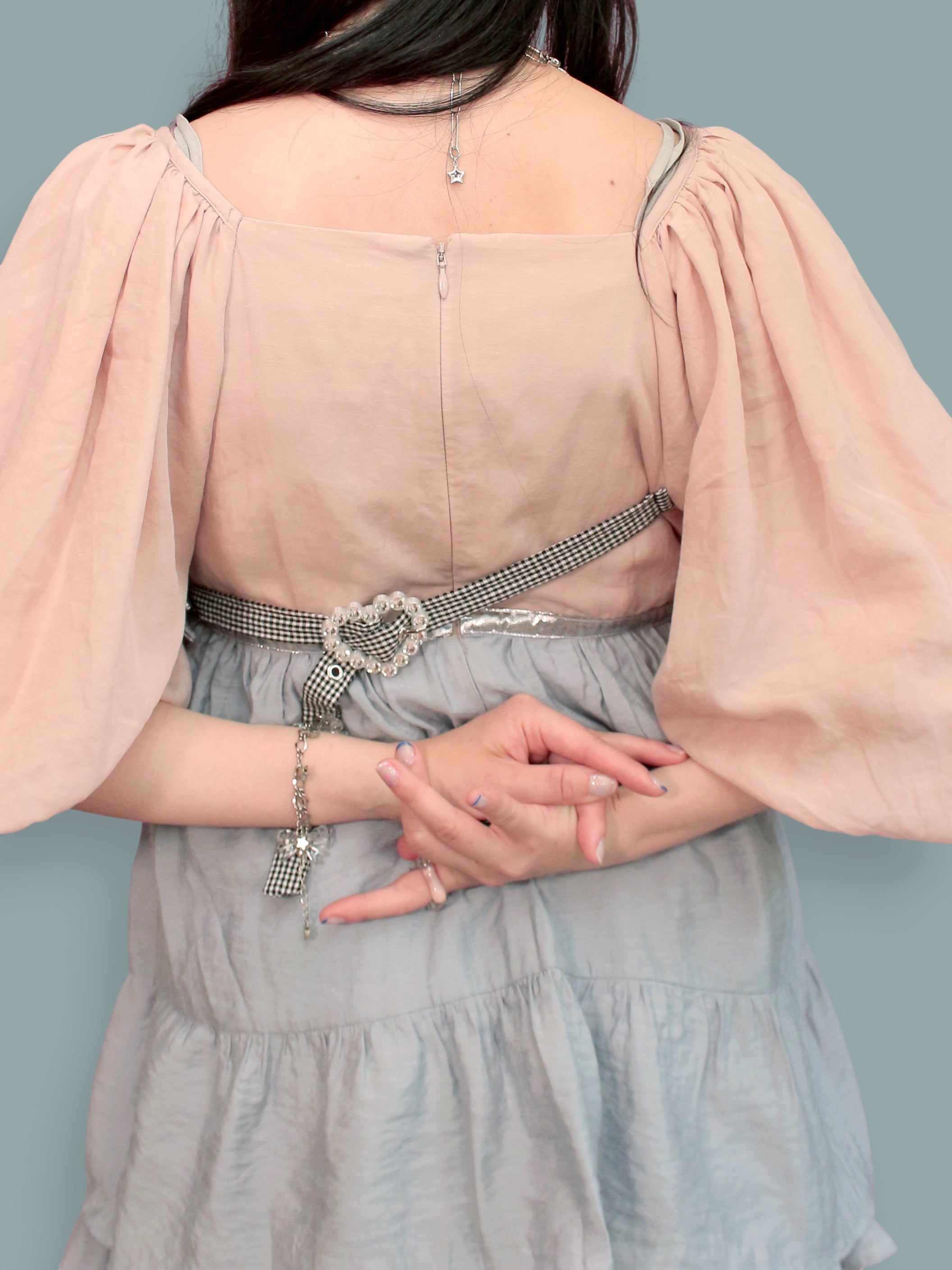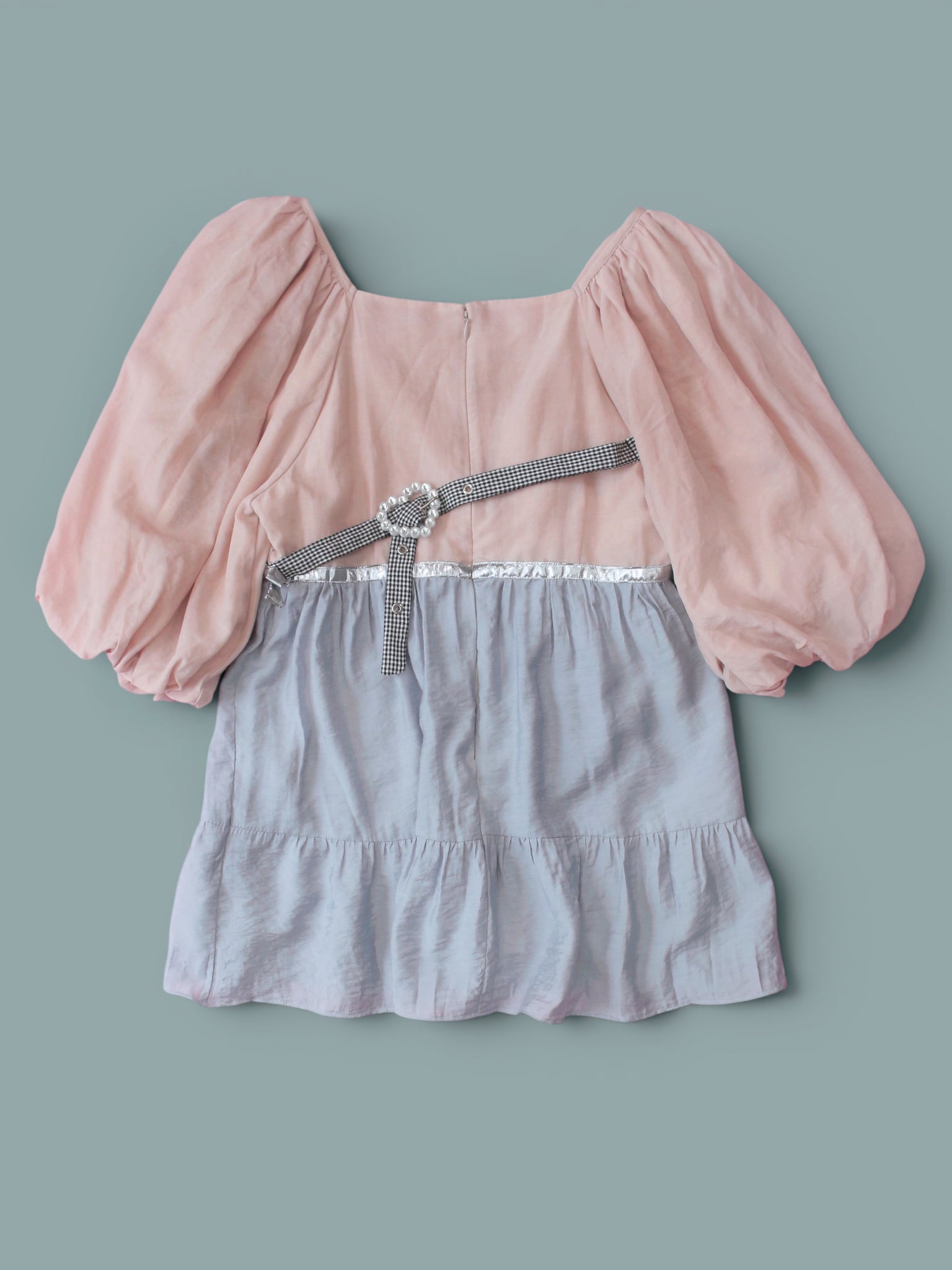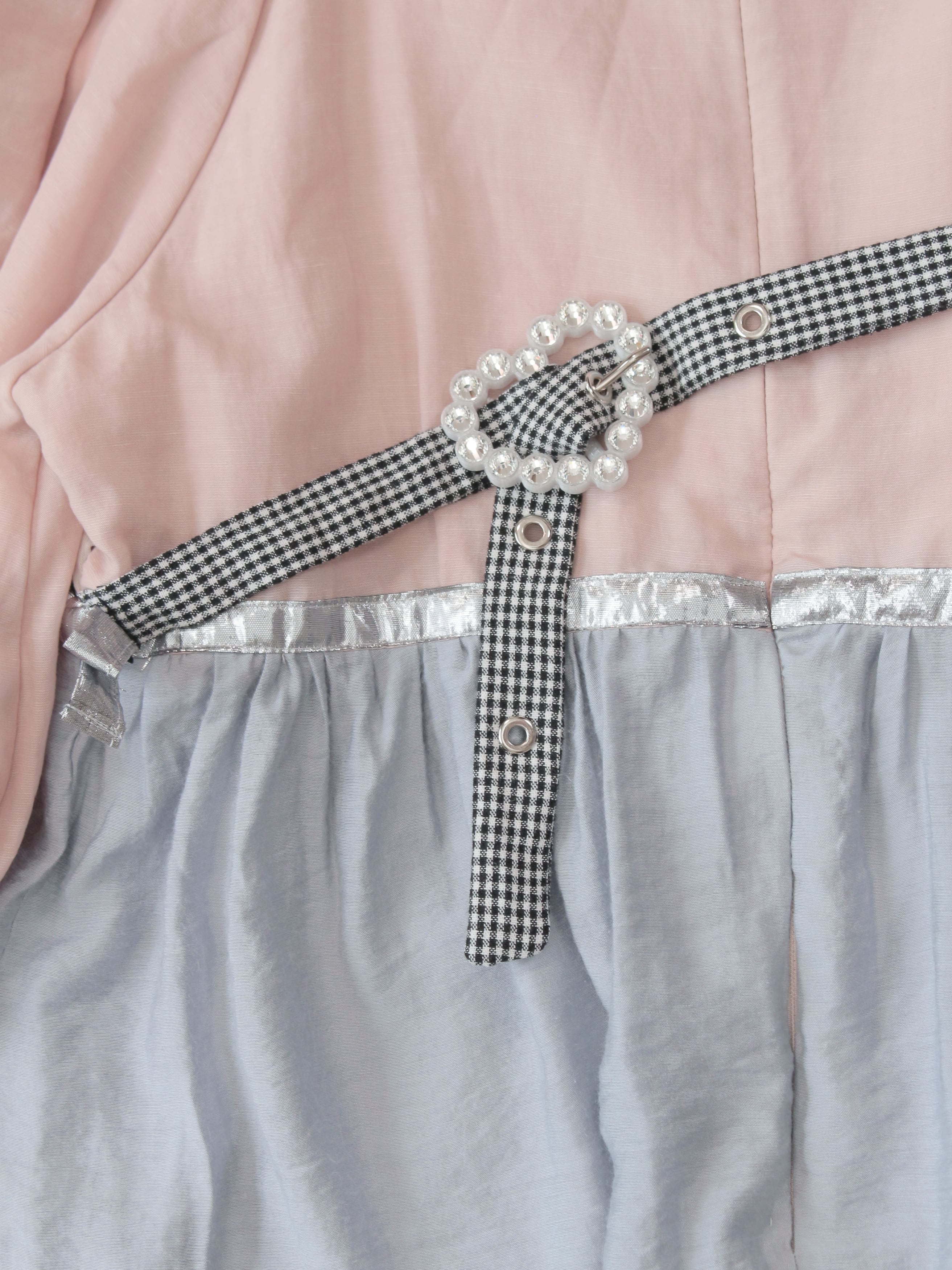 3着もの古着を組み合わせ、半透明なハートのオリジナルバックルを組み合わせたミニドレスです。