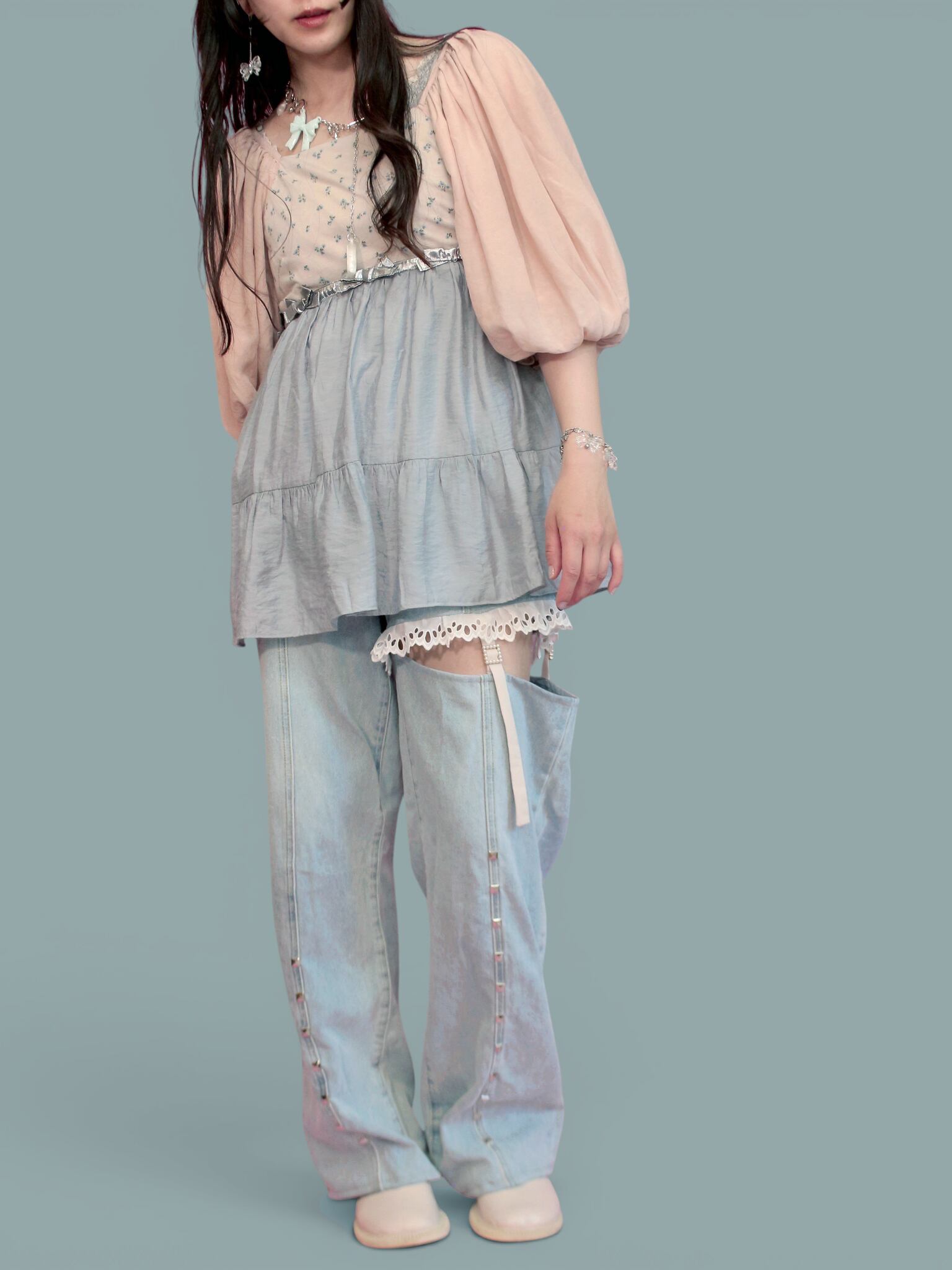 スタイリングでは”gifted girl” set-upのボトムを合わせていますが、最後の2枚の写真はショートパンツ、デニム合わせです。