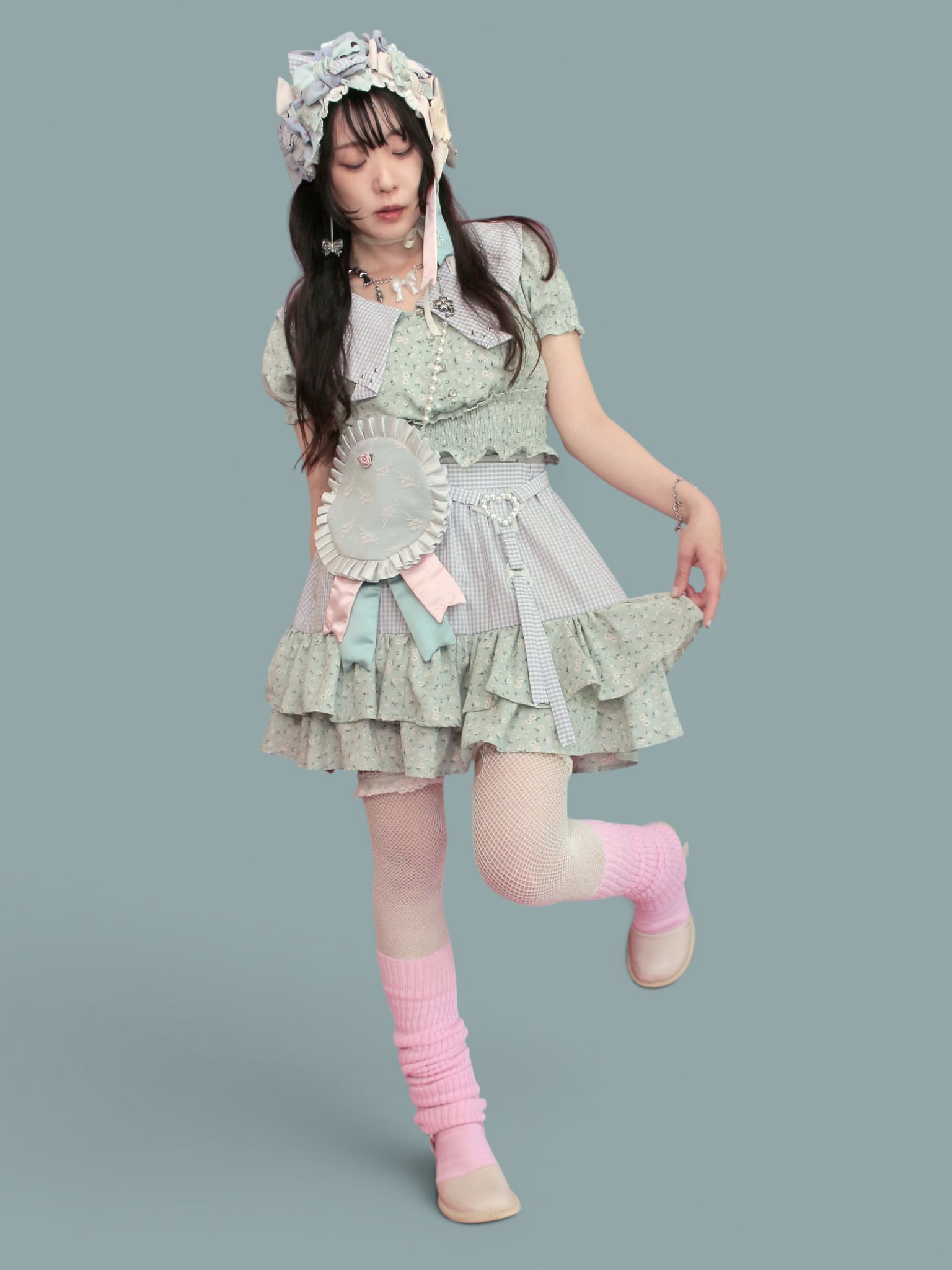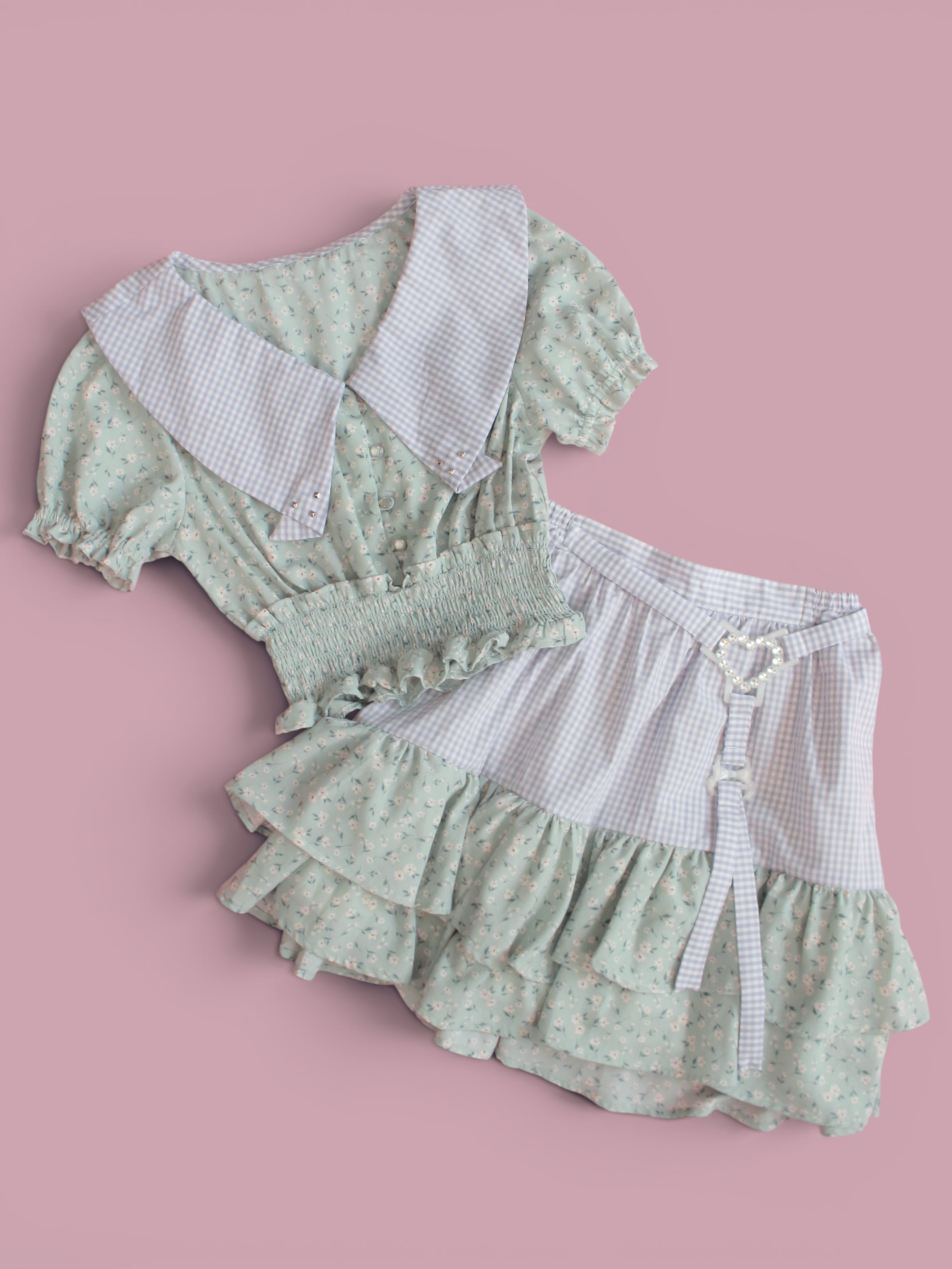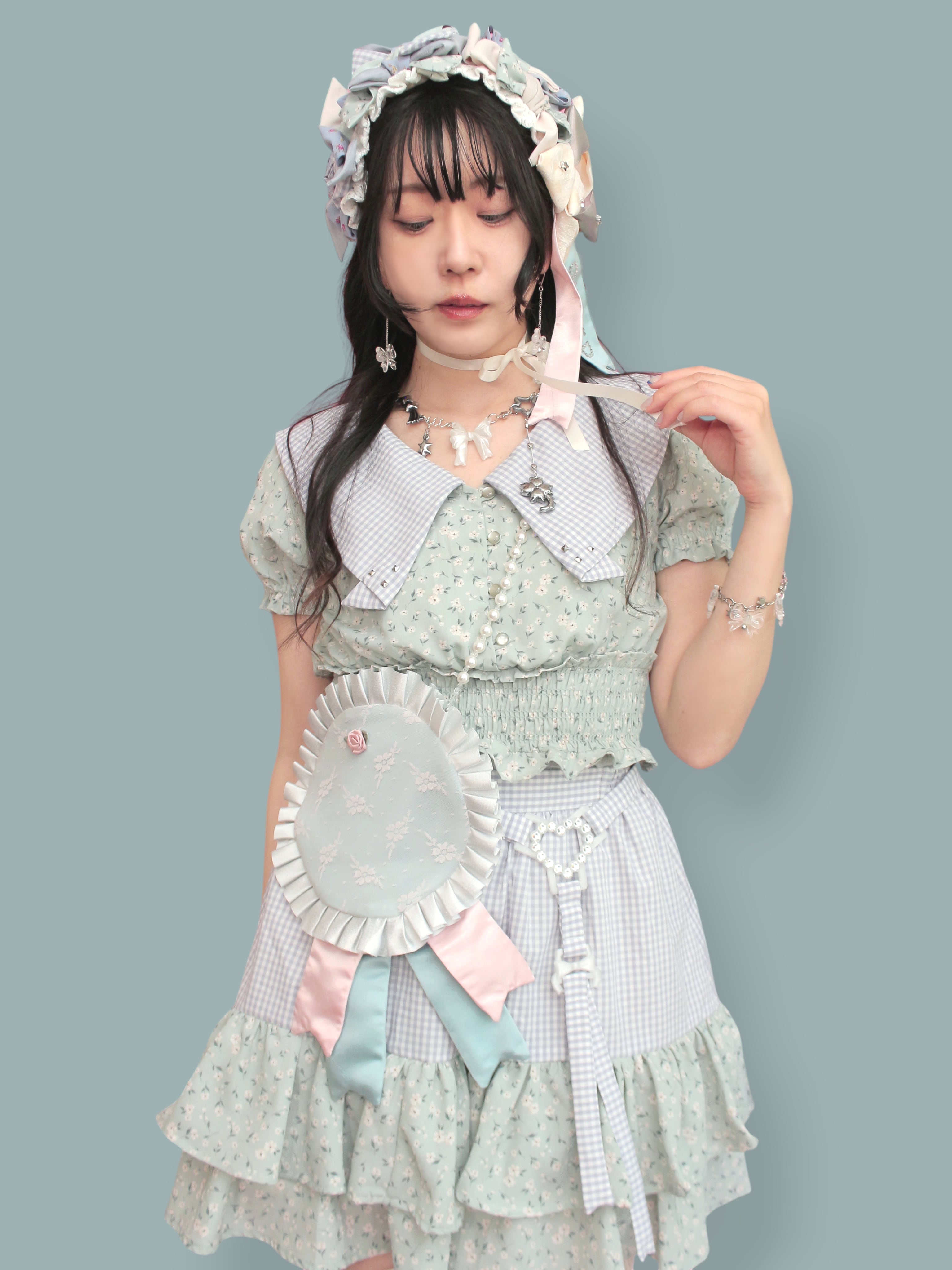 淡いグリーンの小花柄にラベンダーのチェックと、半透明なオリジナルパーツを組み合わせたセットアップです。