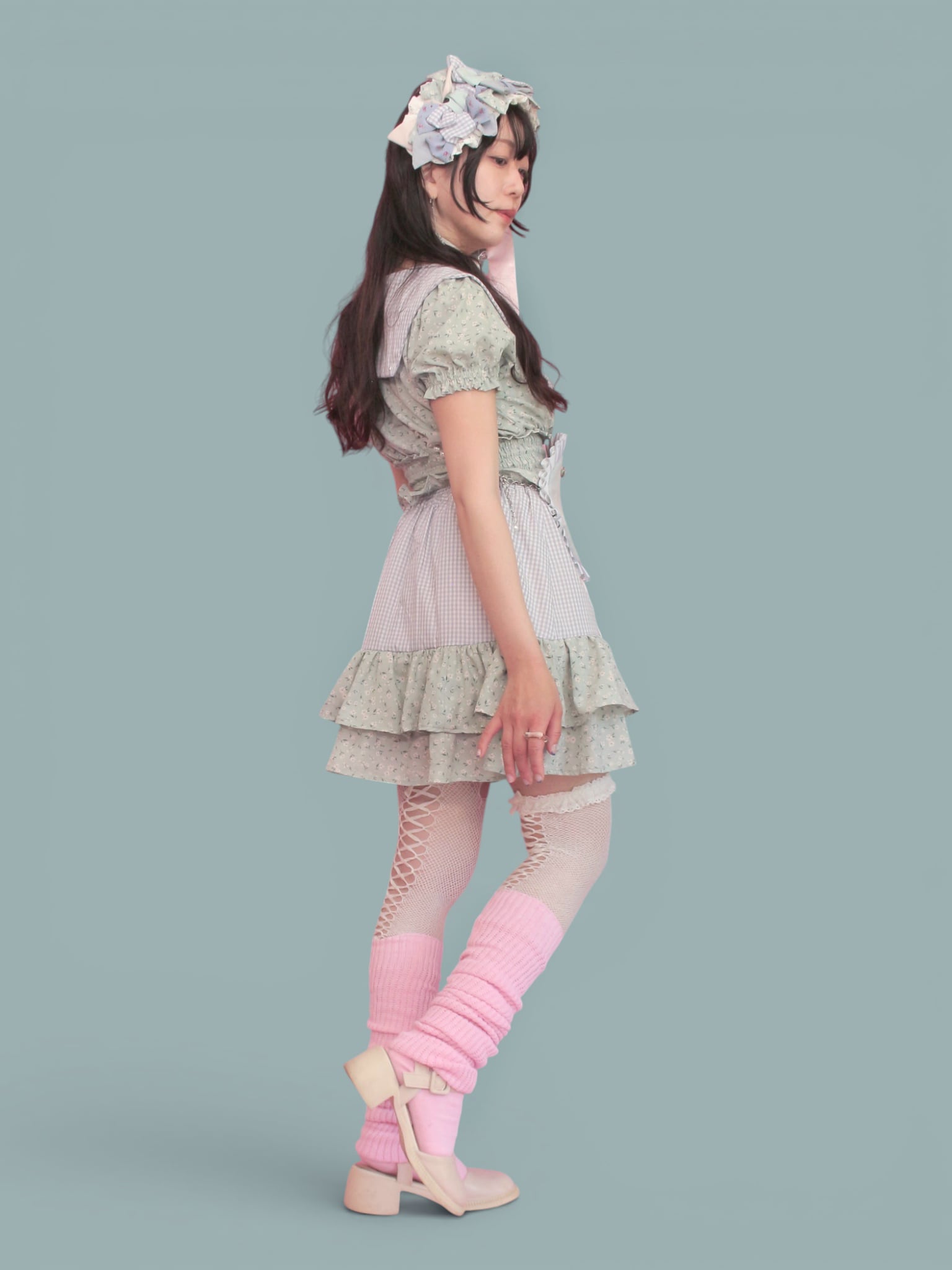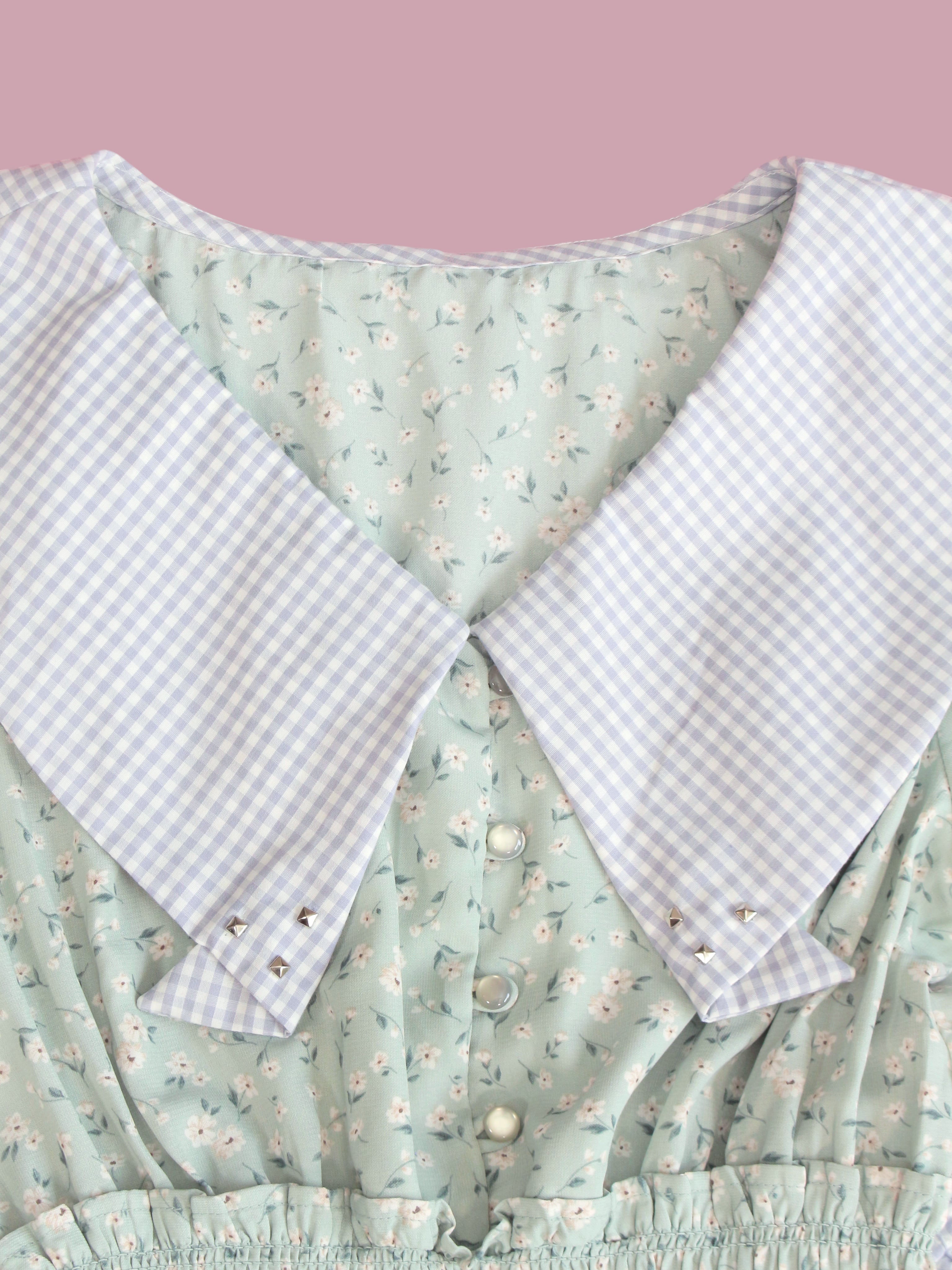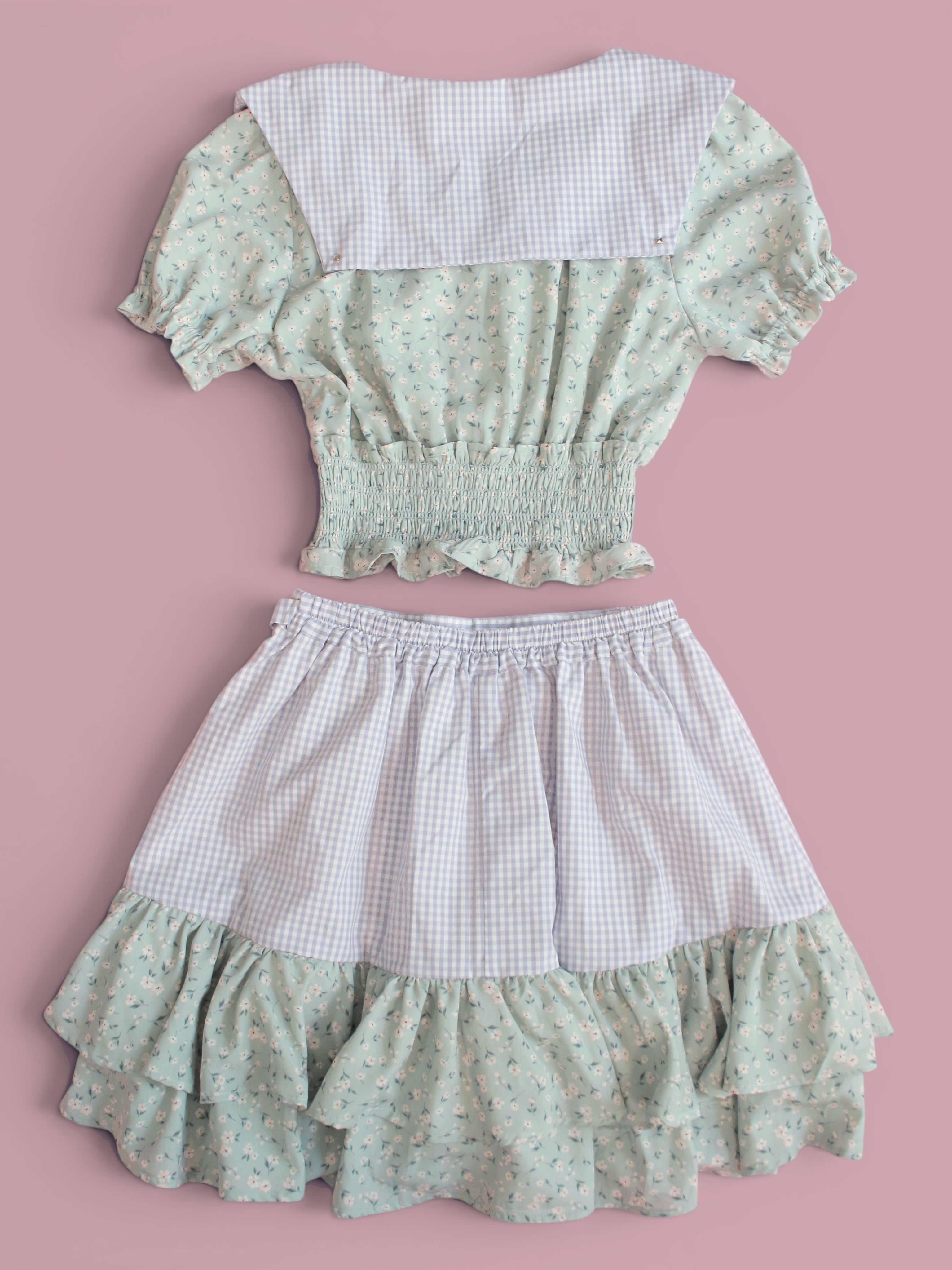 淡いグリーンの小花柄にラベンダーのチェックと、半透明なオリジナルパーツを組み合わせたセットアップです。