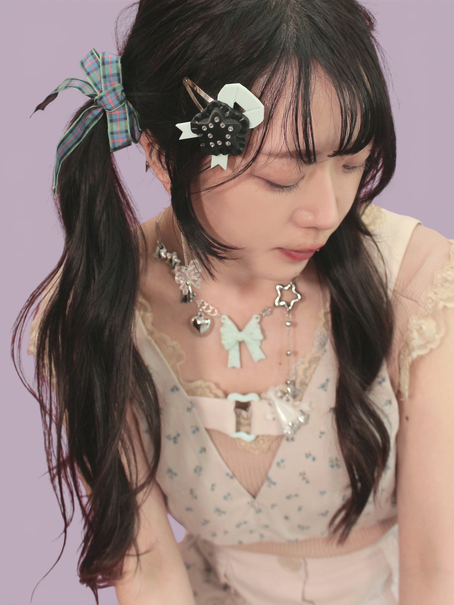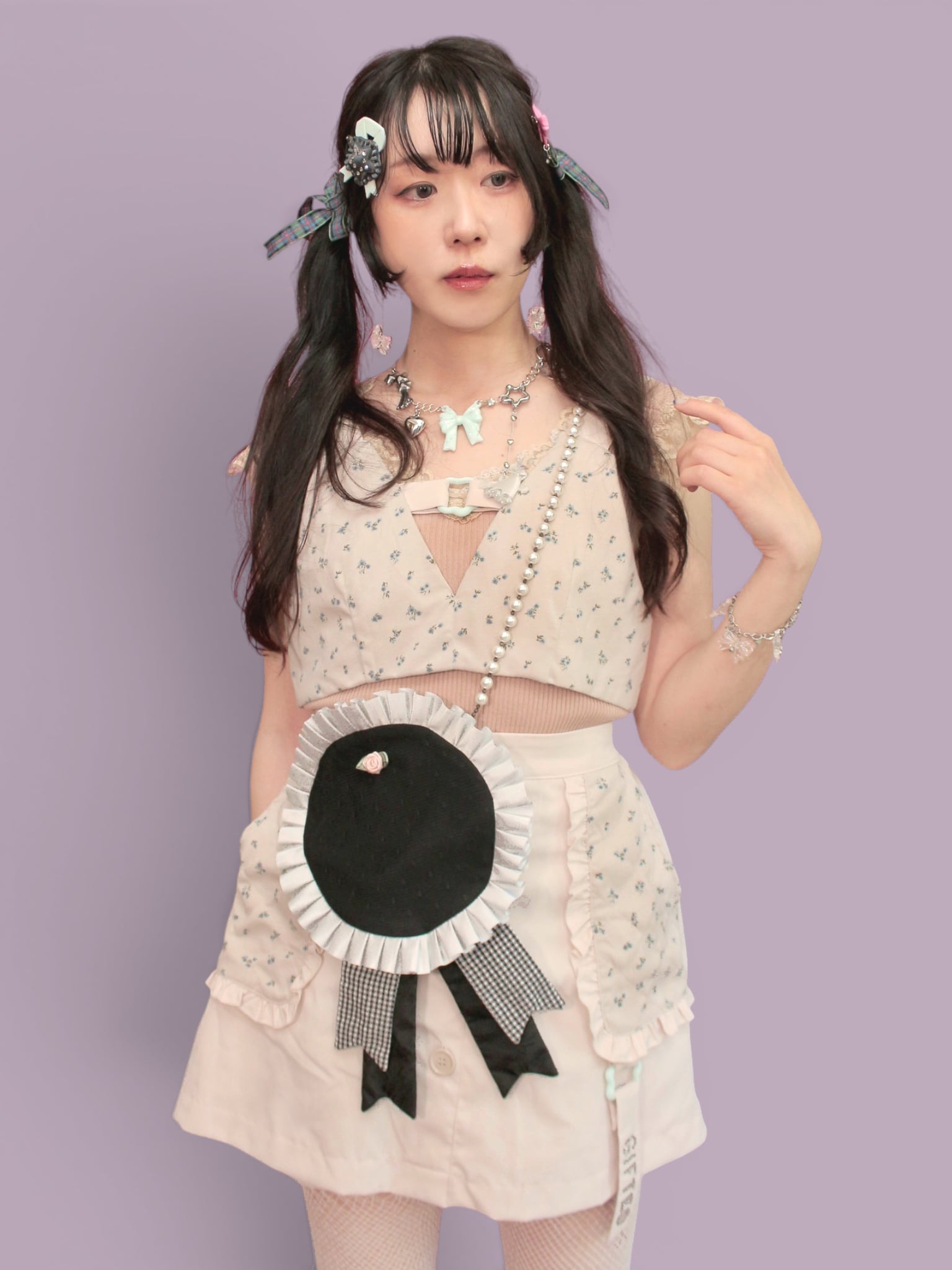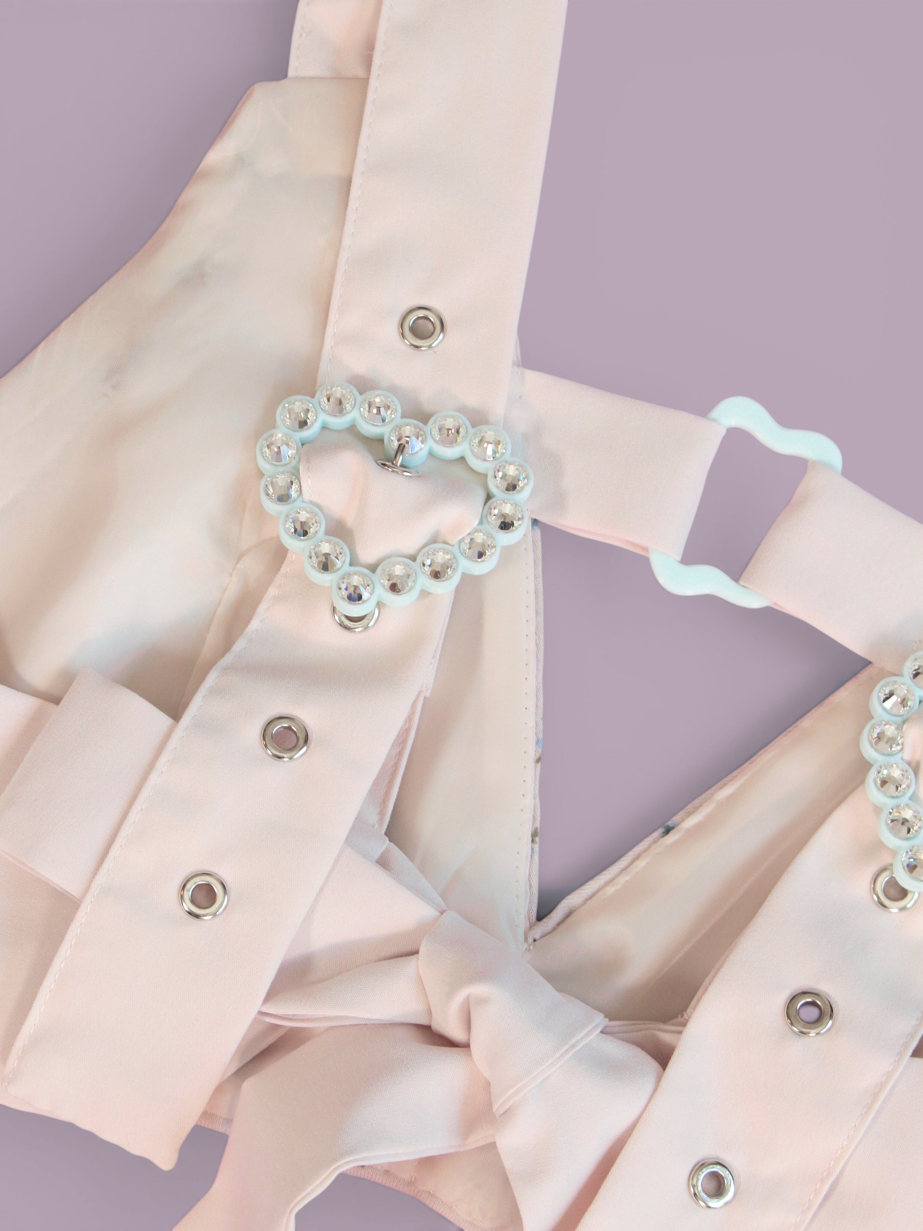 トップスの真ん中についている「歪み」をモチーフにしたパーツや、後ろのハートのバックルはオリジナルです。色がほんとうに絶妙なかわいさで、一見水色のようでいて、ほんのりミントっぽさもある色合い。