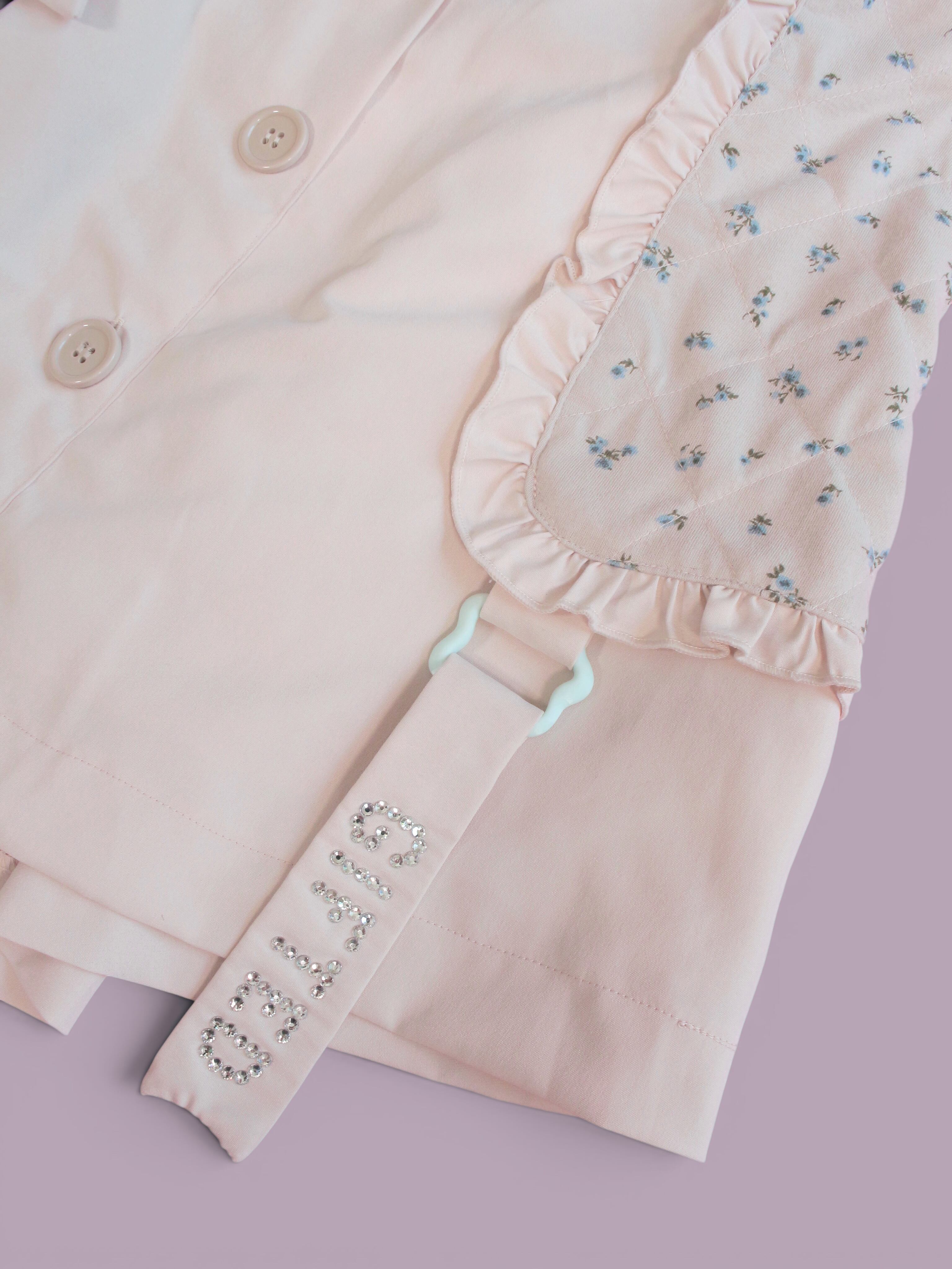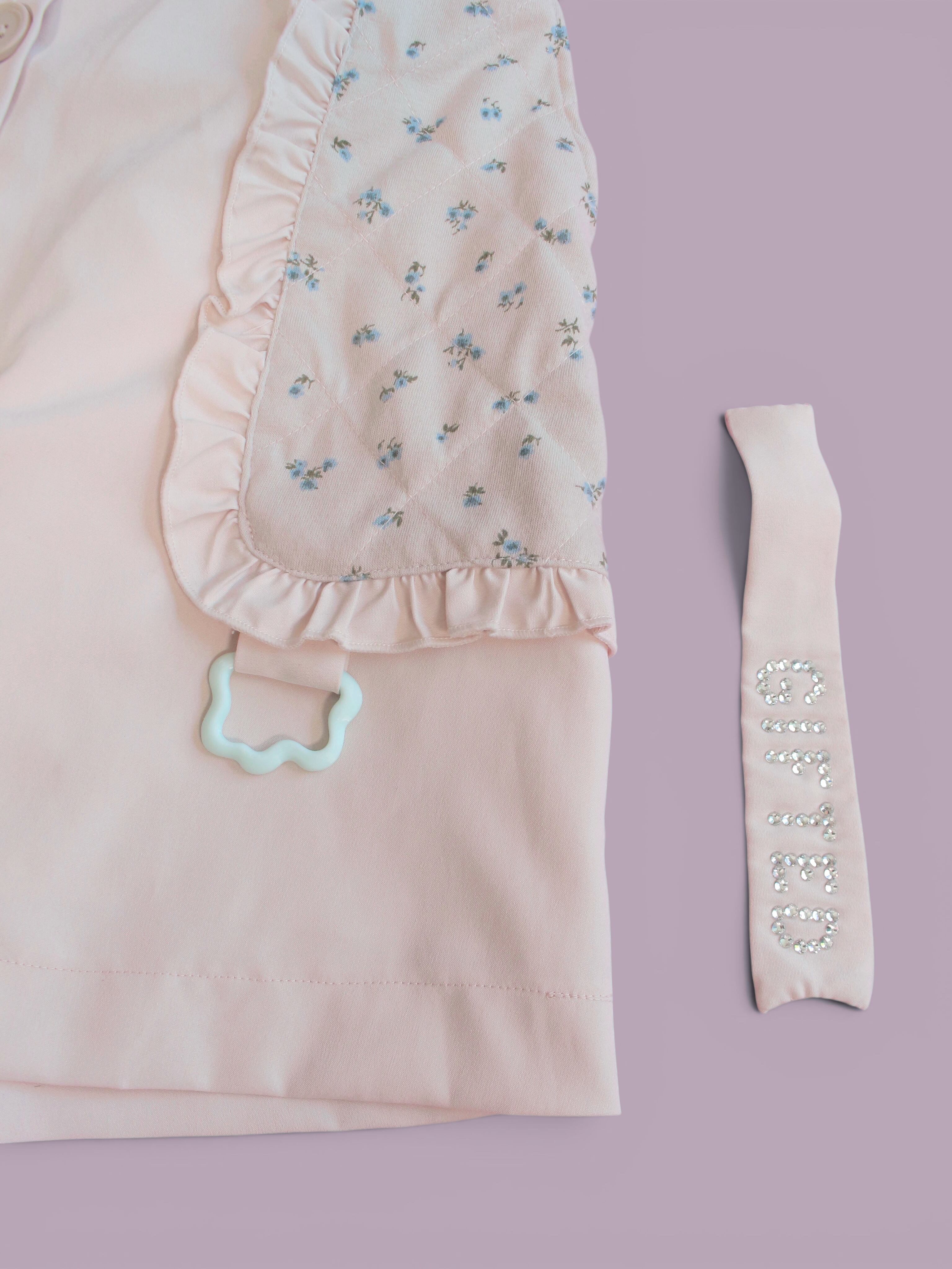 淡い小花とくすみピンクにオリジナルパーツを組み合わせたセットアップです。